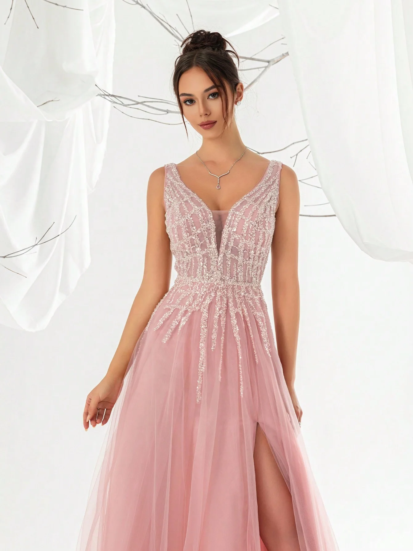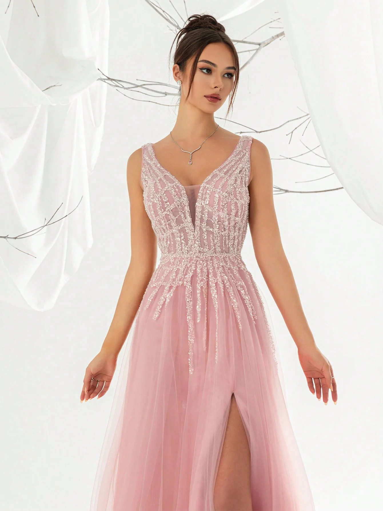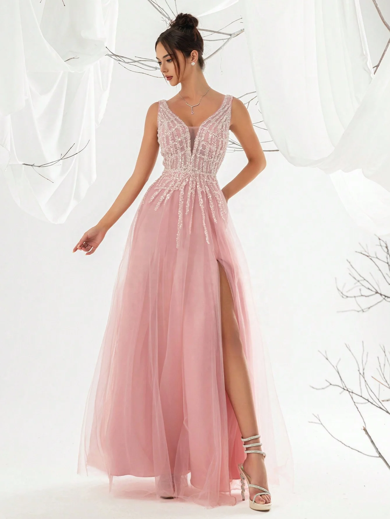 Vintage Baby Pink Chiffon Evening Dress for Girls Empire Waist A-Line Floor Length Slit V-Neck Spaghetti Strap Petal Solid