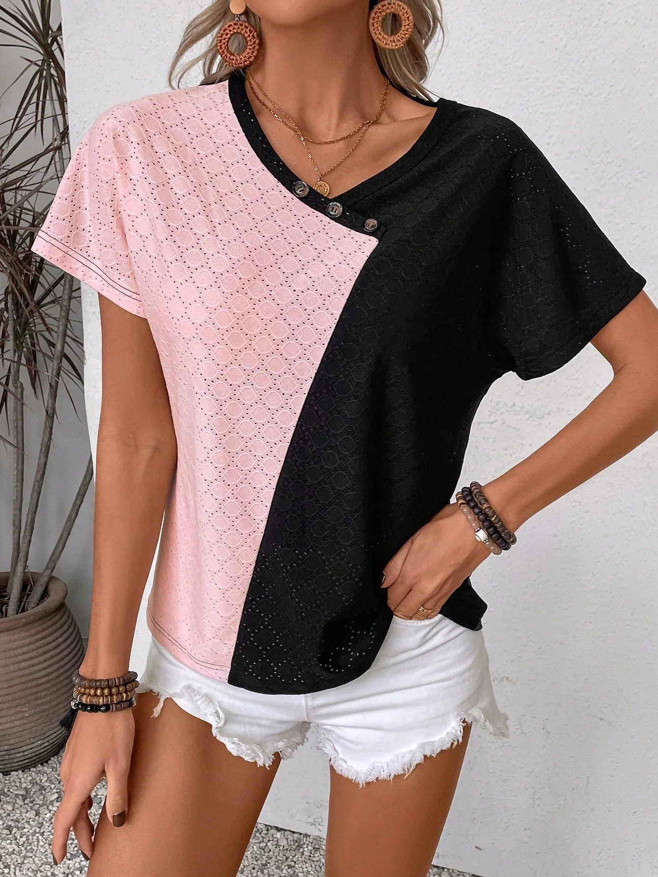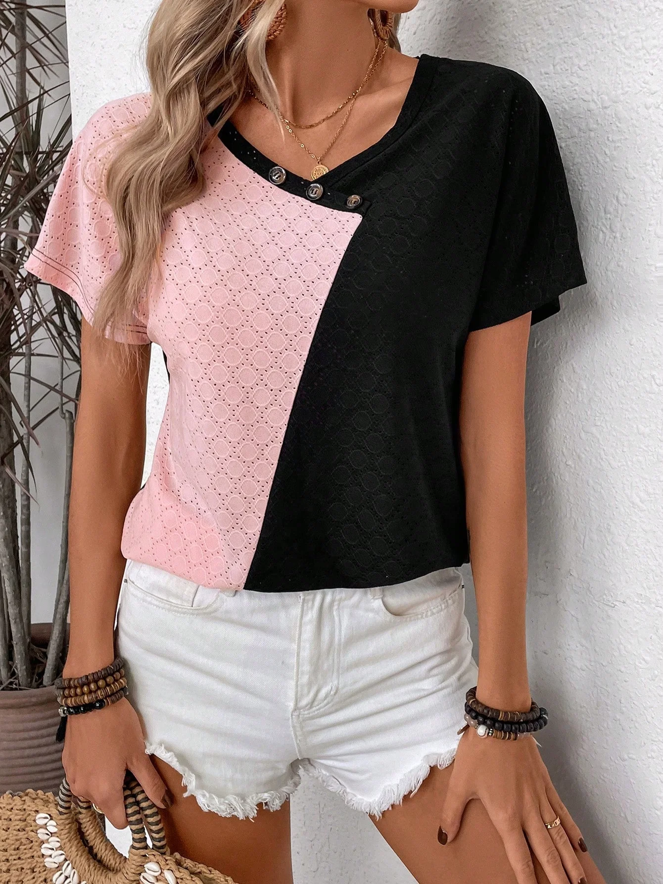 Women's Custom Designed Pink Black Color Blocking V Neck Short Wide Sleeve Tee Casual Eco-Friendly Summer Button Decoration