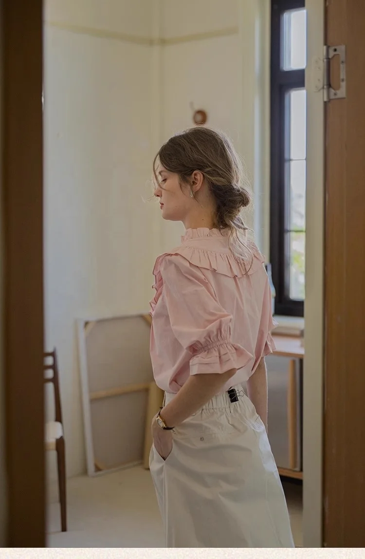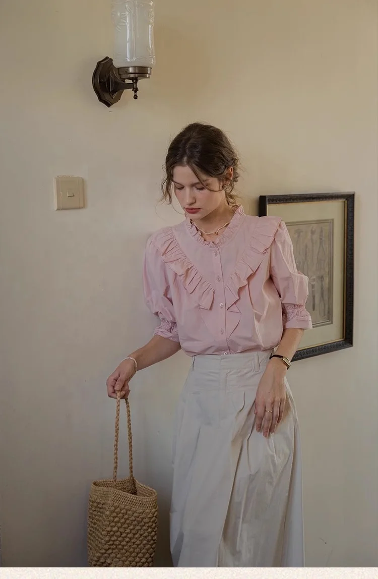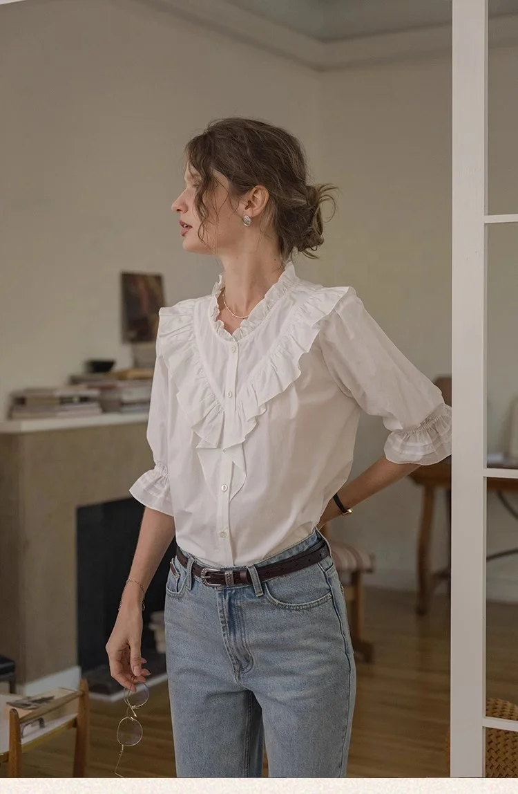Factory Customized Elegant Women's Button-up Crew Neck Vintage Shirt 100% Cotton Spring Summer Collection Ruffle Blouse Solid