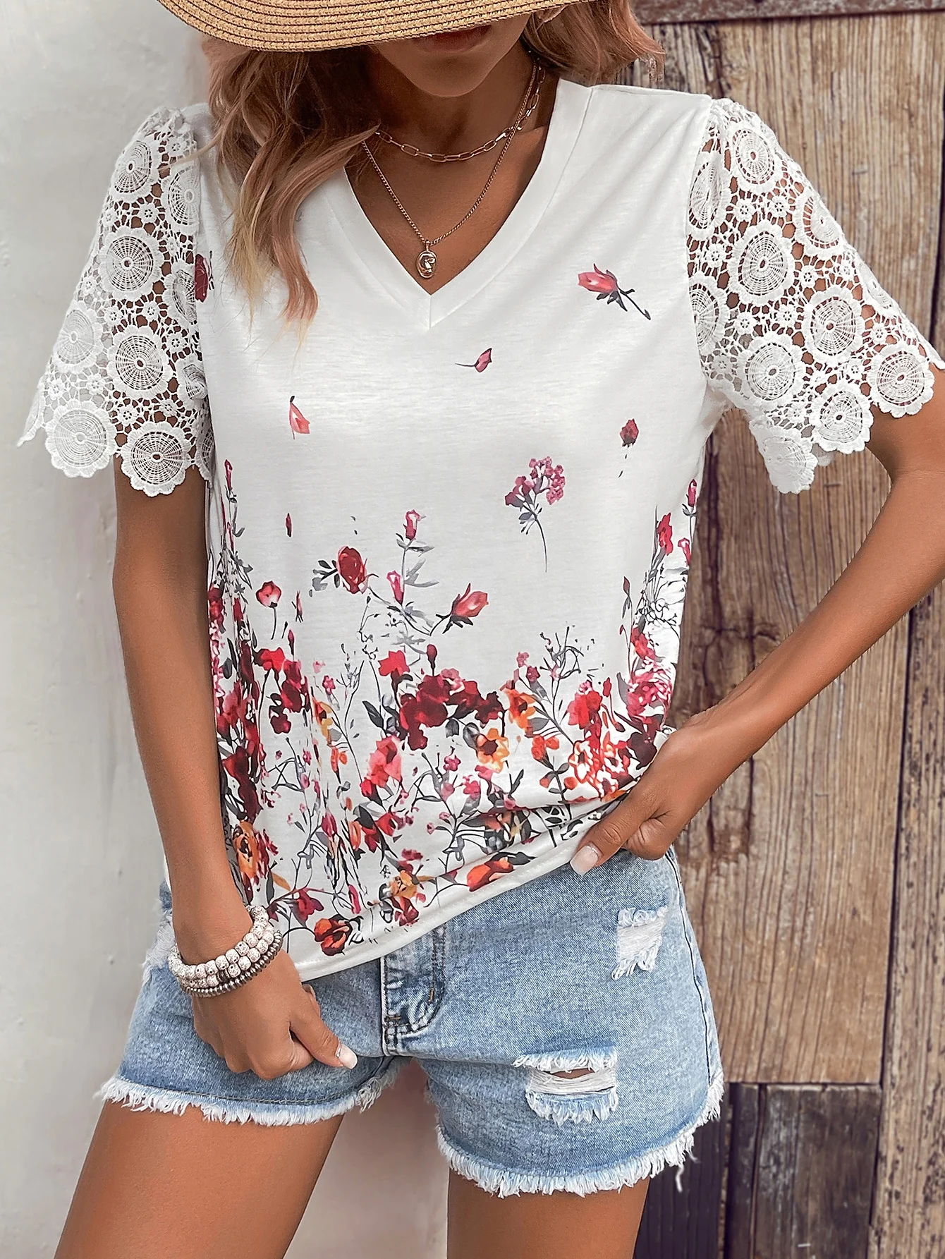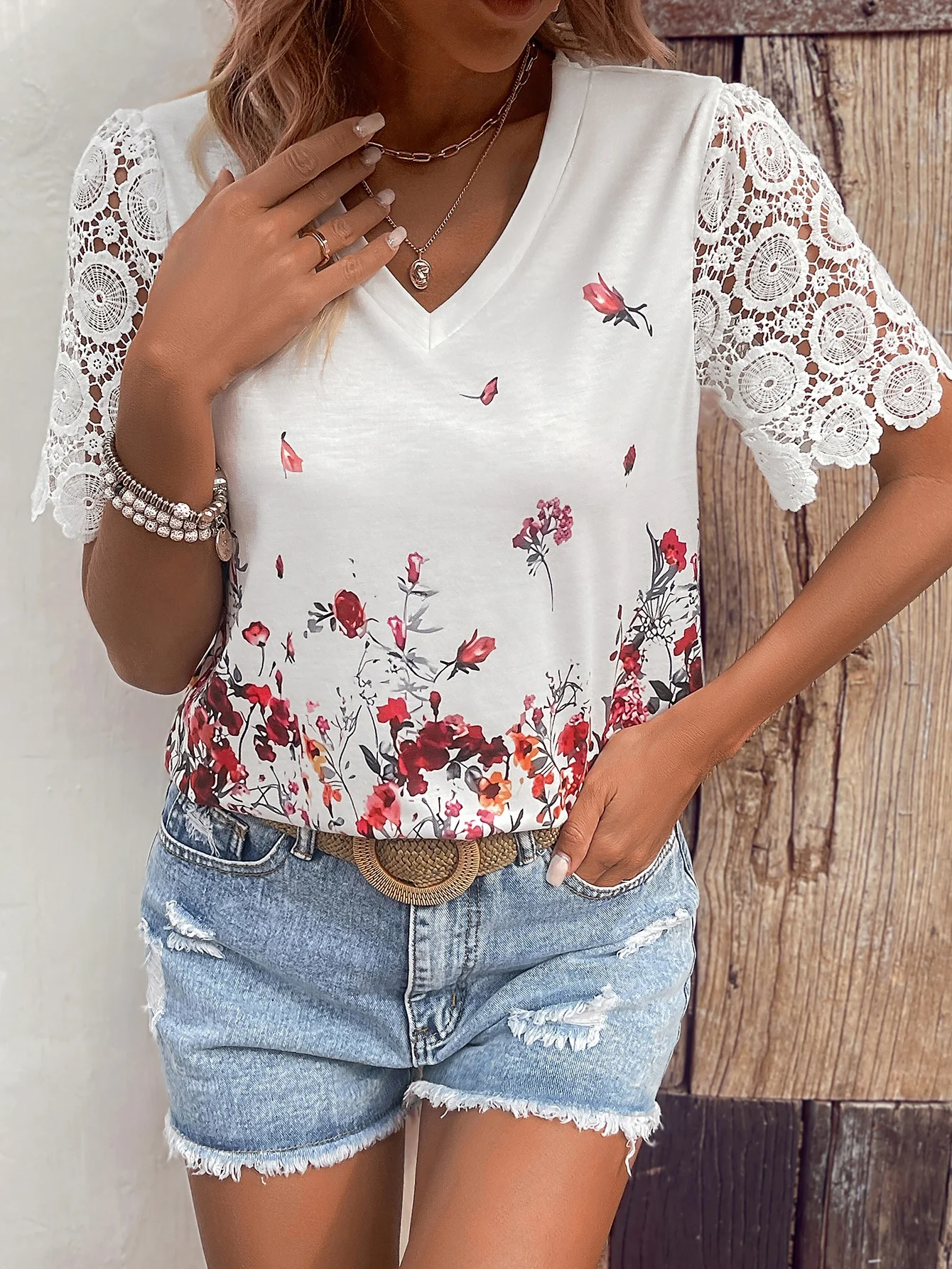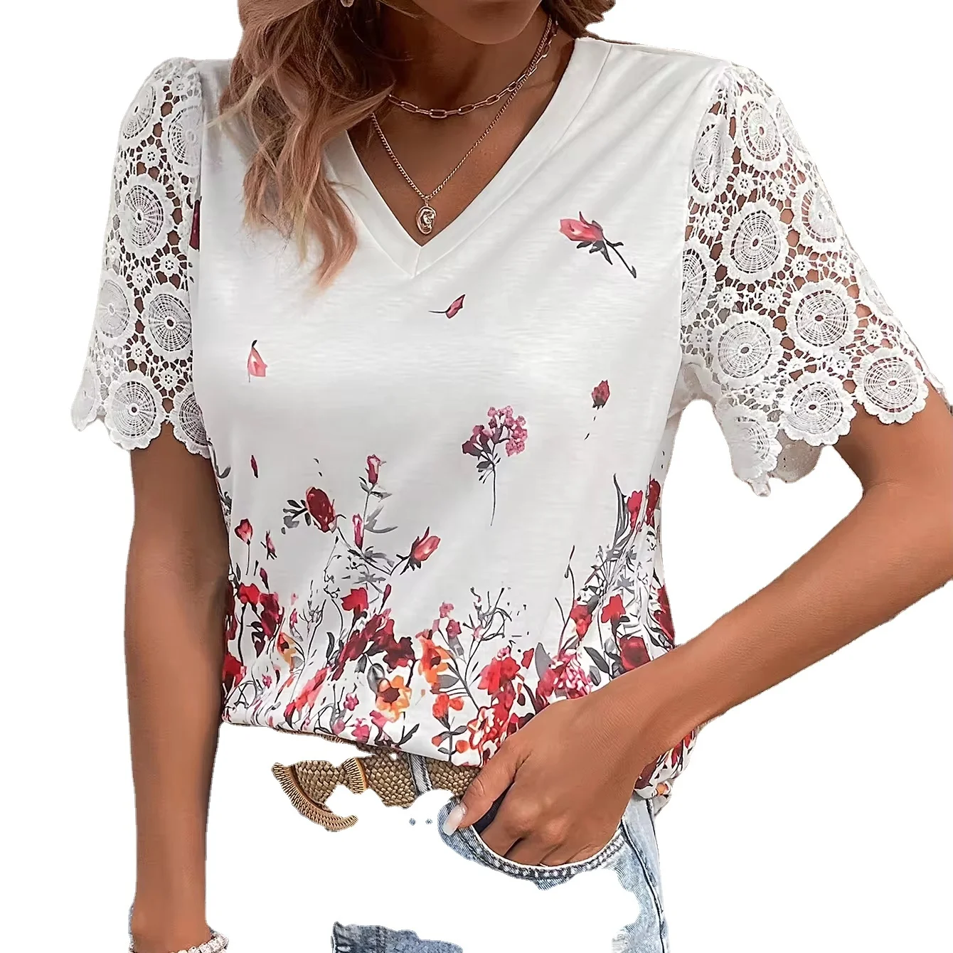 Custom Design Floral Printing V Neck Embroidery Short Sleeve Women's Tee for Summer