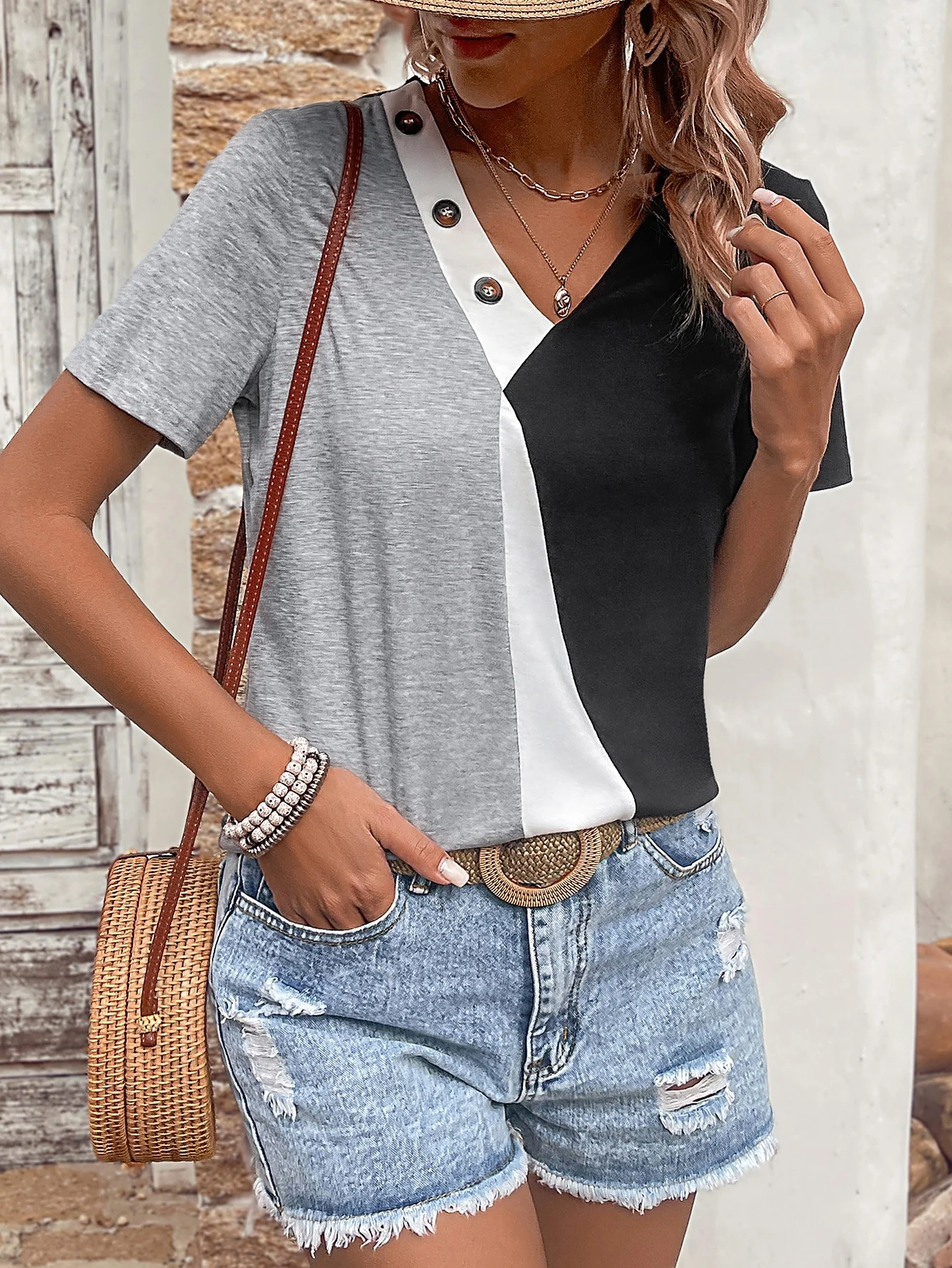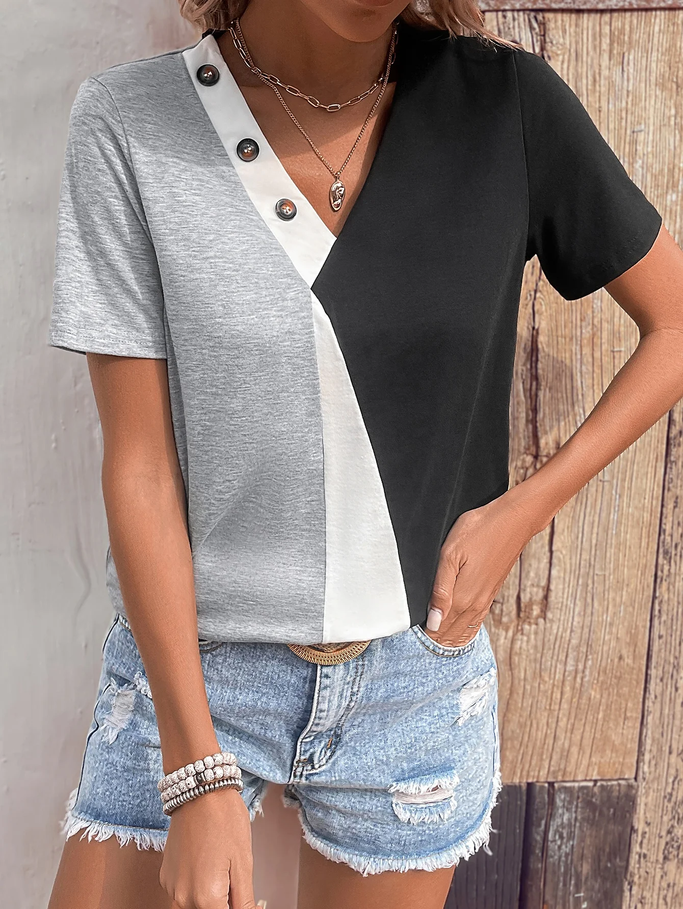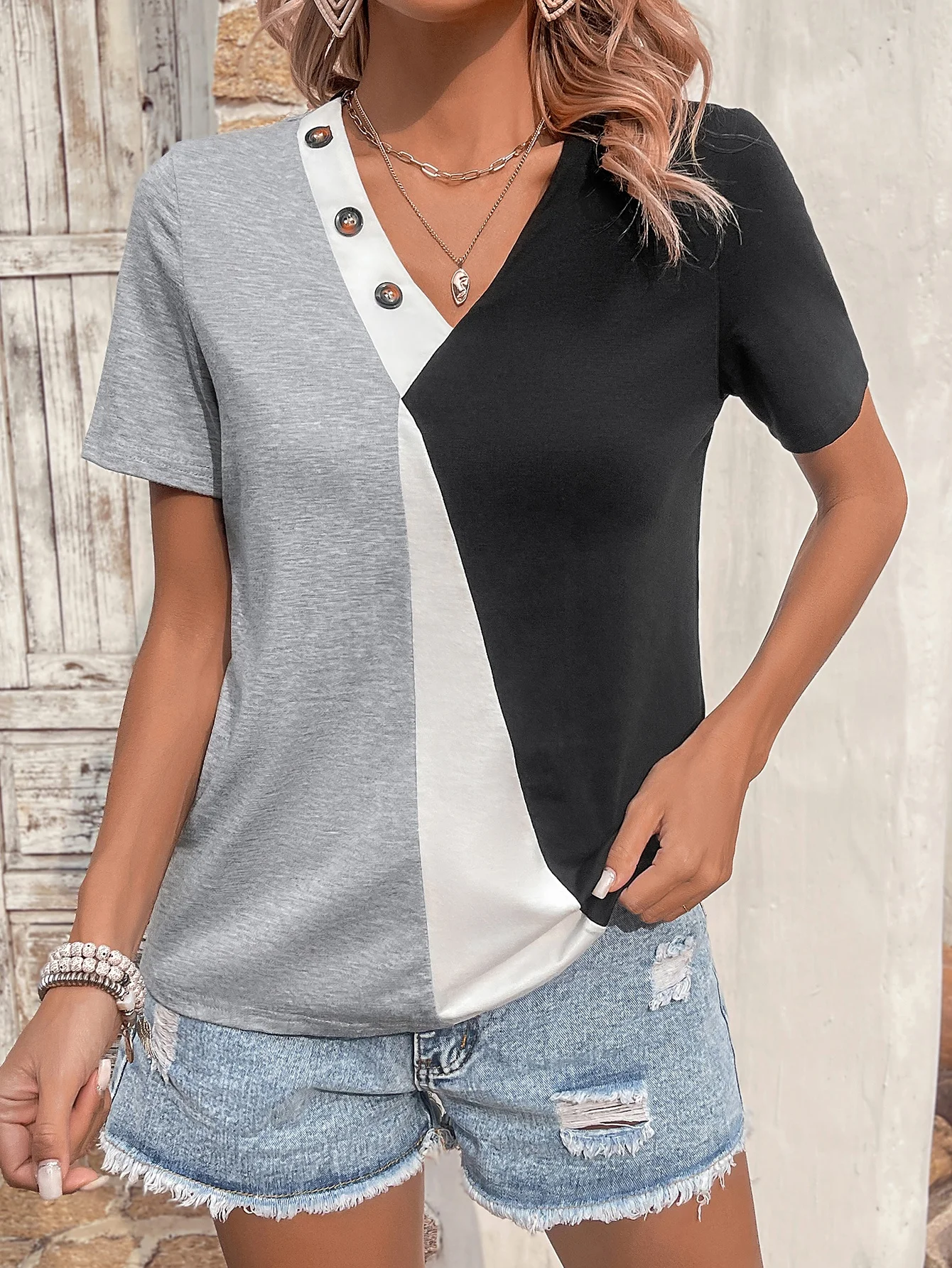 Trendy Stylish Women Color-blocked Cotton Summer T-shirt With Button Decoration
