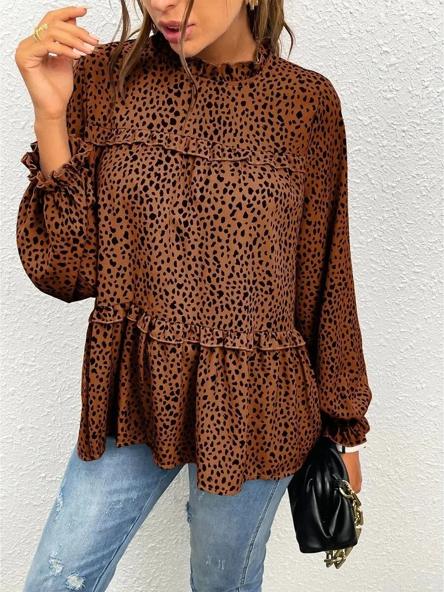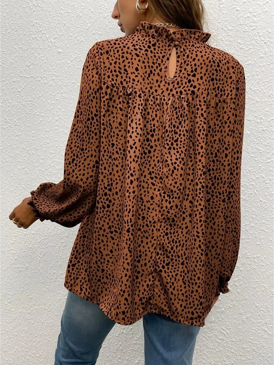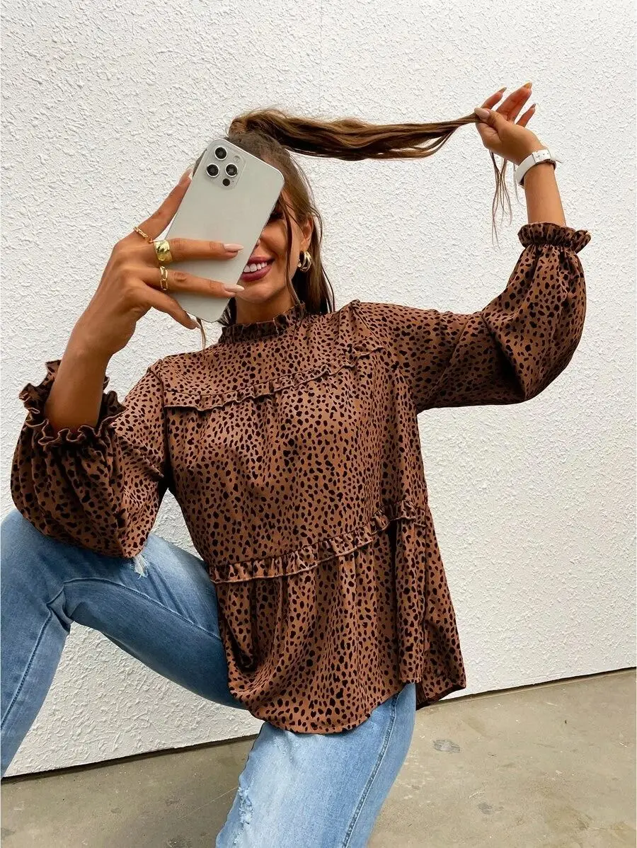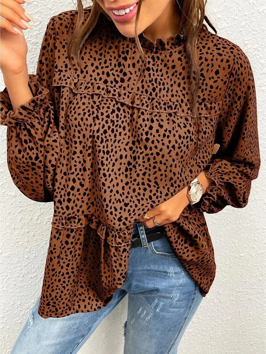 2023 Factory Direct Wholesale New Arrival Casual Long Sleeved Women's Fall Leopard Print Ruffle Flounce Sleeve Frill Trim Blouse