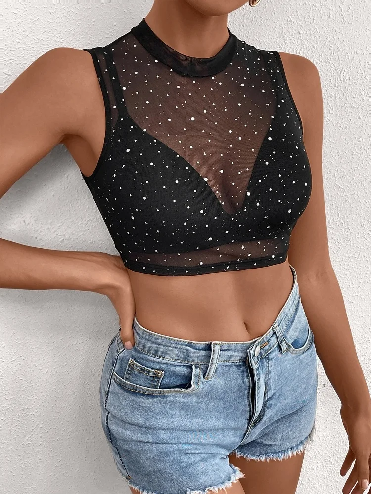 Sheer Mesh Leotard Women's Top Women Sexy Sheer Mesh Tops Sexy Sequin Mesh Hot Drill Sleeveless Top