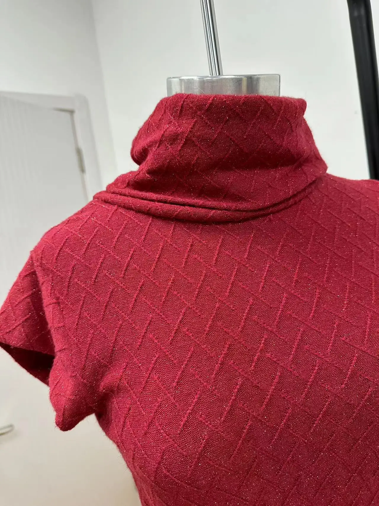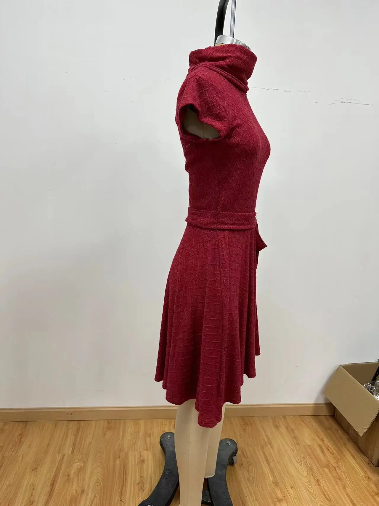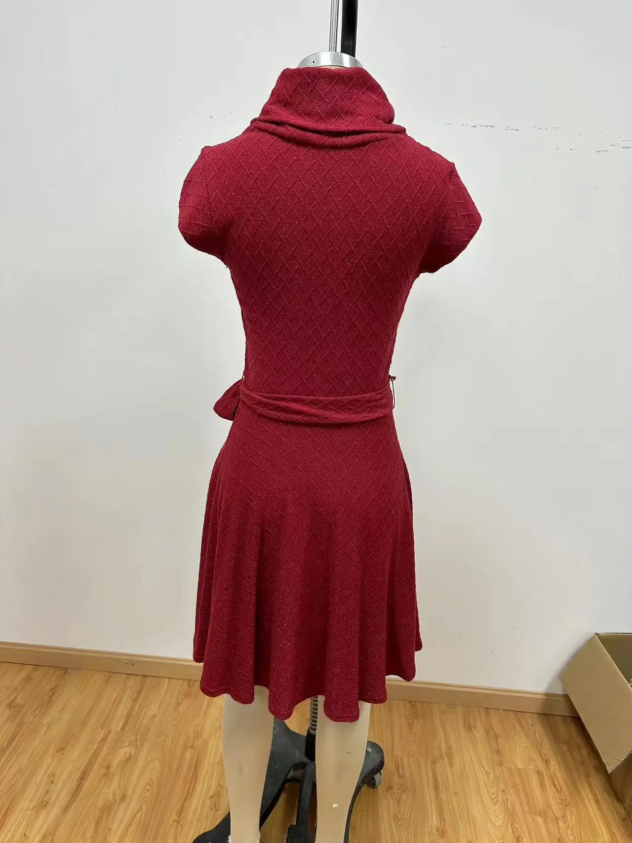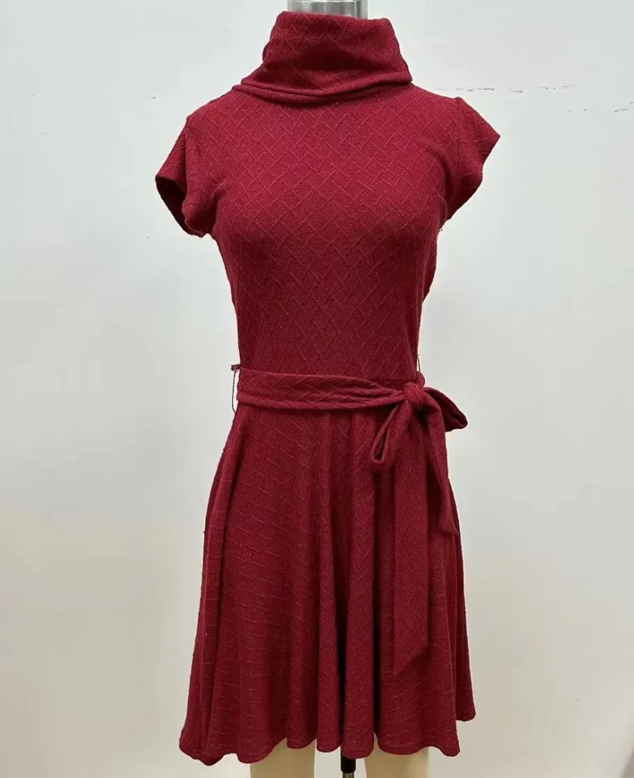 2026 Red Knitted Slim Fit Vintage Celebration Party Dress Winter Season Empire Waistline Mandarin Collar Knee-Length Simple