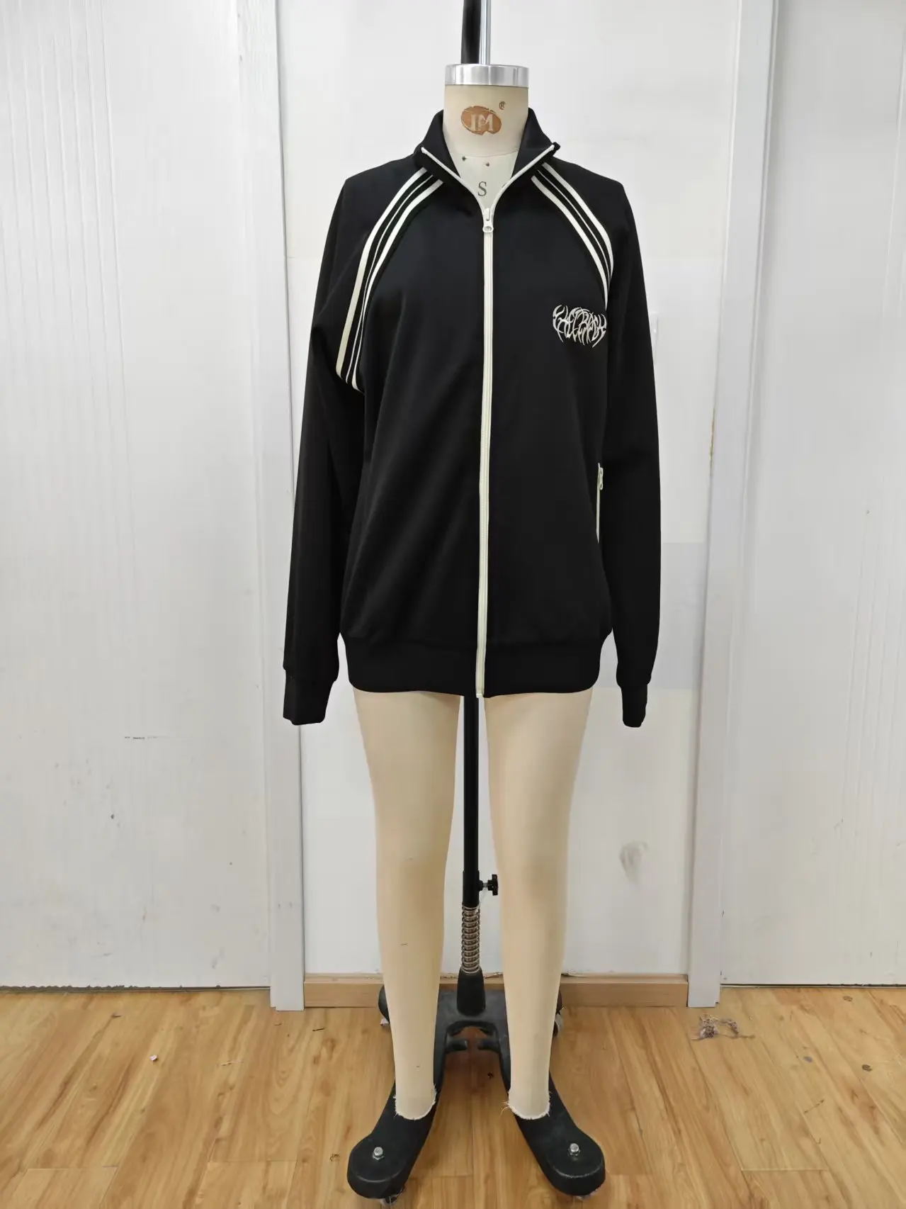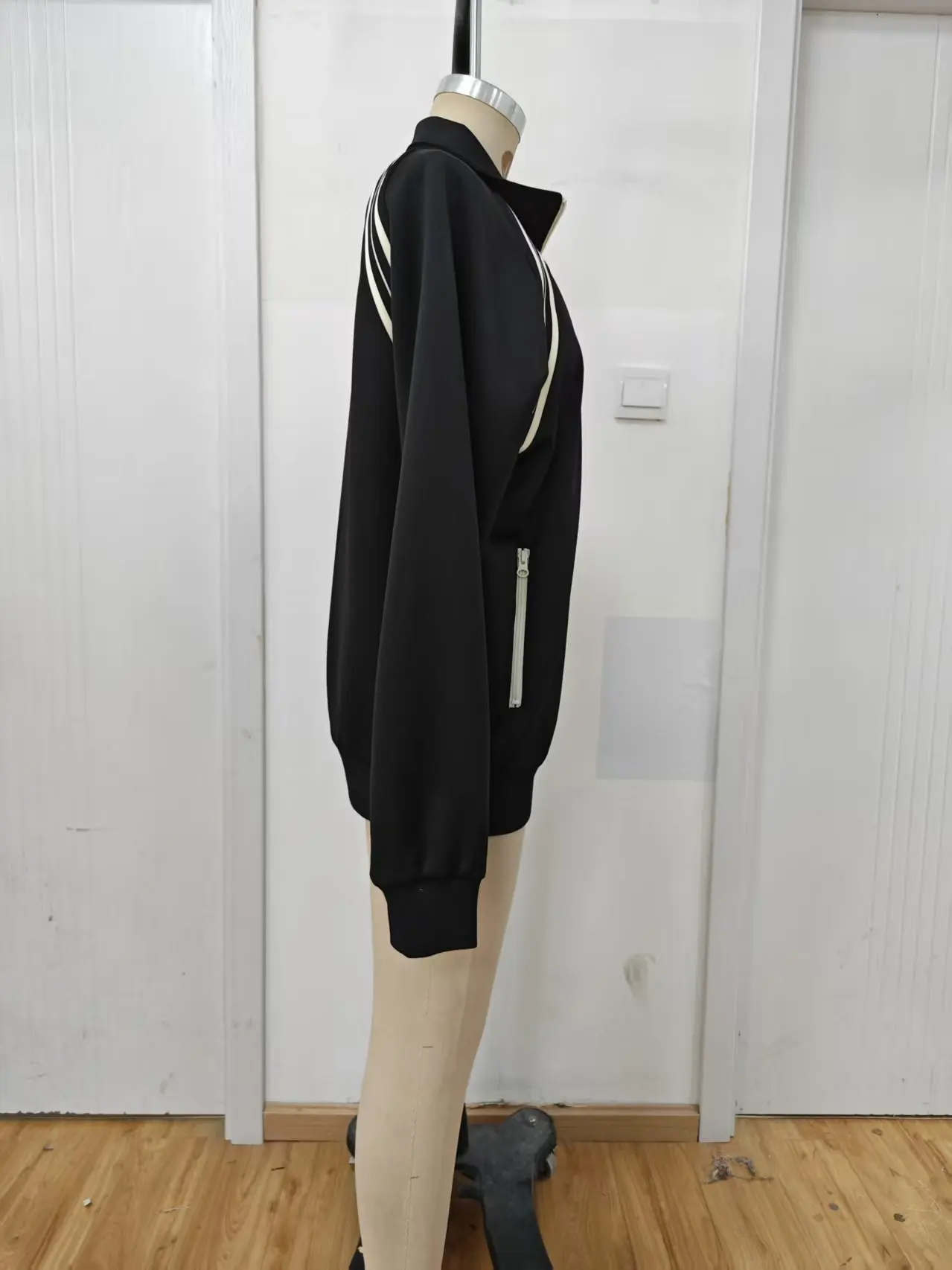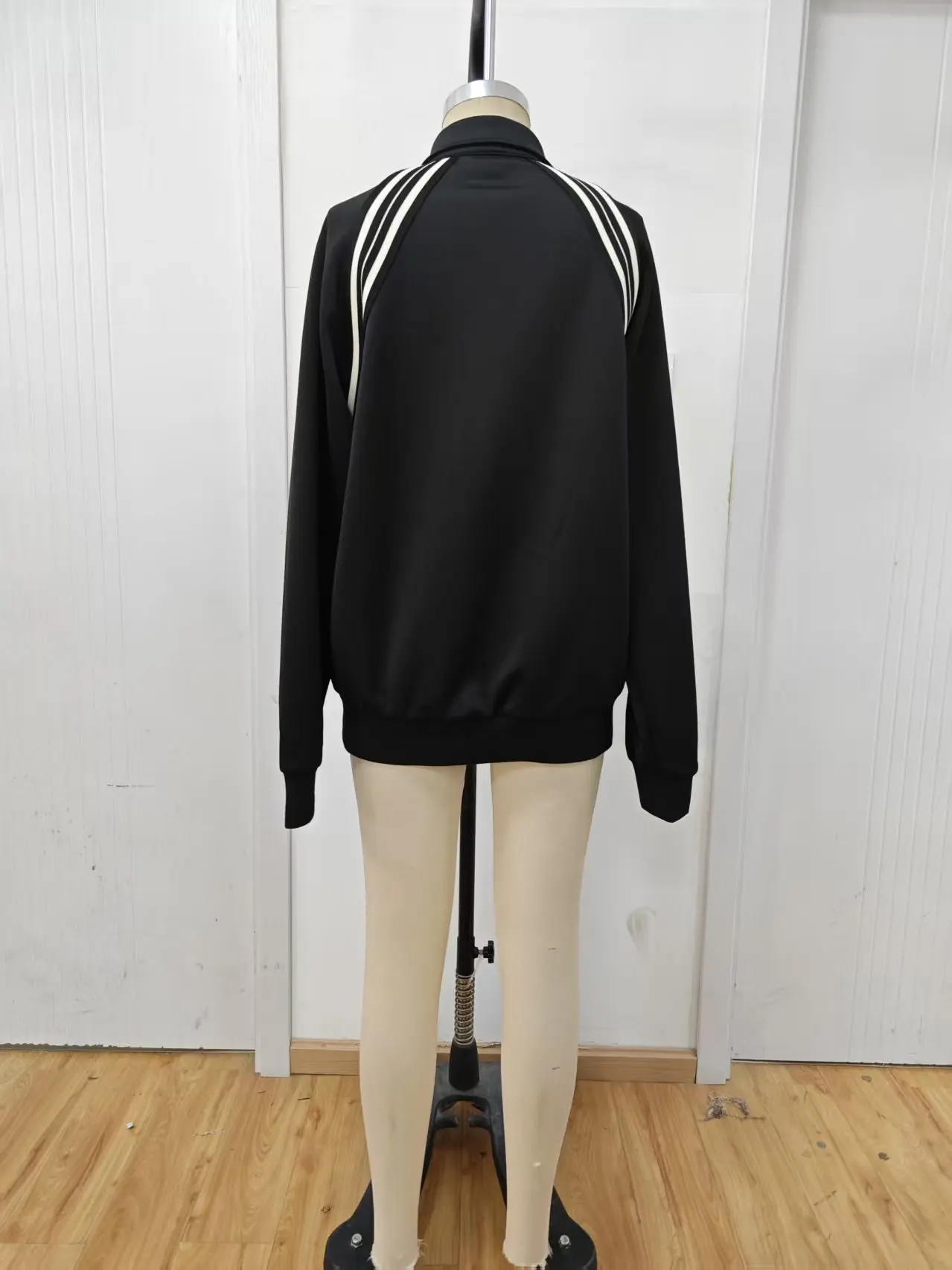 Autumn Street Style Windproof Jacket with Black Lapel, Contrasting Color Stripes, Zipper Closure, Solid Color Cotton Print