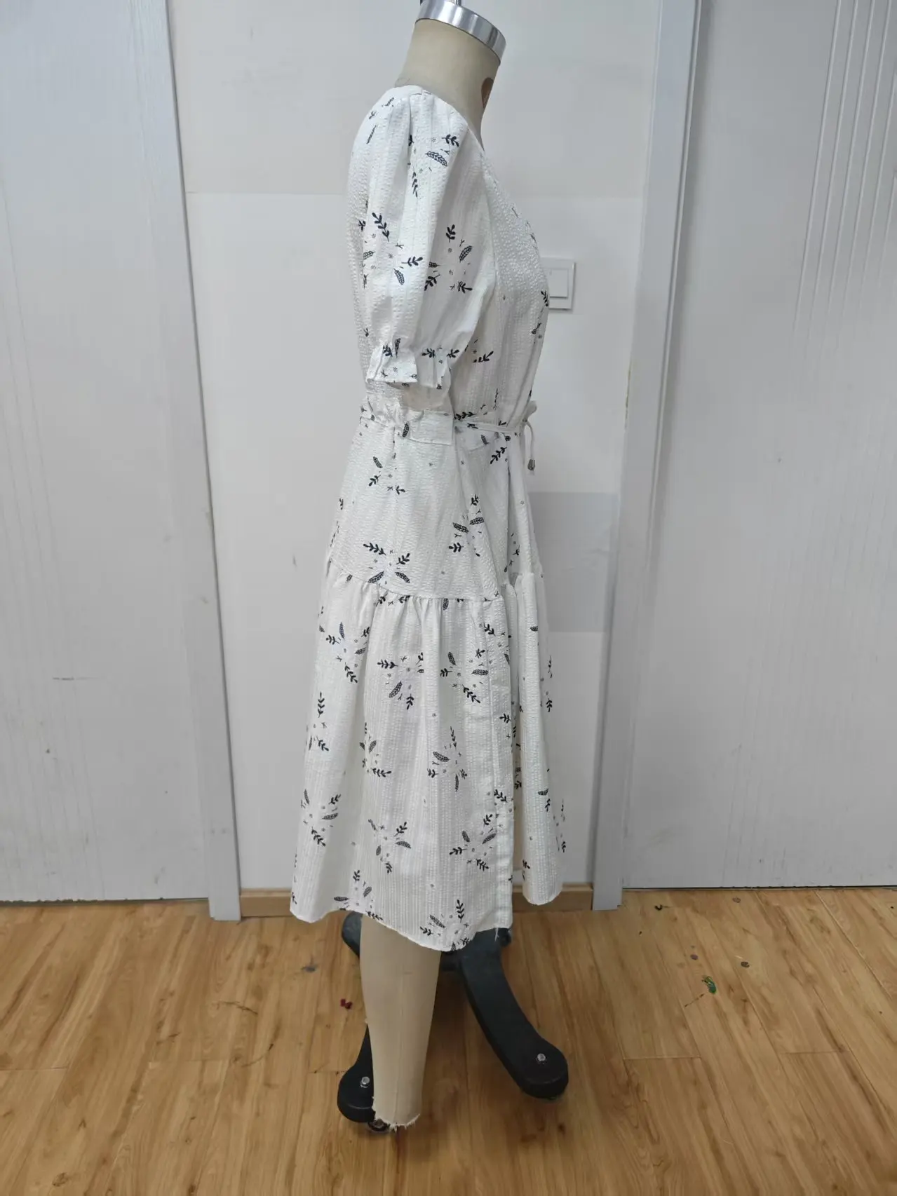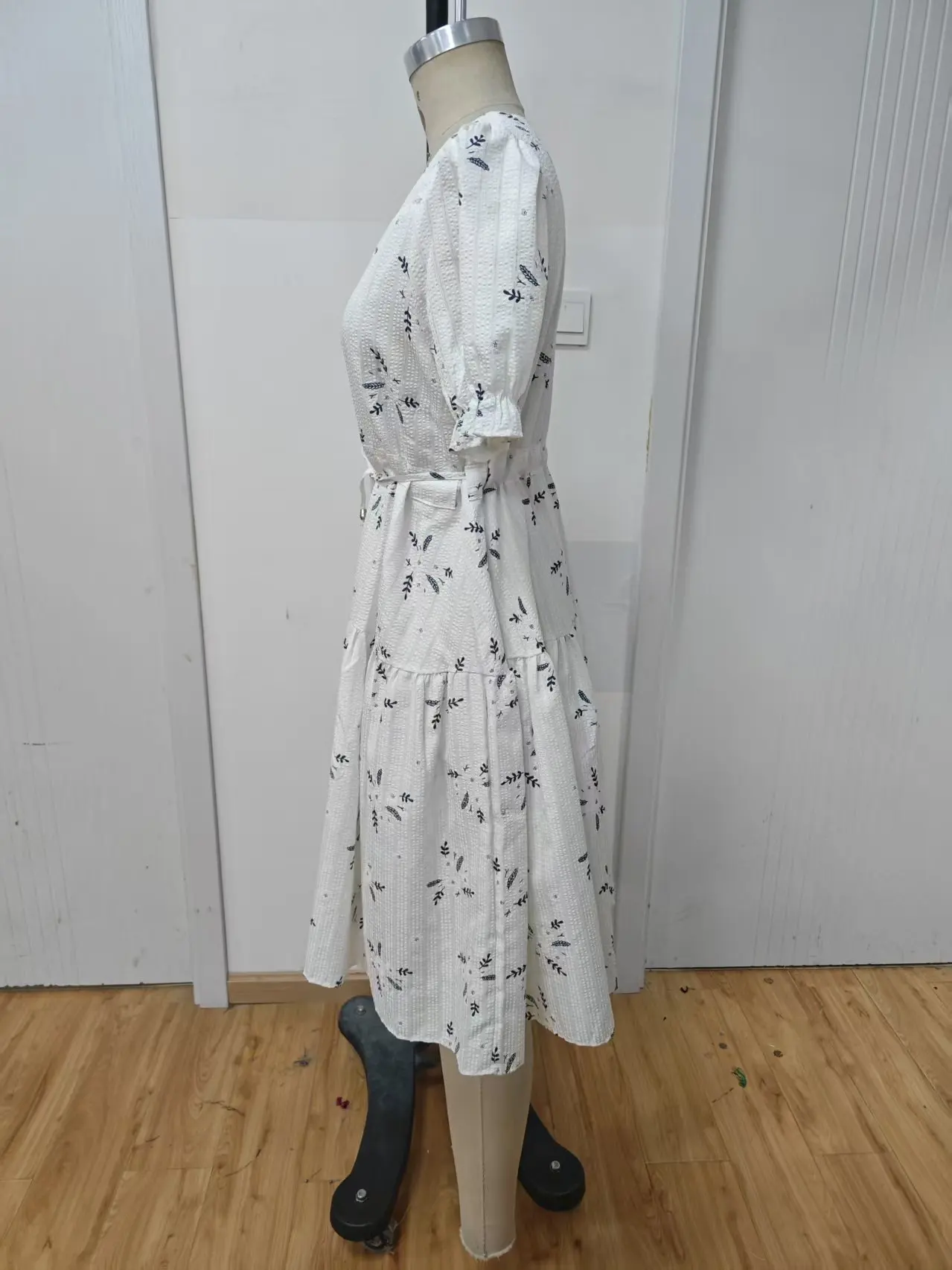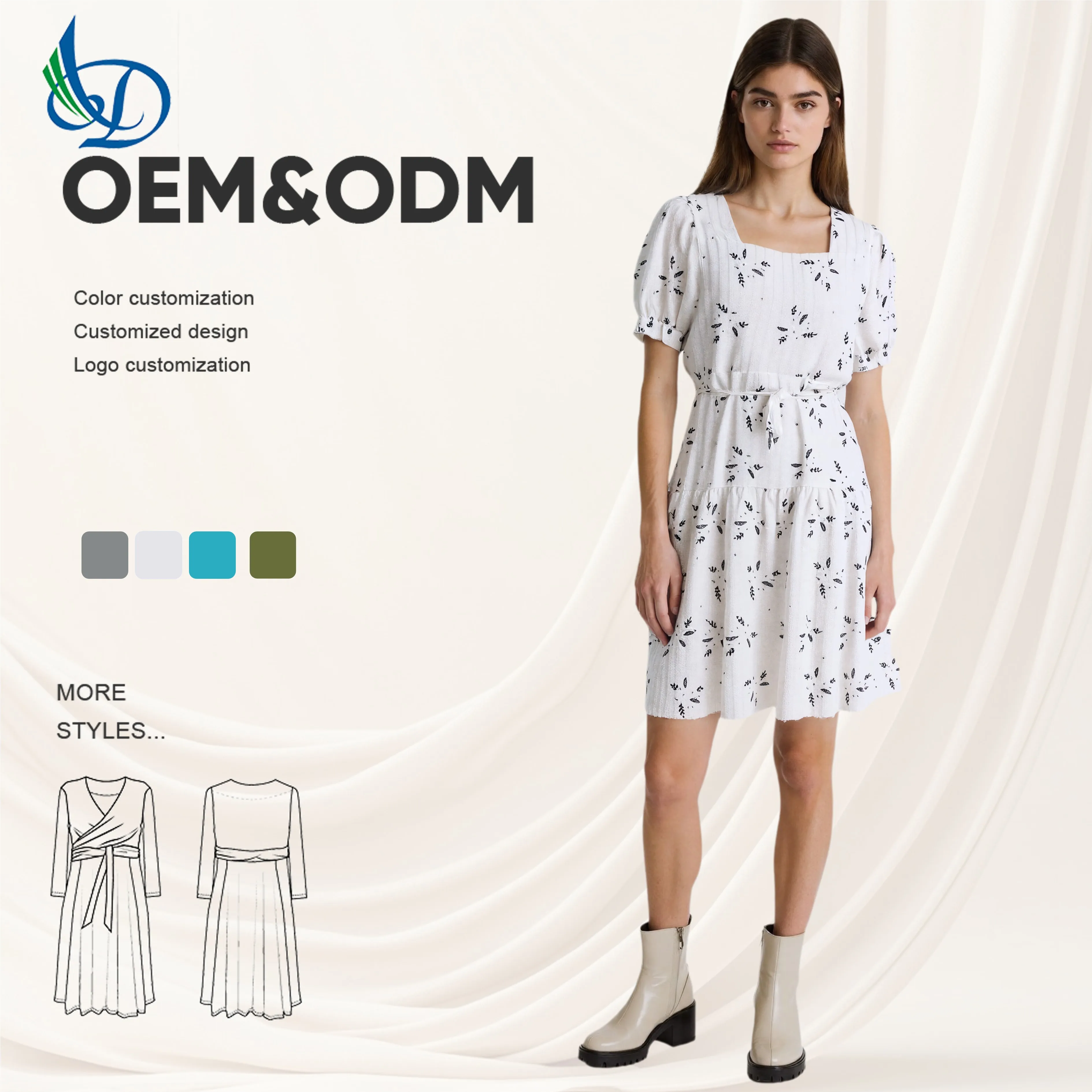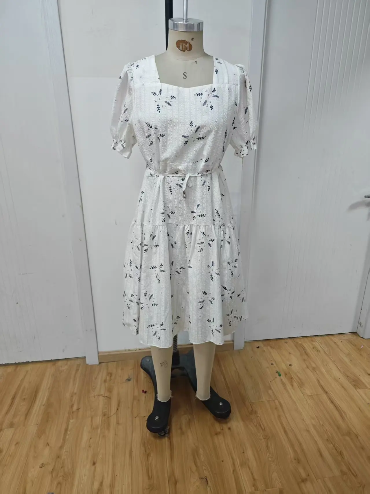 2026 New Women's Summer Garden Picnic White Flower Printed Square Neck Anti Static Natural Waist Dress