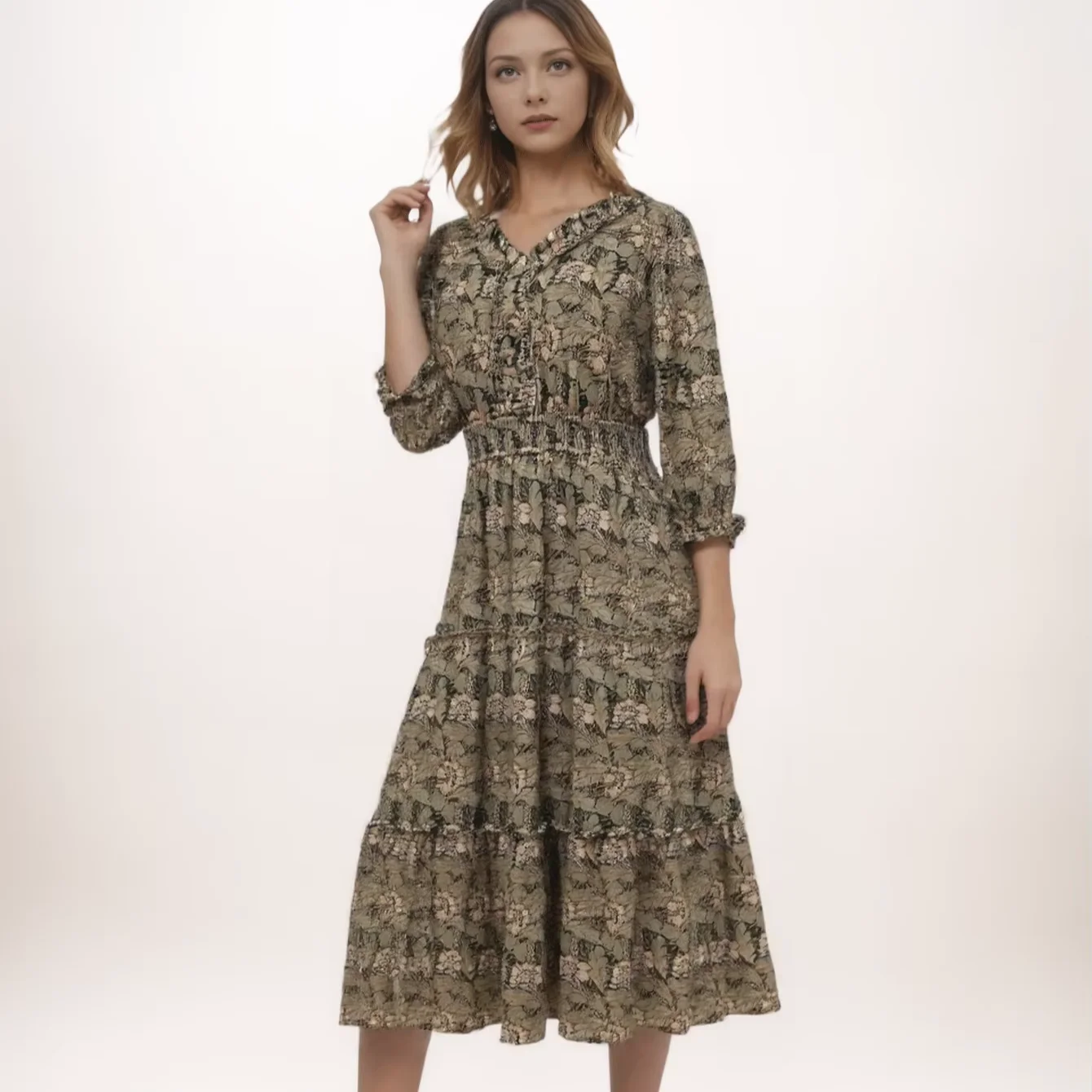 ZYHT 82053 Apricot Lace Top with Tiered Ruffled Sleeves V-Neck & Gold Buttons Blouse Wanita Elegan Women Blouse