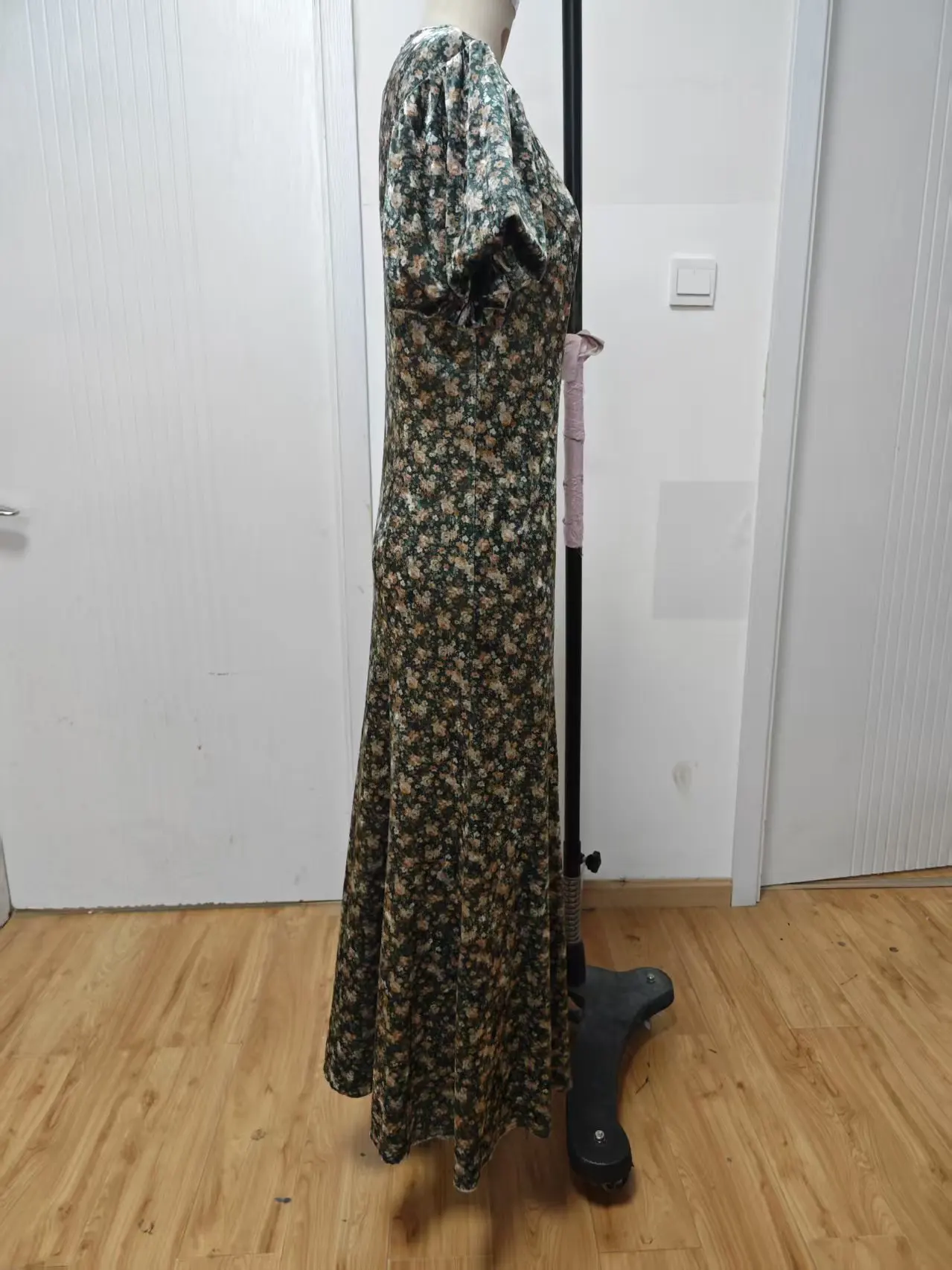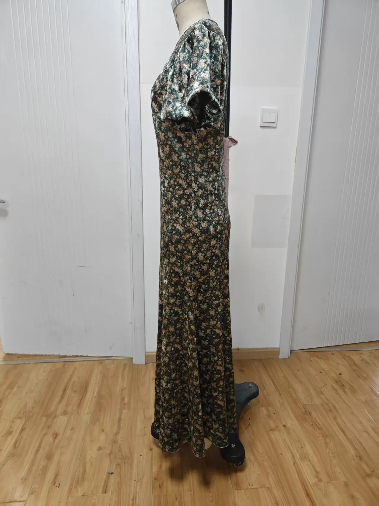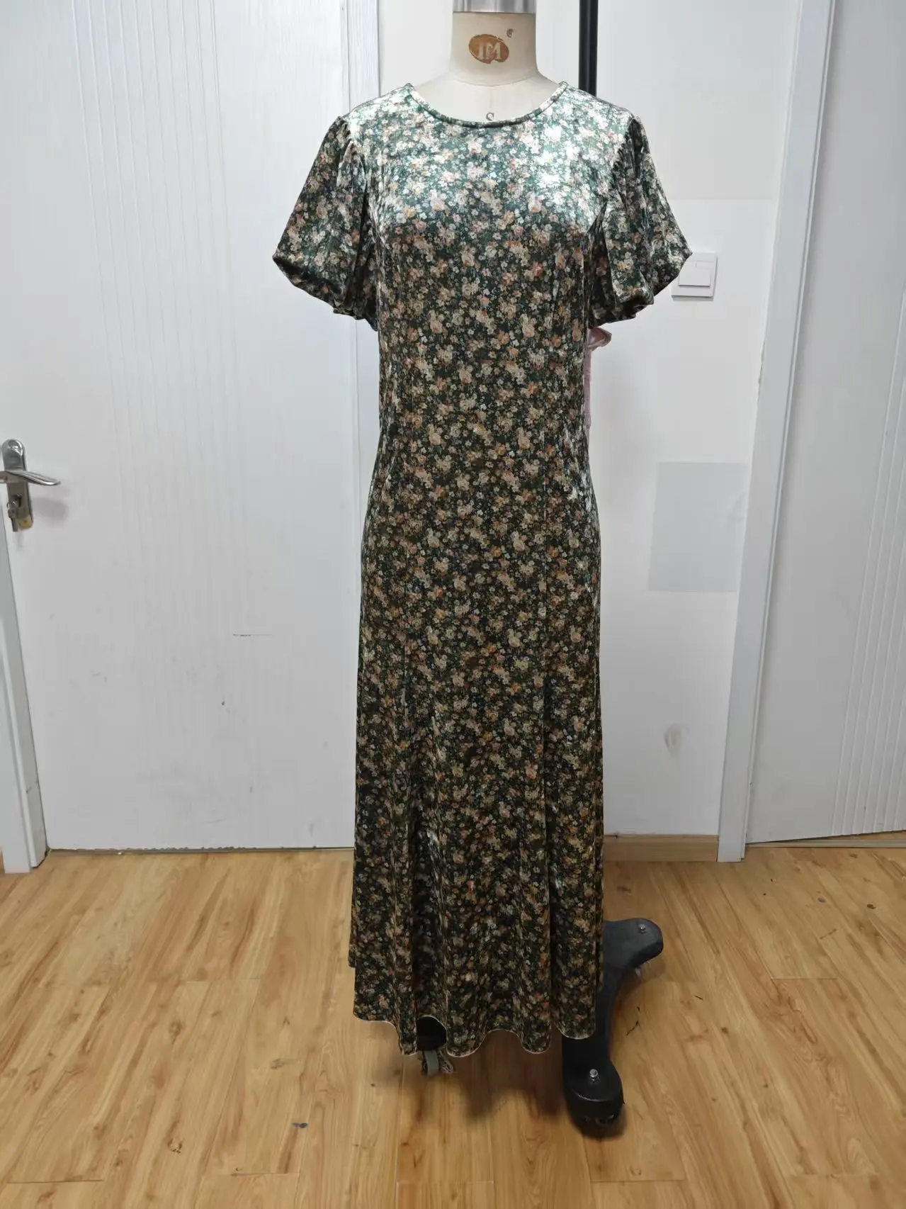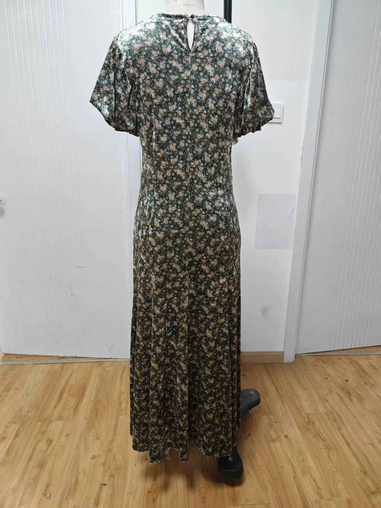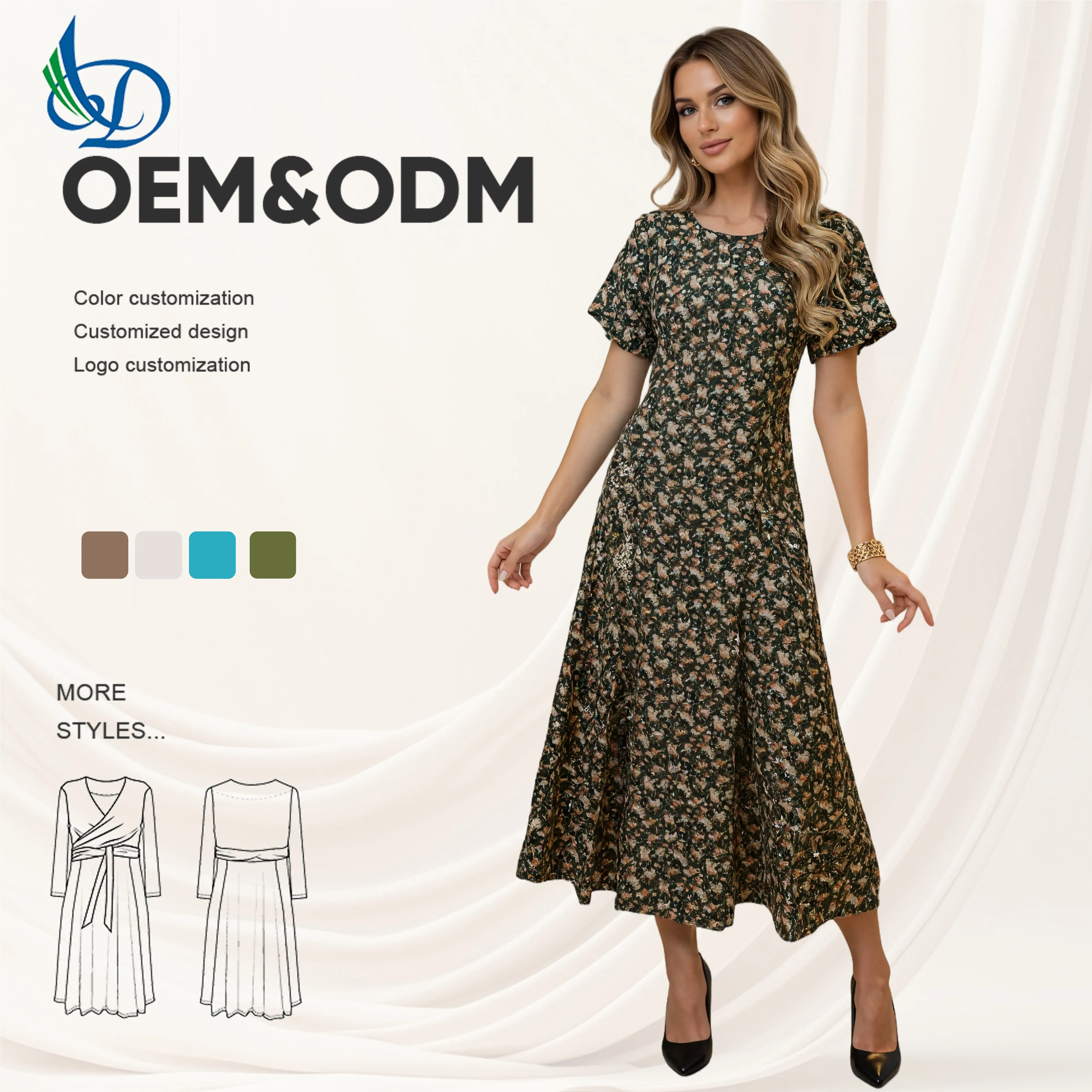 Women's Summer Casual Dress Short Sleeved Printed Round Neck Floor Length Skirt Solid Color Women's Style