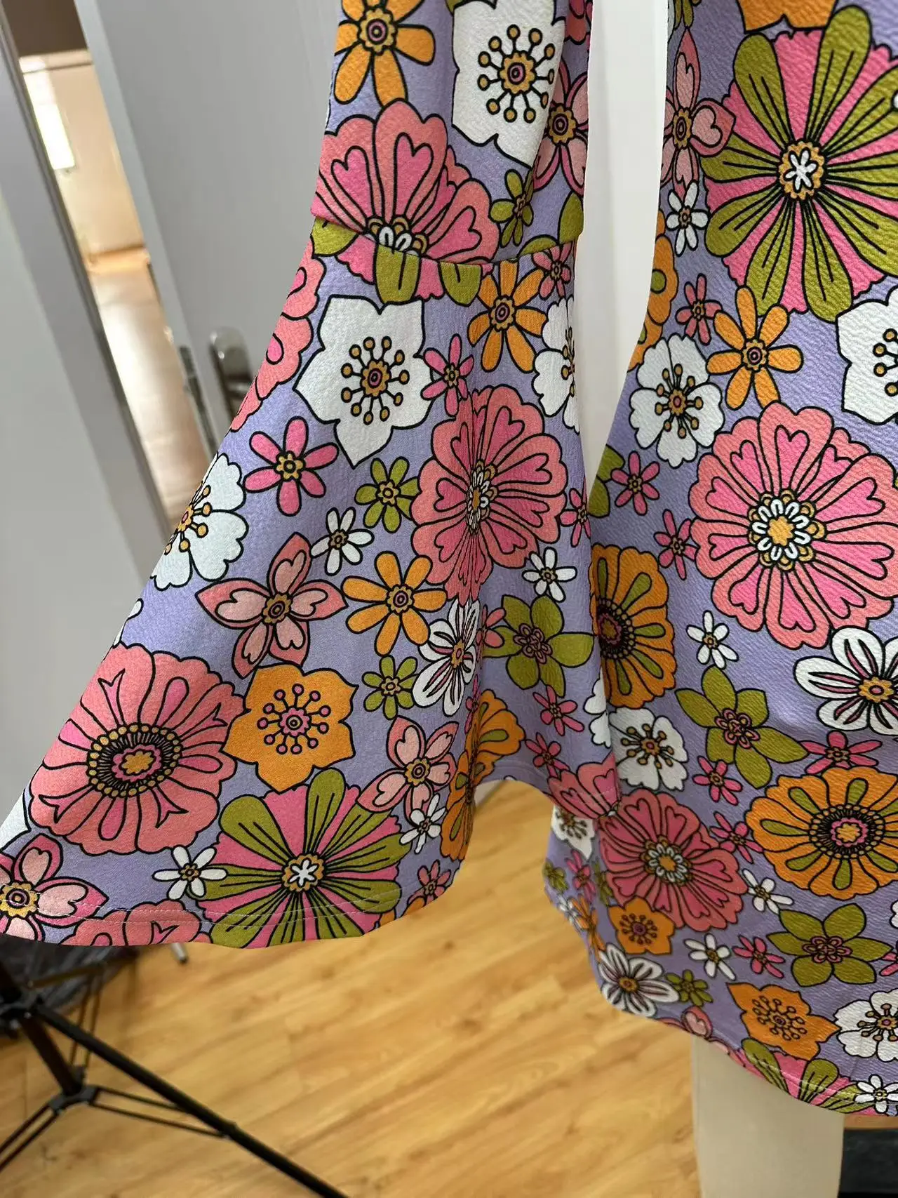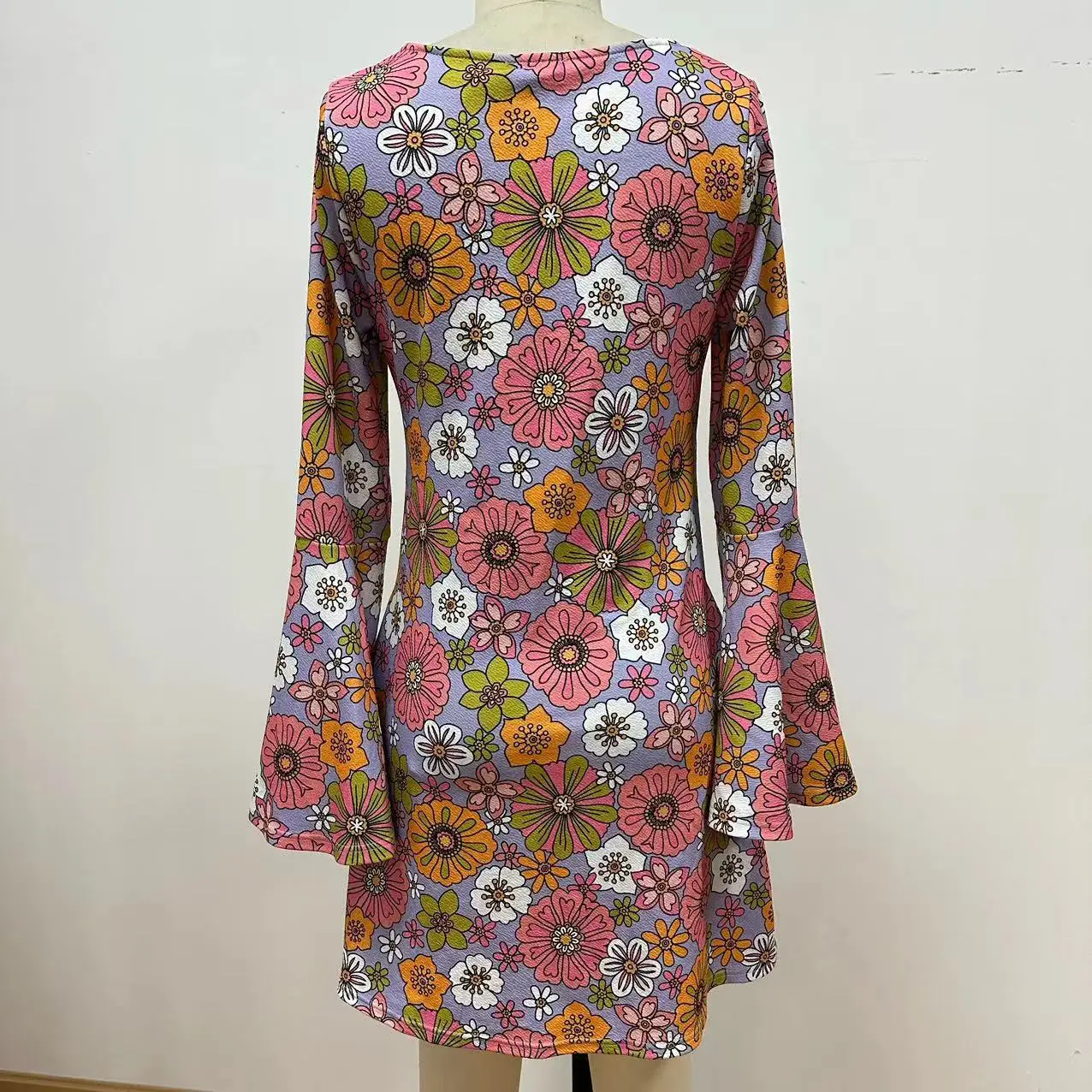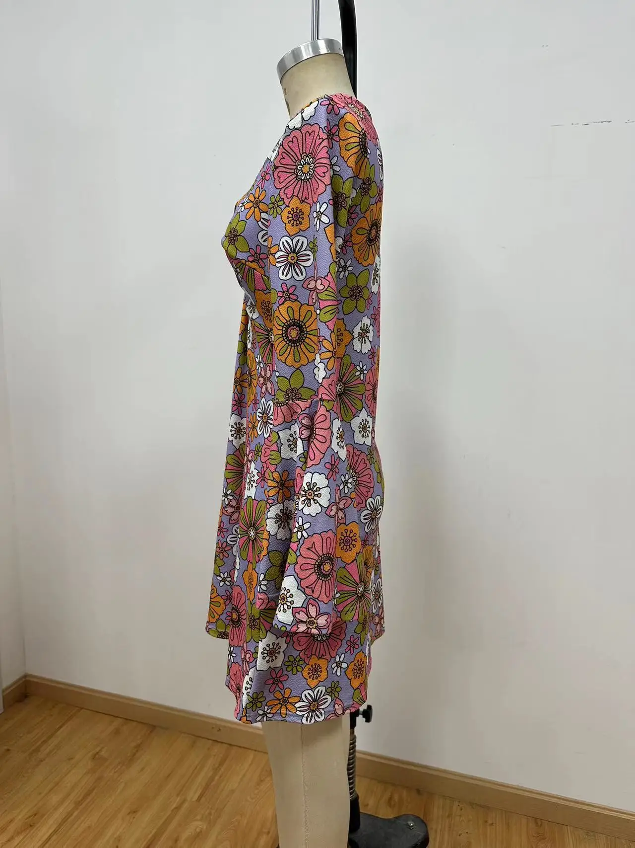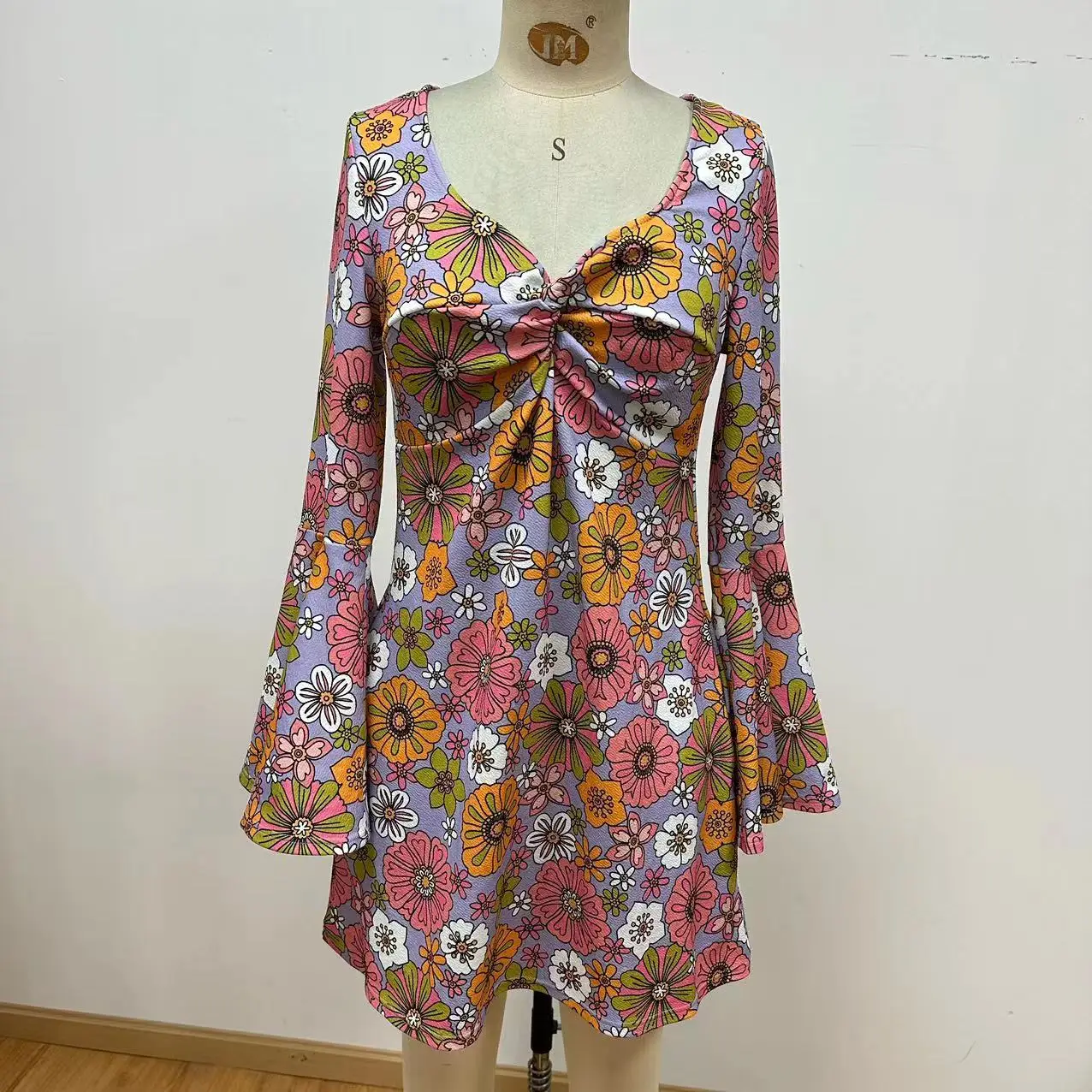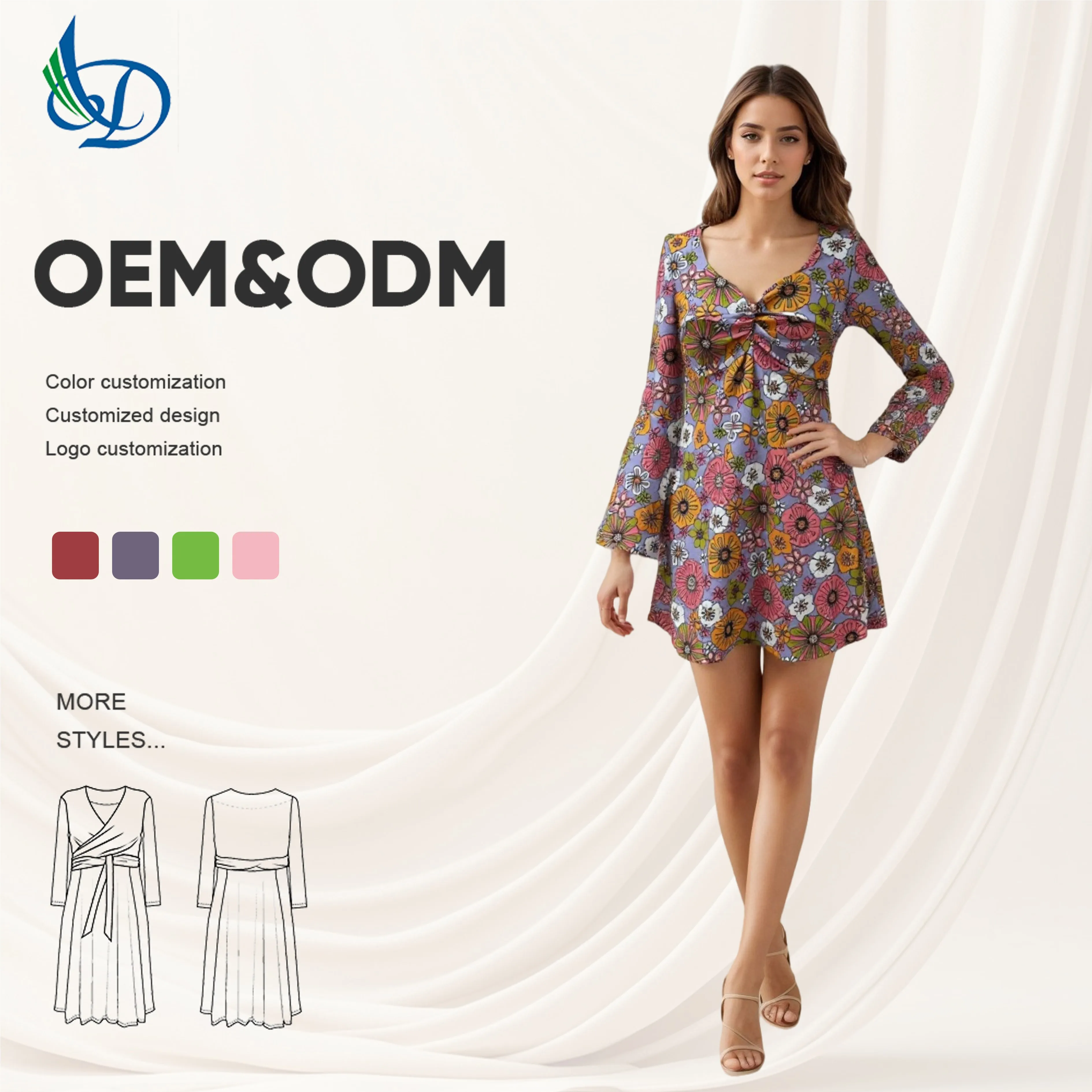 Trendy Sweet Floral Pattern Knee-Length Dress Women Elegant Loose Beach Casual Autumn Summer Custom Fashion Wholesale Ruched
