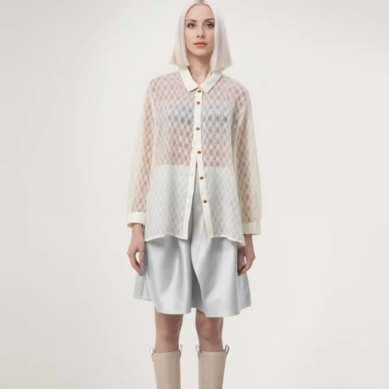 ZYHT 82053 Apricot Lace Top with Tiered Ruffled Sleeves V-Neck & Gold Buttons Blouse Wanita Elegan Women Blouse