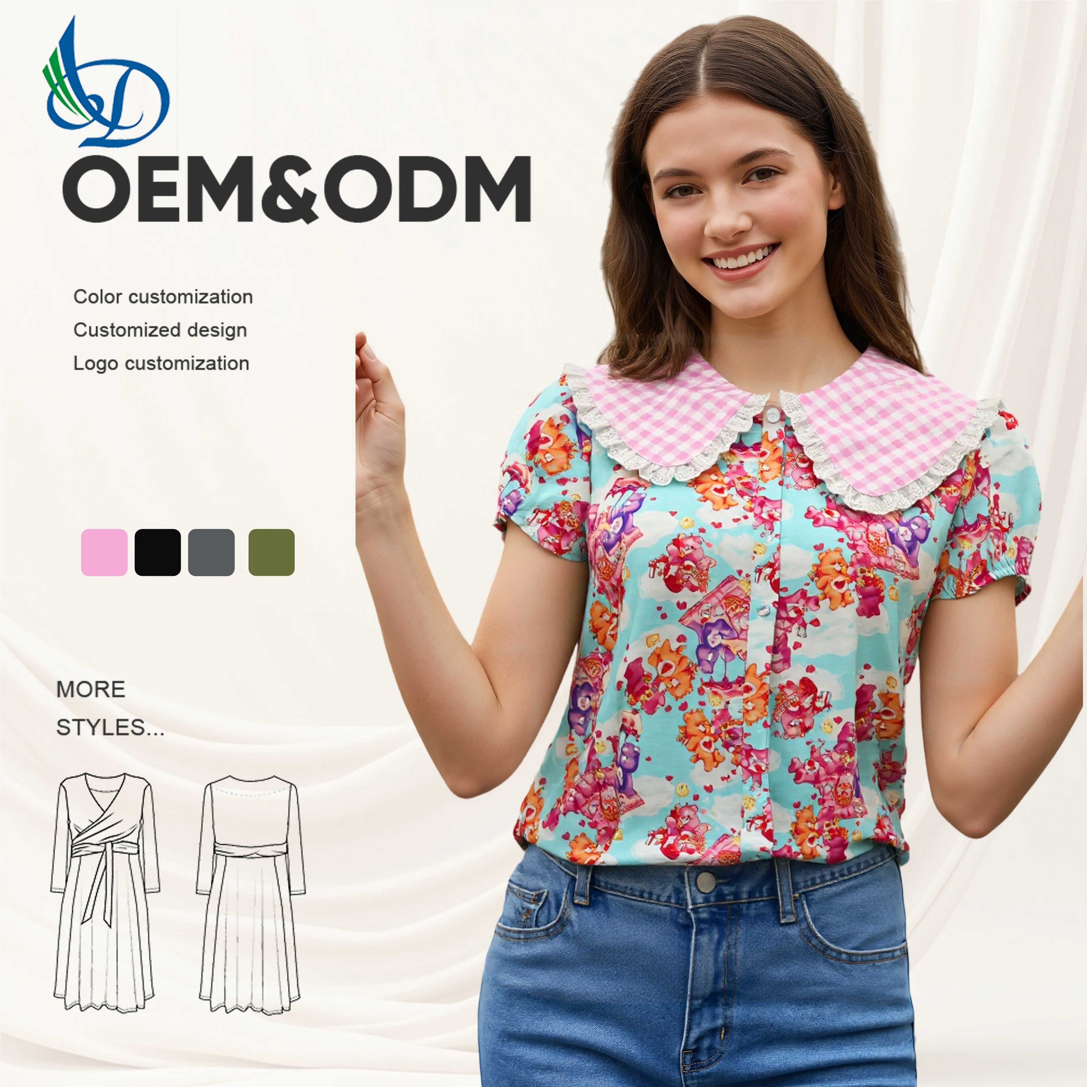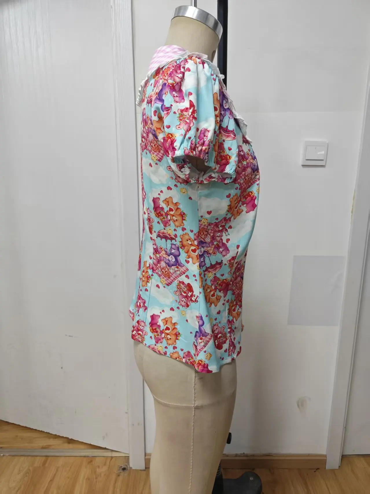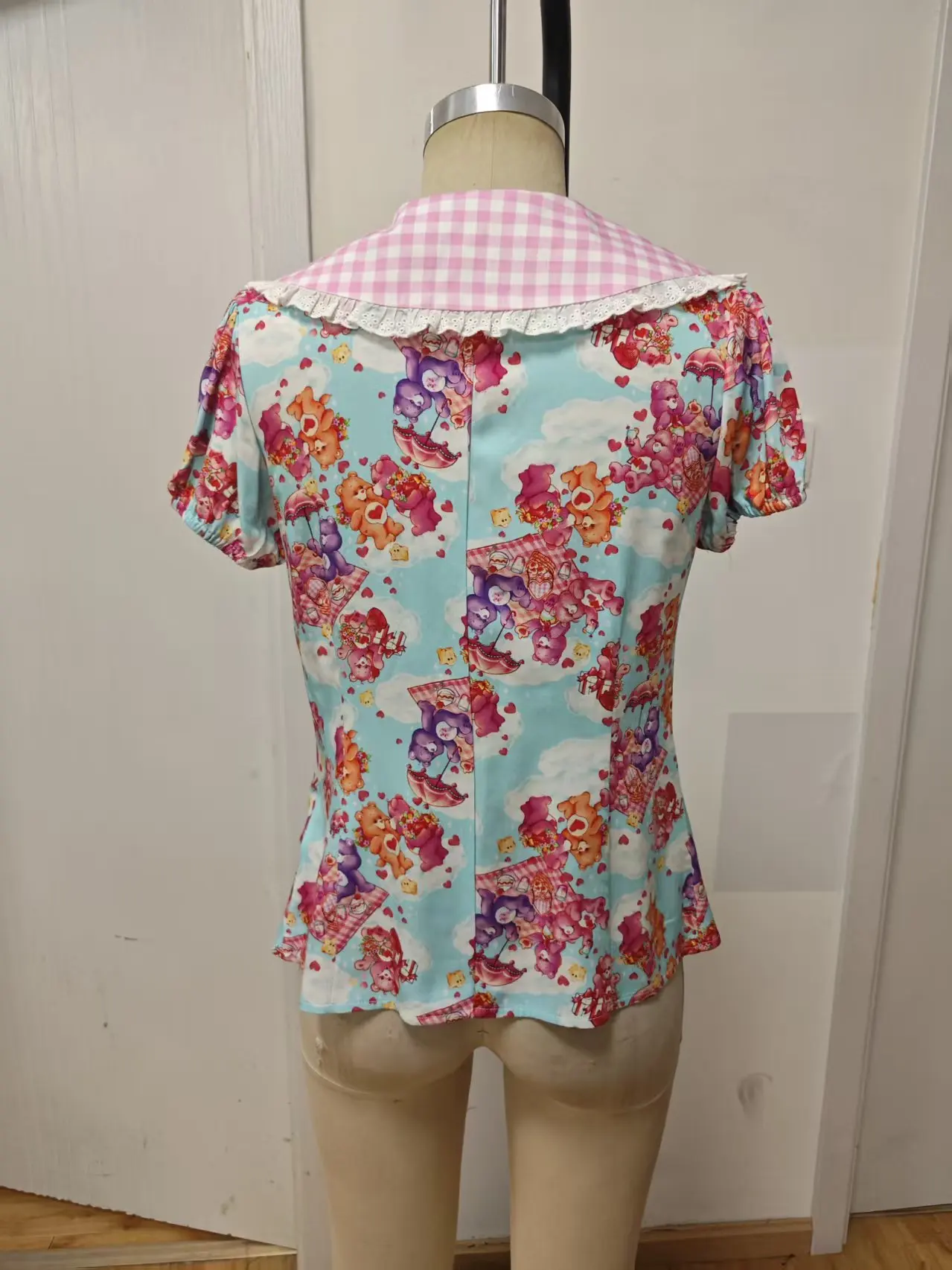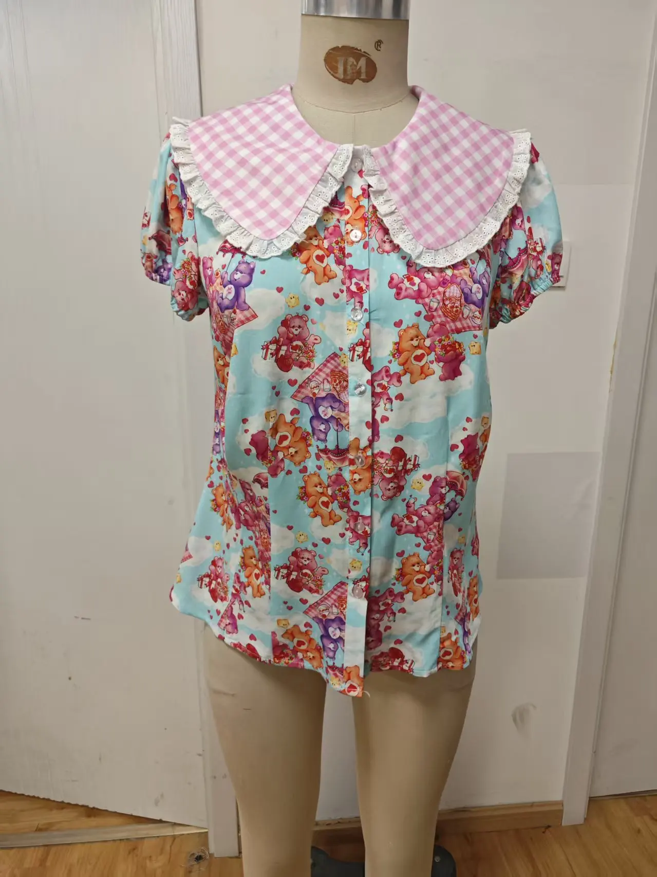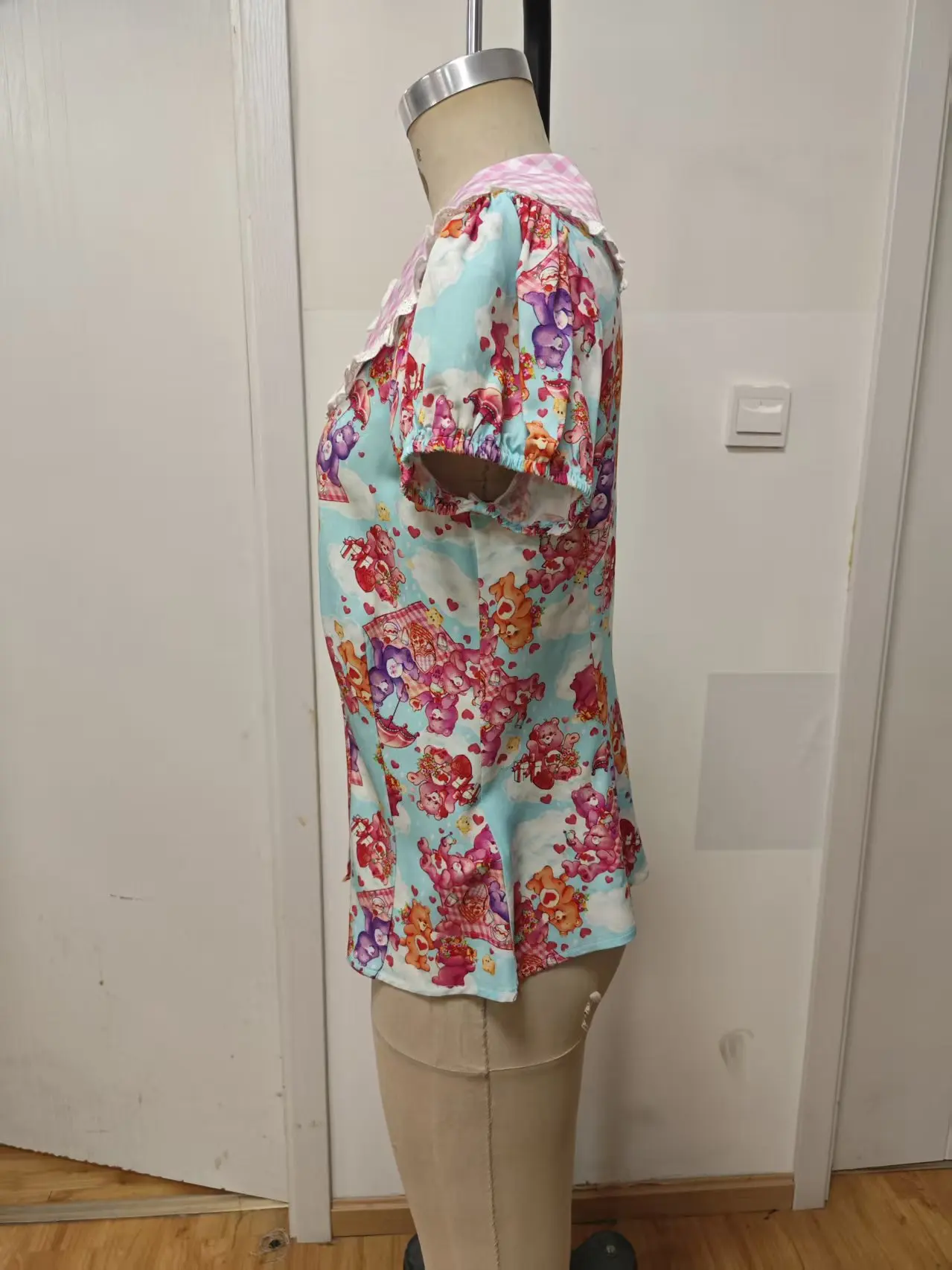 2026 New Women's Casual Short Sleeved Printed Shirt with Checkered Collar and Cartoon Pattern, Suitable for Daily Wear in Summer