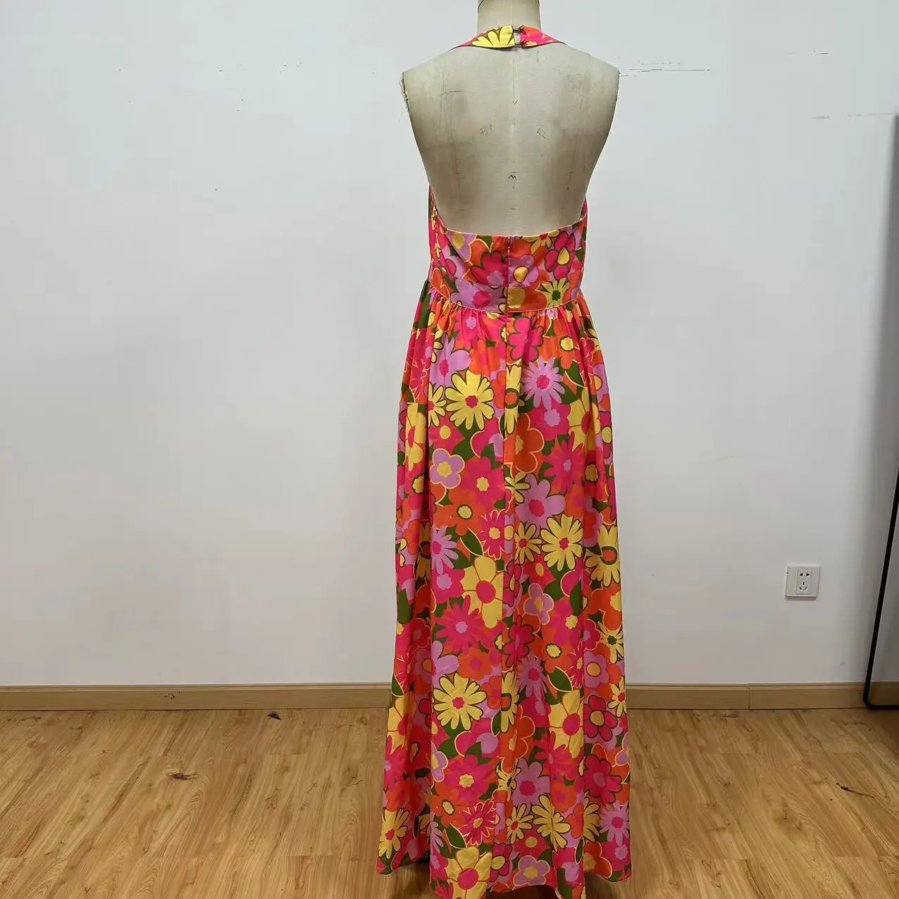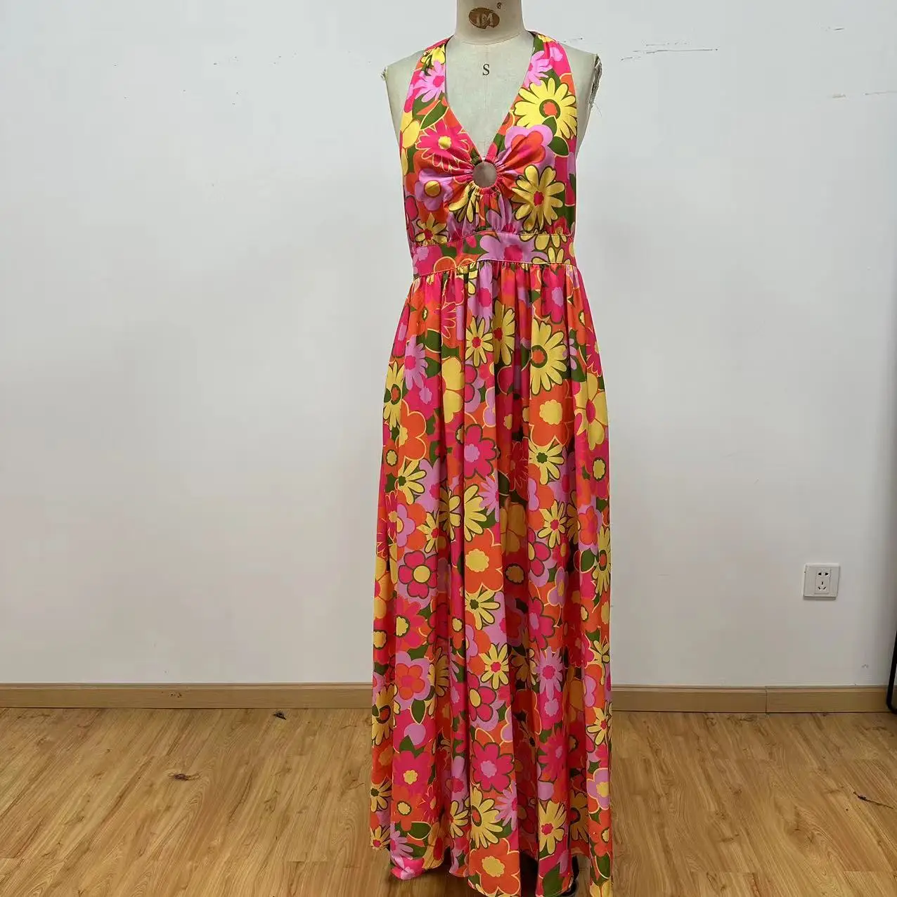 2026 New Summer Custom Ladies Strapless Sleeveless Casual V-neck Floral Woven Natural Waist Maxi Dress for Women
