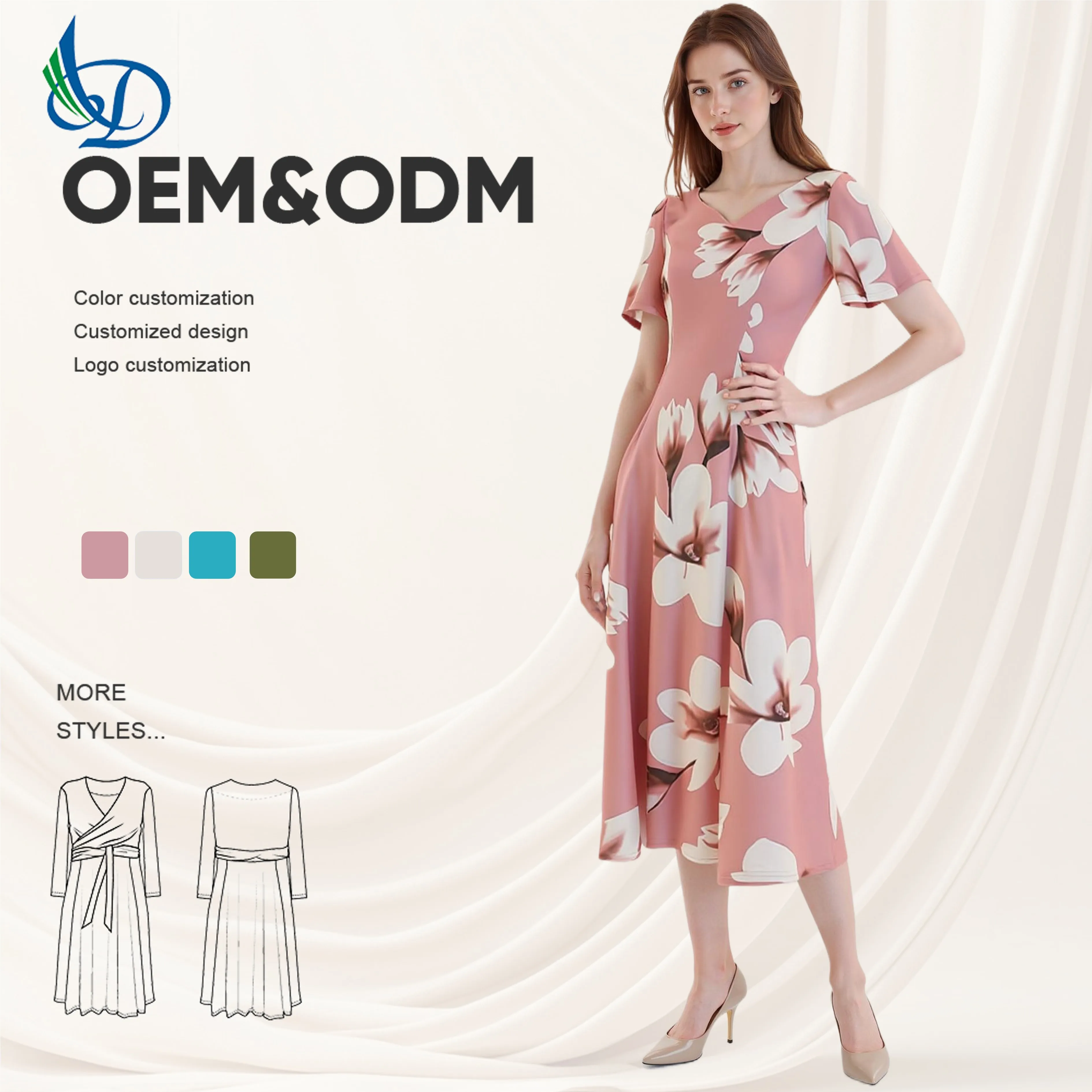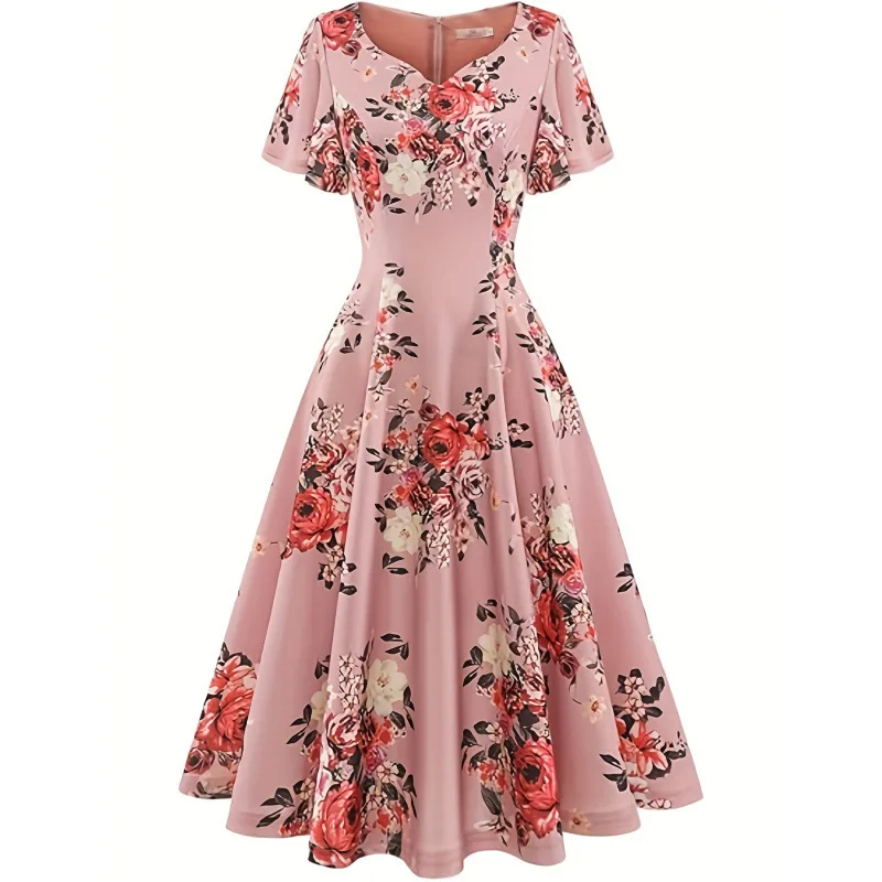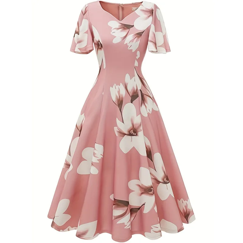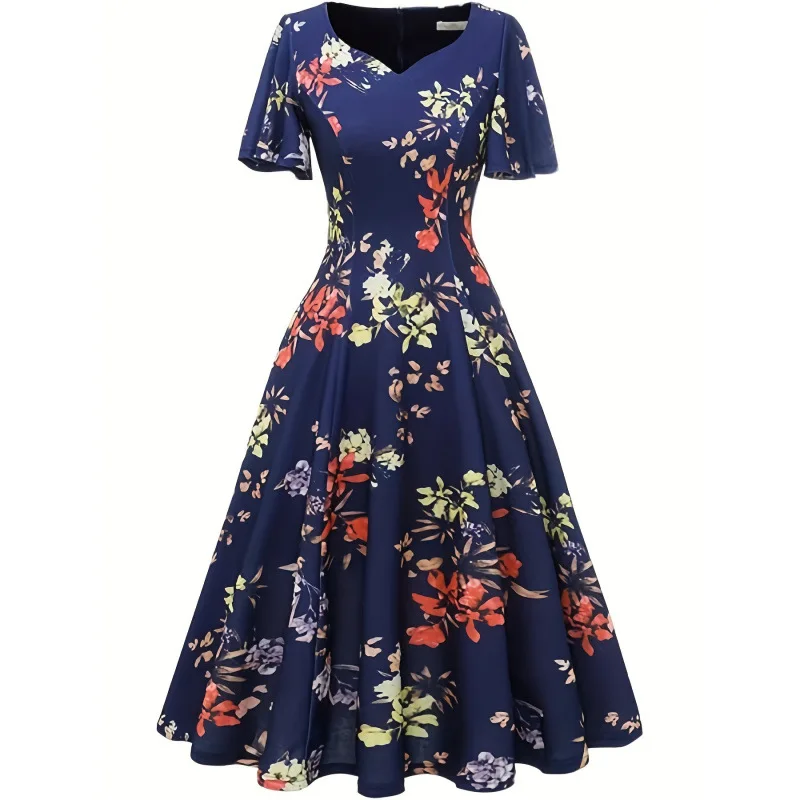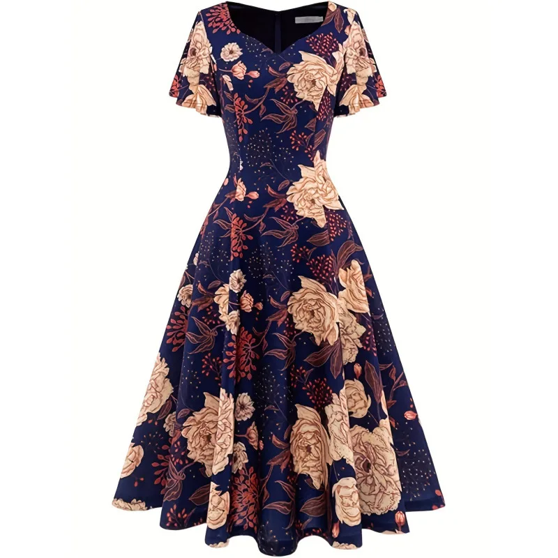New Casual Dress Floral Print Dress V-neck Women's Short Sleeved Dress