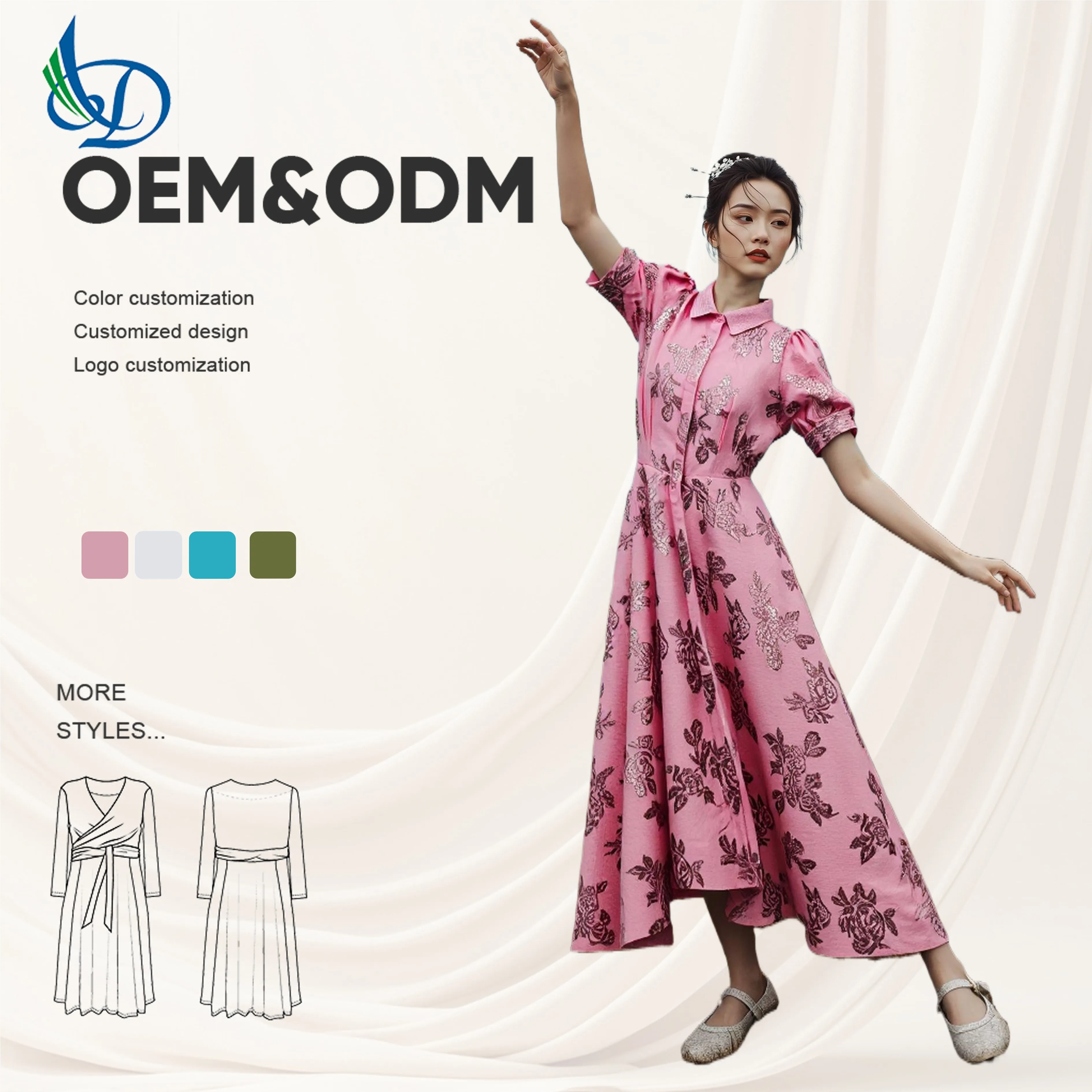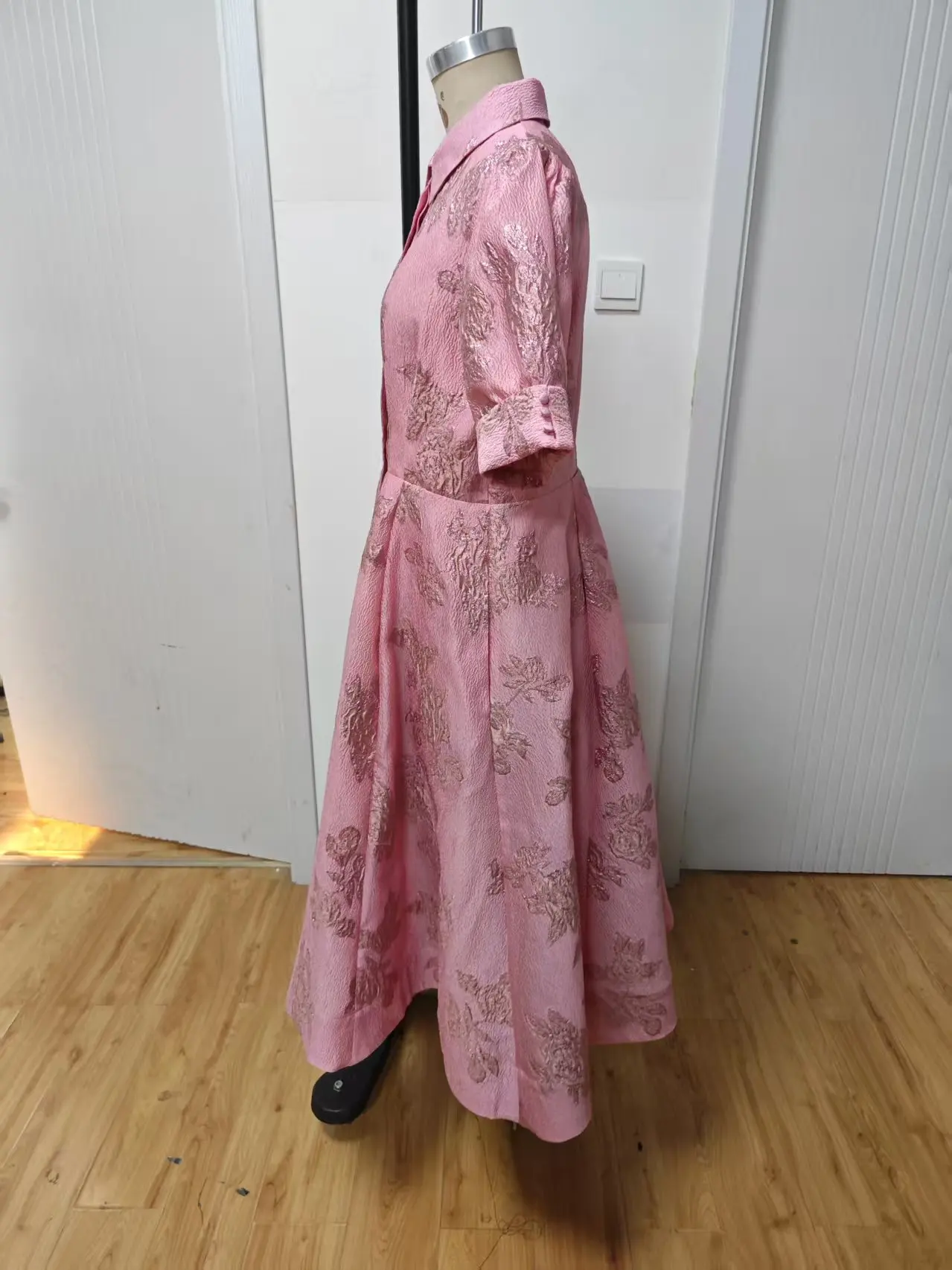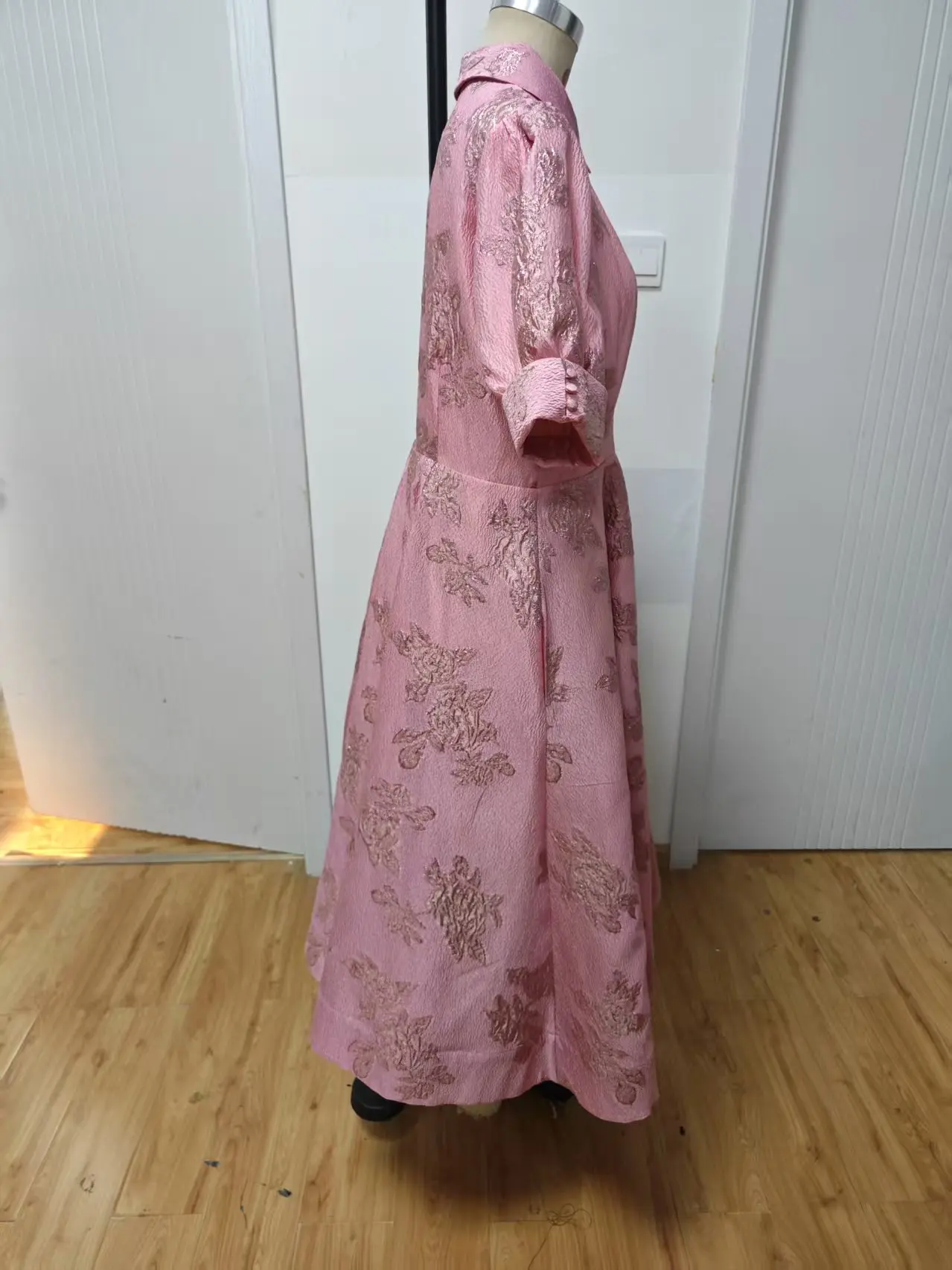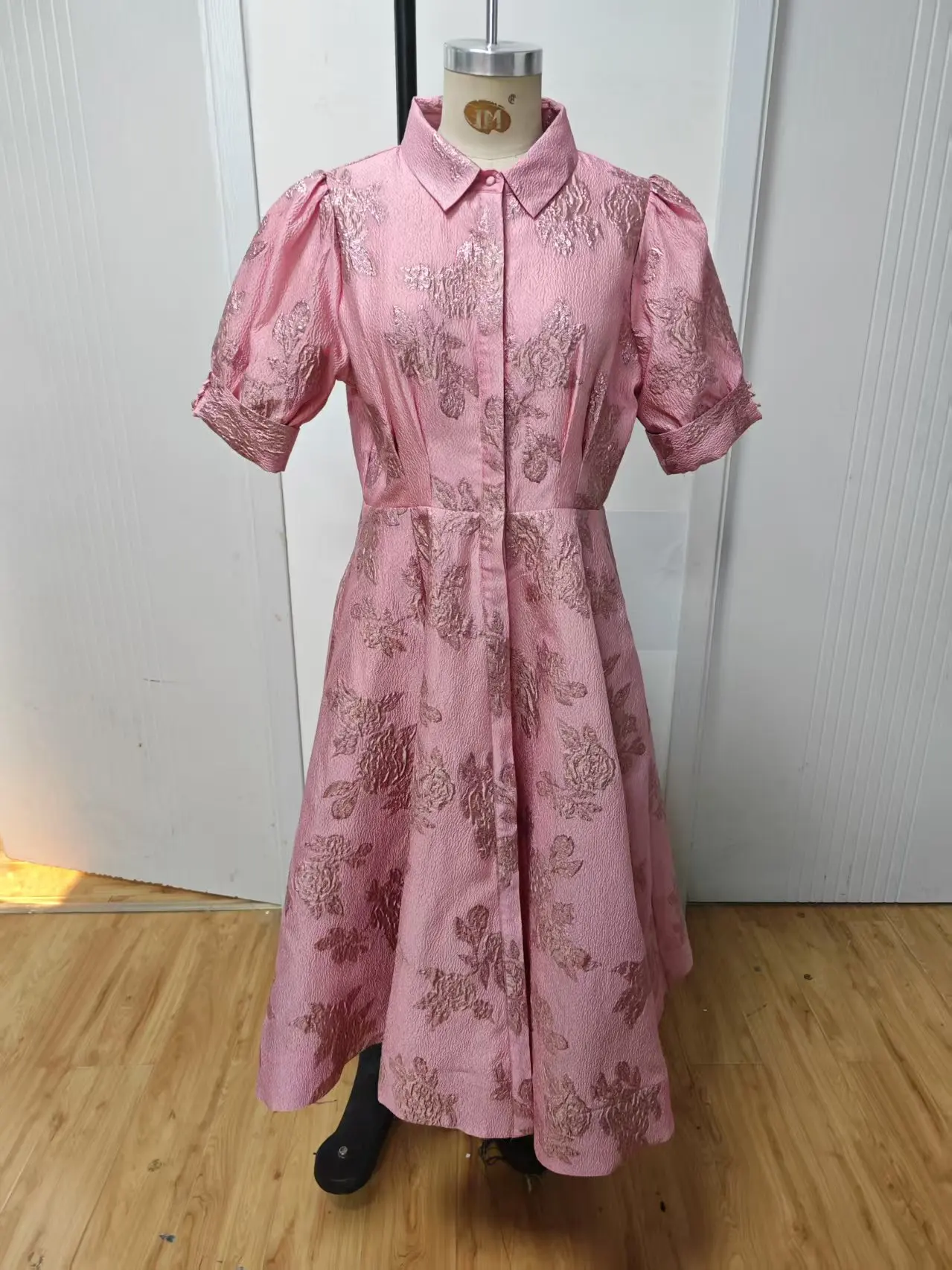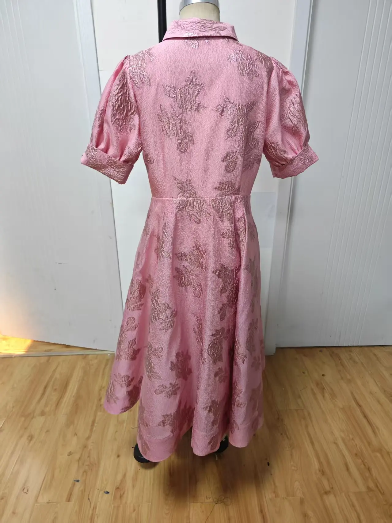 Women's Elegant Dress Jacquard Flower Short Sleeved Hot pink Loose Casual Party Dress