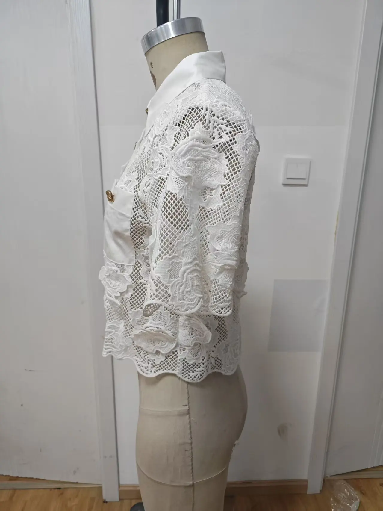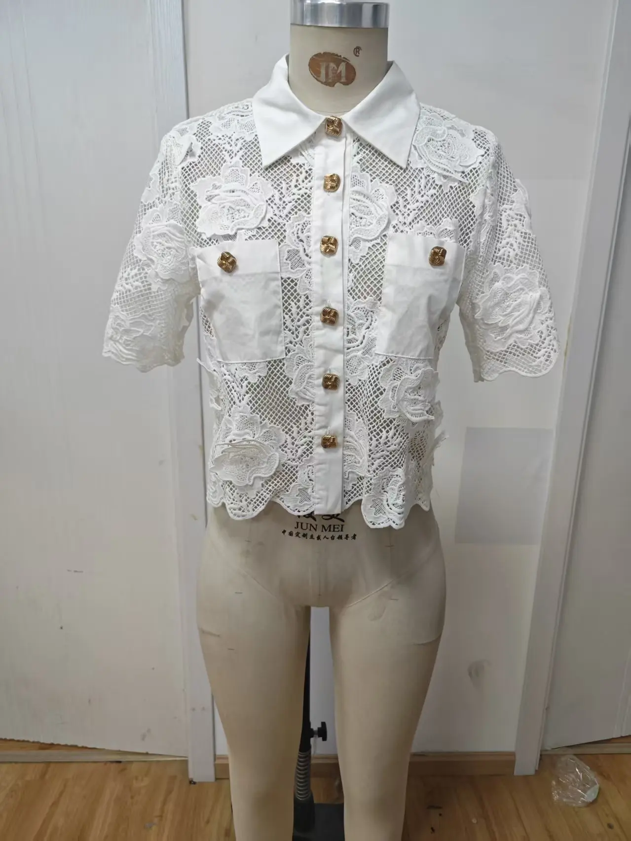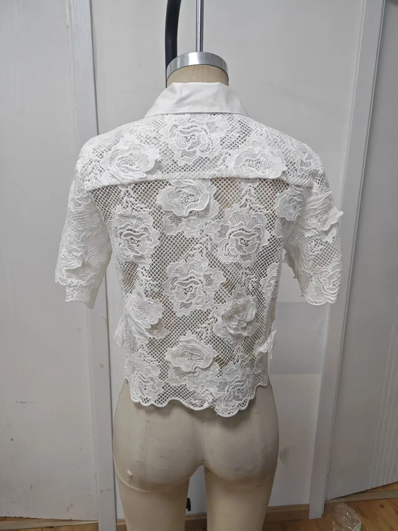 Summer Ladies Casual Blouse Lace Hollow Short Sleeve Turn-down Collar Woven Breathable Fashionable for Daily Wear