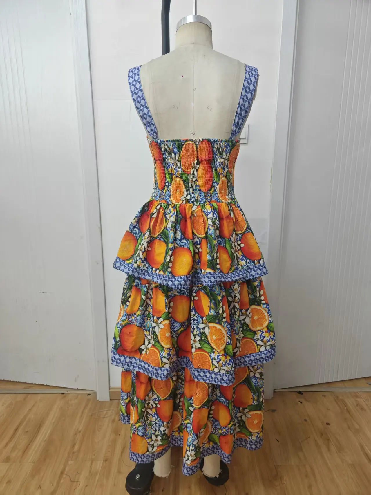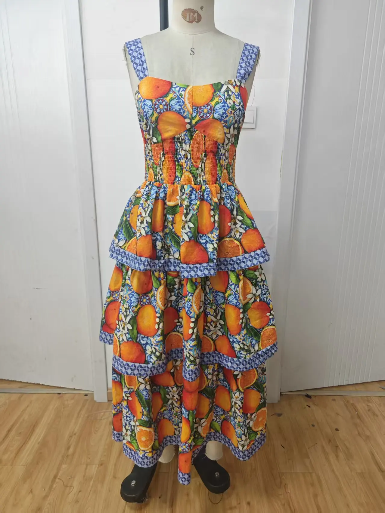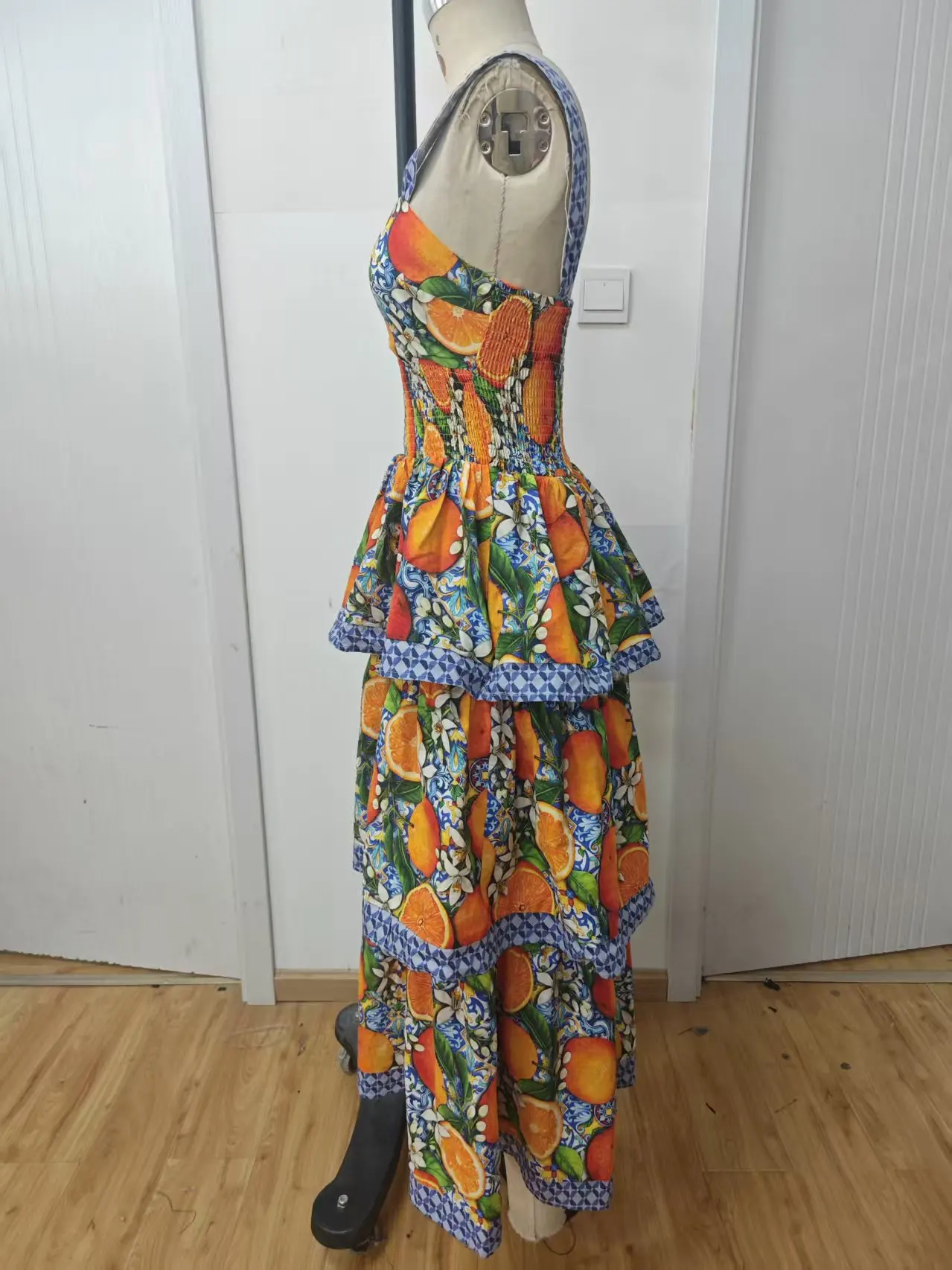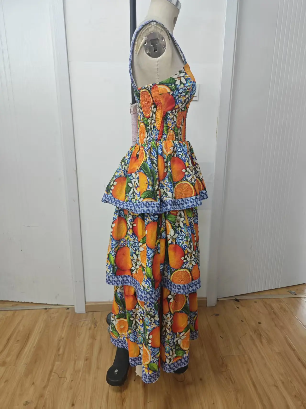 Women's Summer New Fashionable Slim Fit Long Skirt Casual Style Fruit Print Pattern Ruffled Chiffon