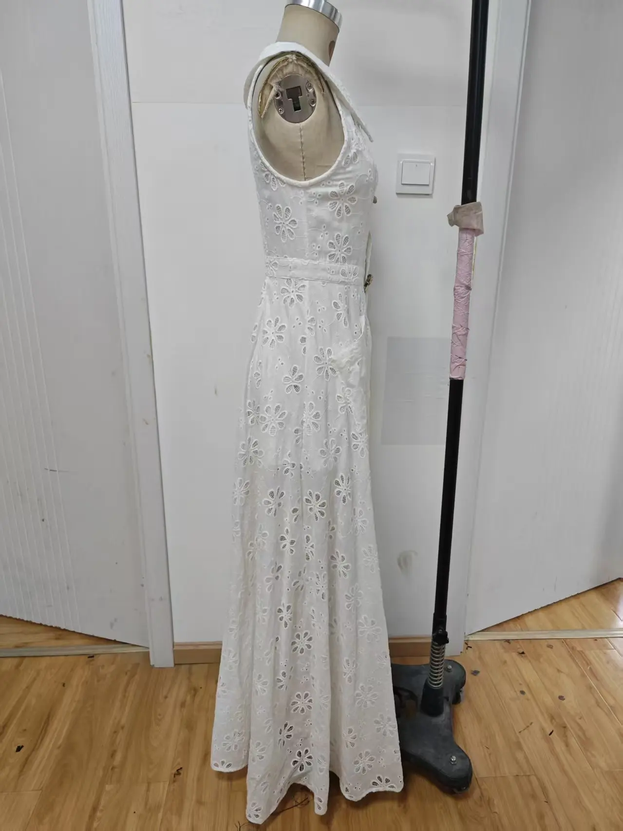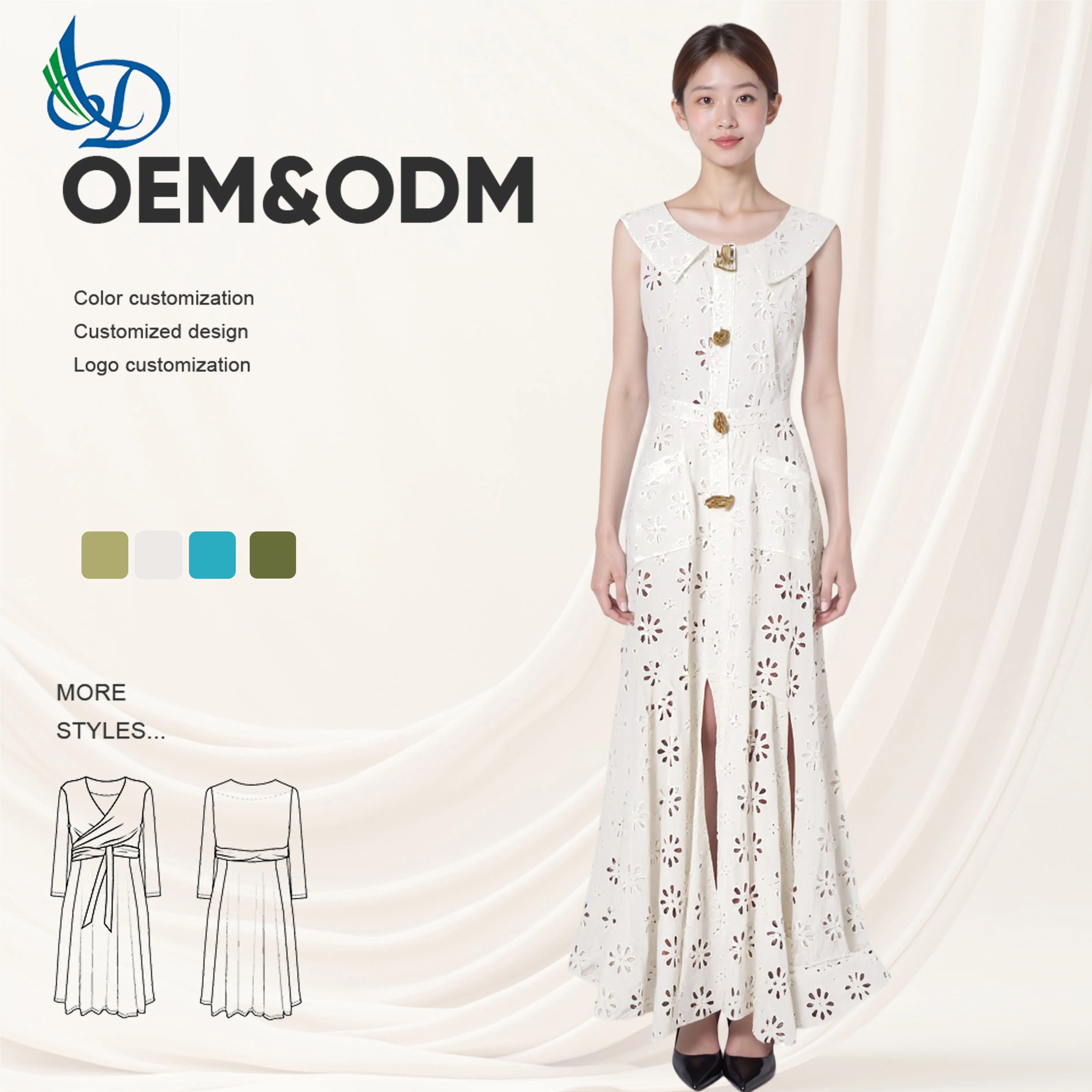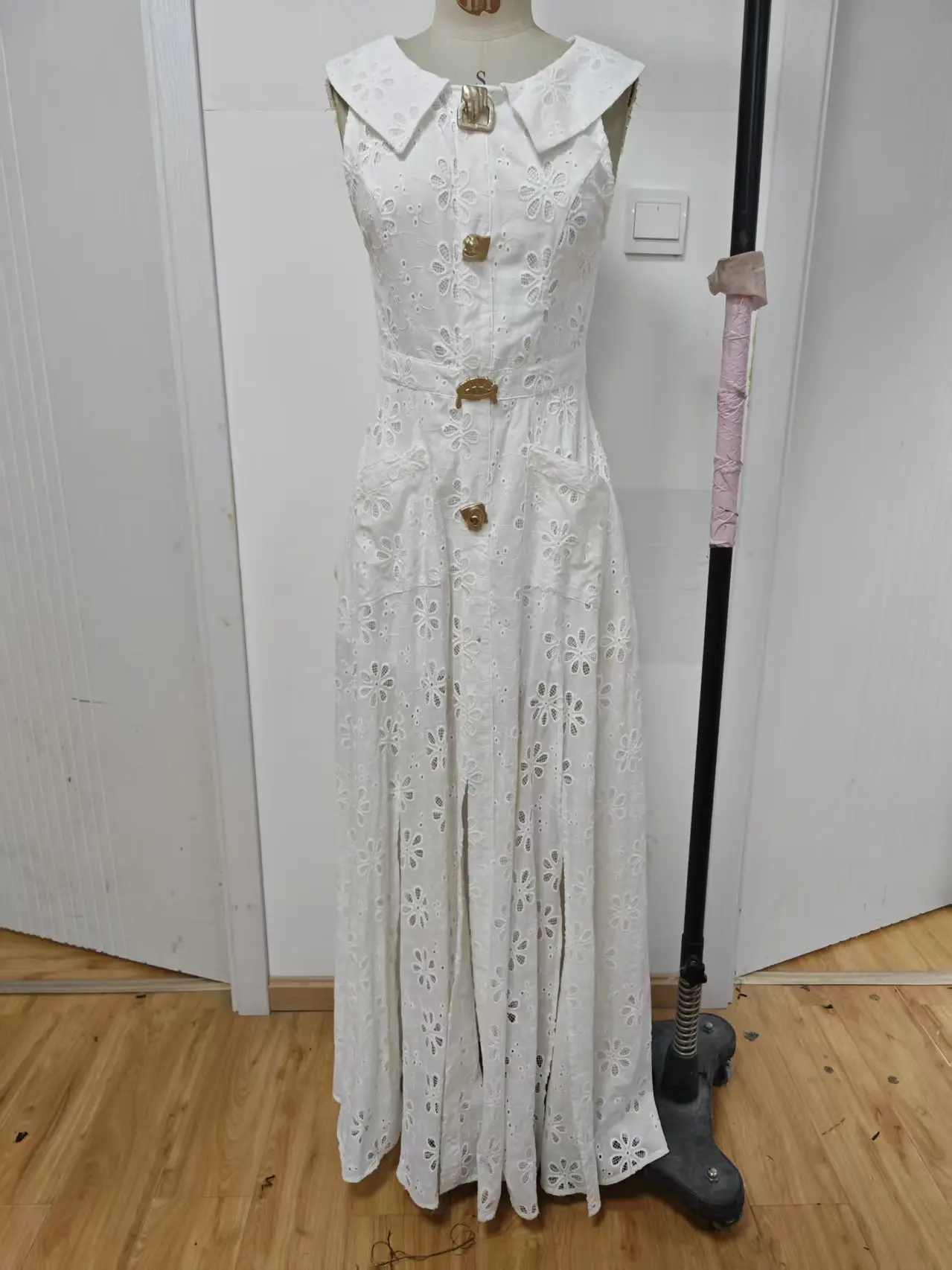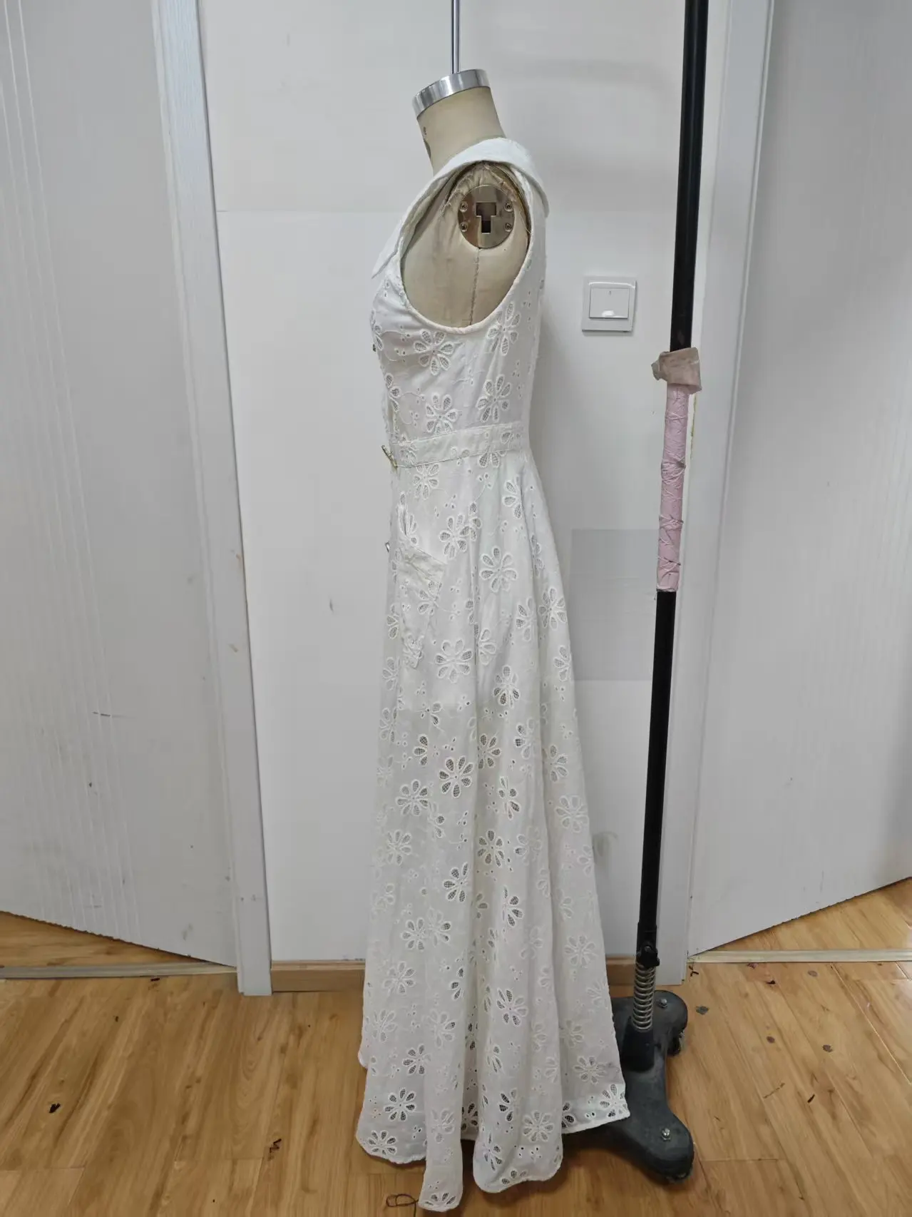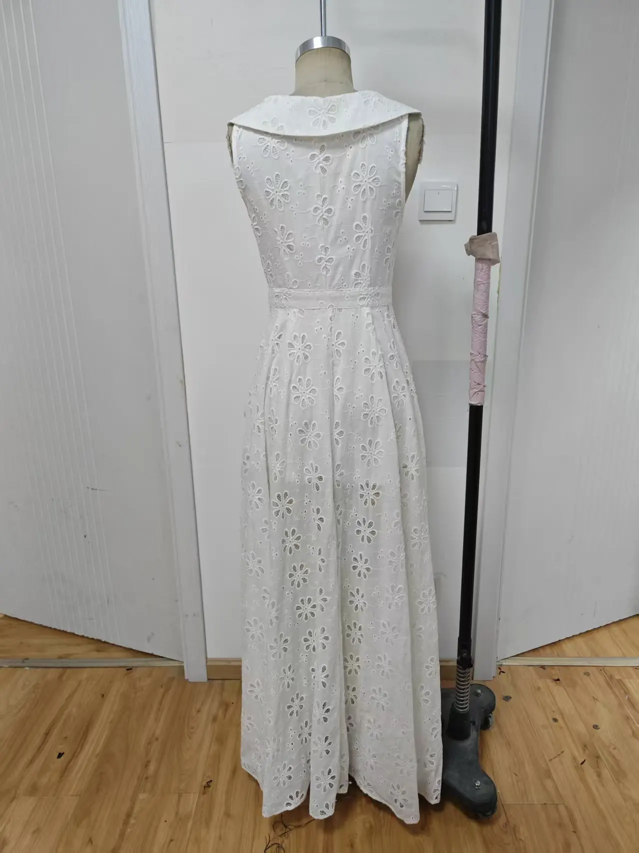 Women's A-line Sleeveless Long Skirt with Lapel Pocket Solid Color Dress