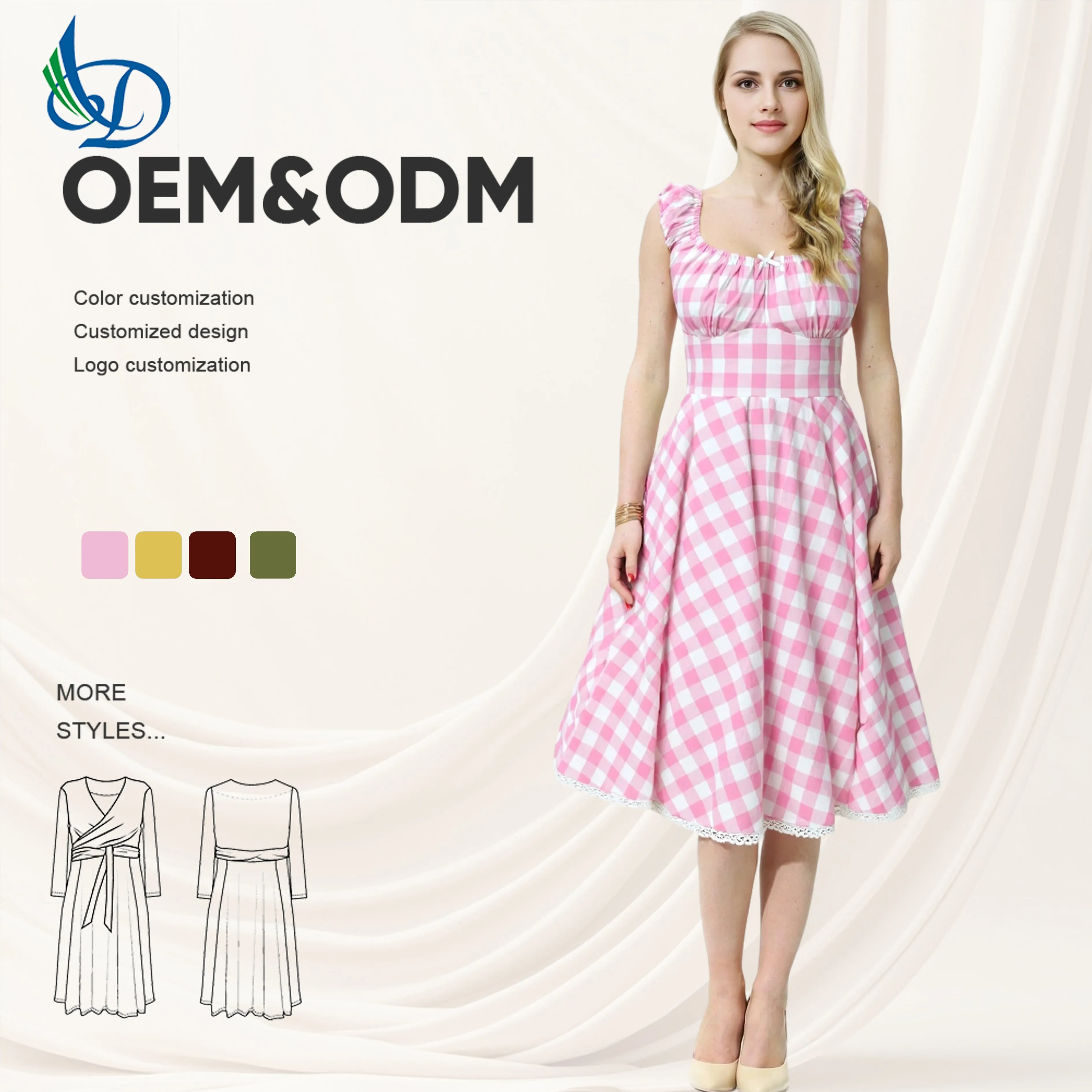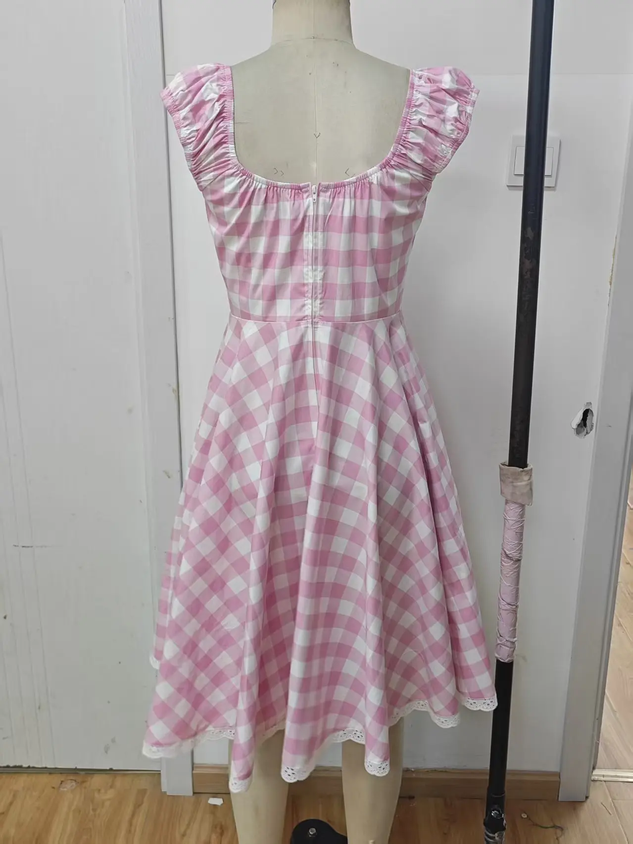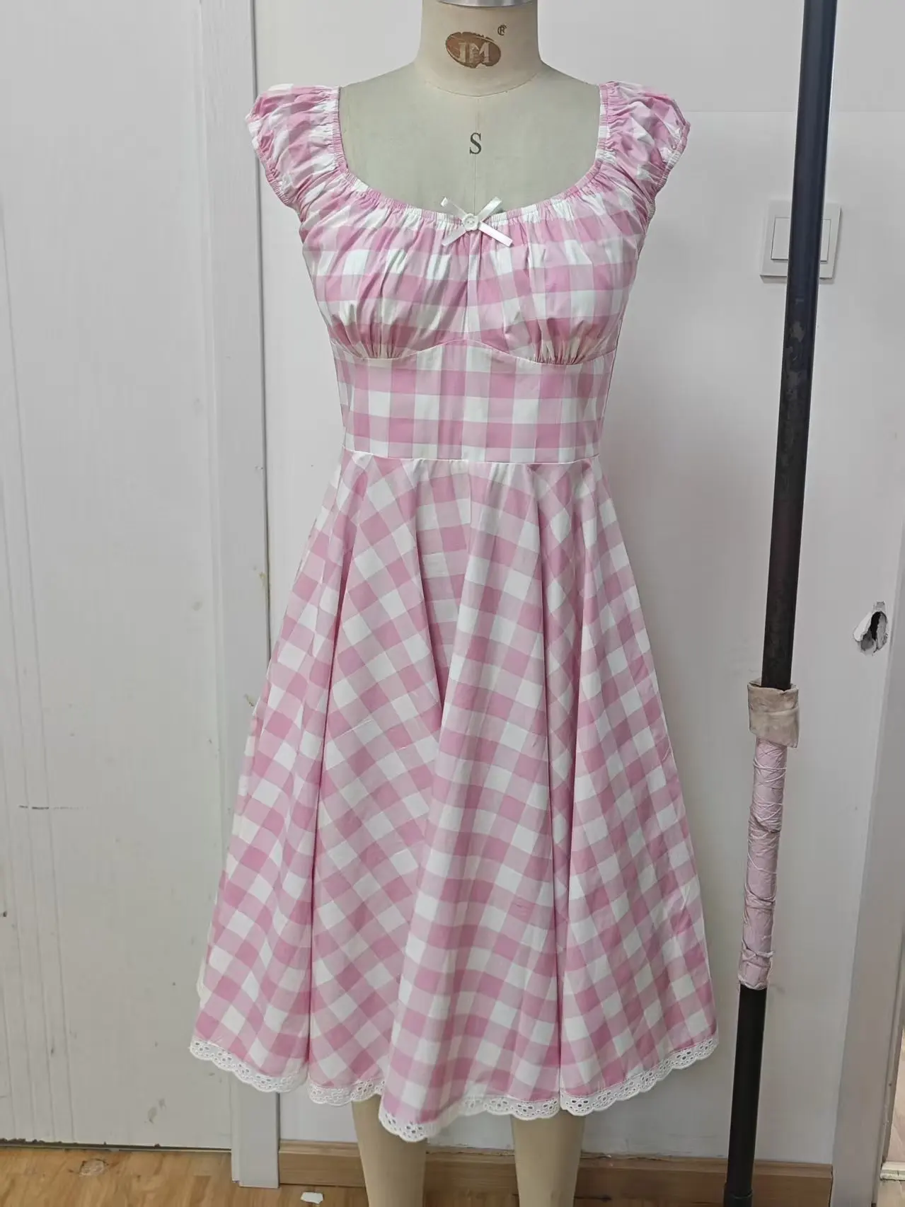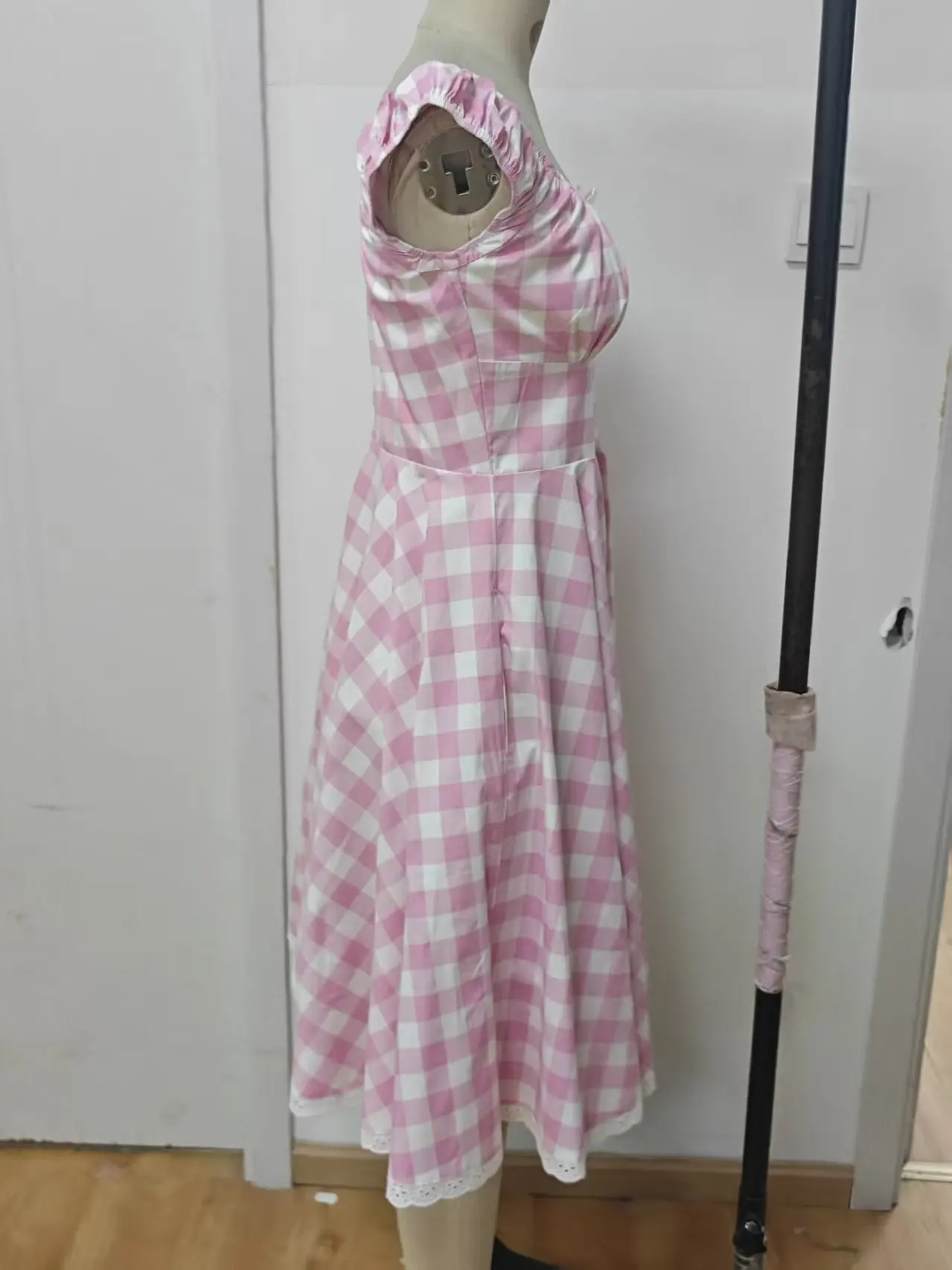 Summer Women's Retro Short Sleeved Checkered Printed Dress, Knee Length