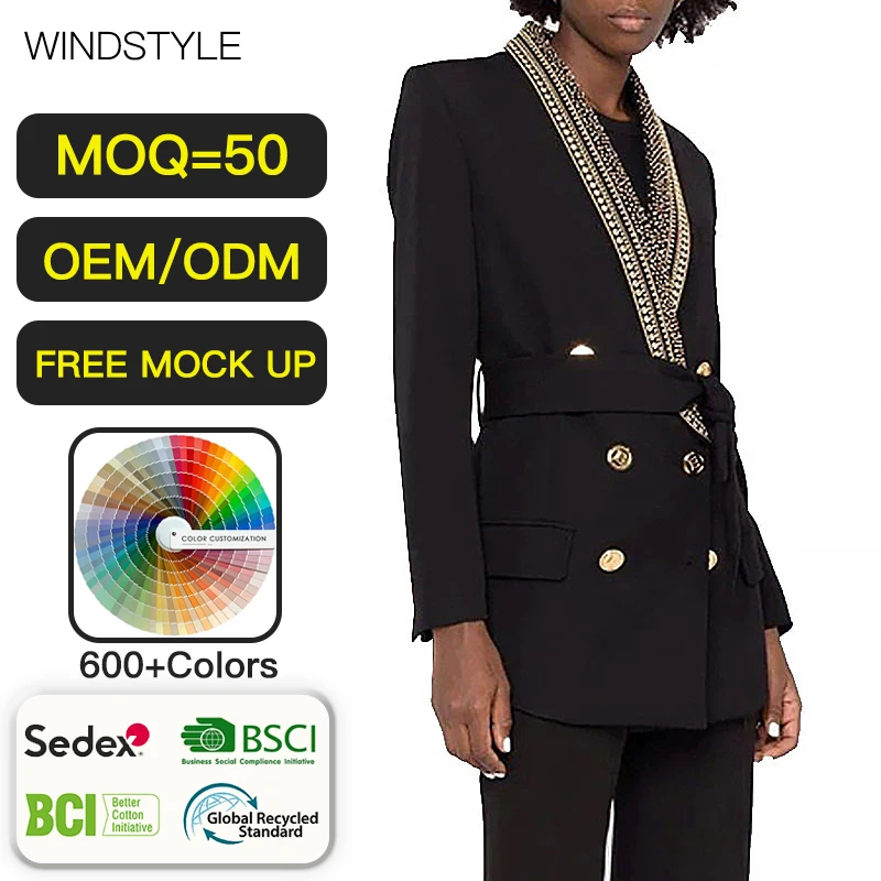 Fashion Women's Long Coat Suit with Stamped Belt Collar Hot New Double-Breasted Blazer Solid Pattern Woven Buttons Decoration