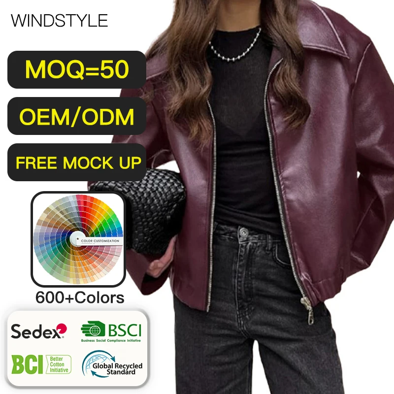 Women's Retro Burgundy Waterproof Zipper Windbreaker Autumn Fashionable Matte Leather Coat Hip Hop Style Dyed