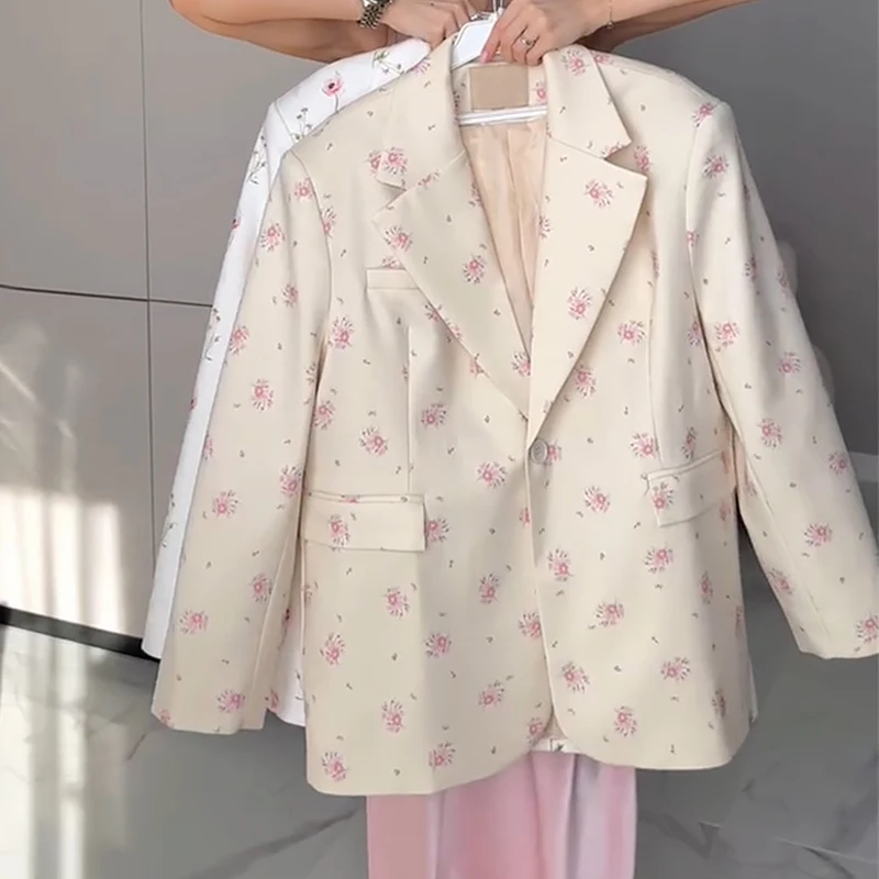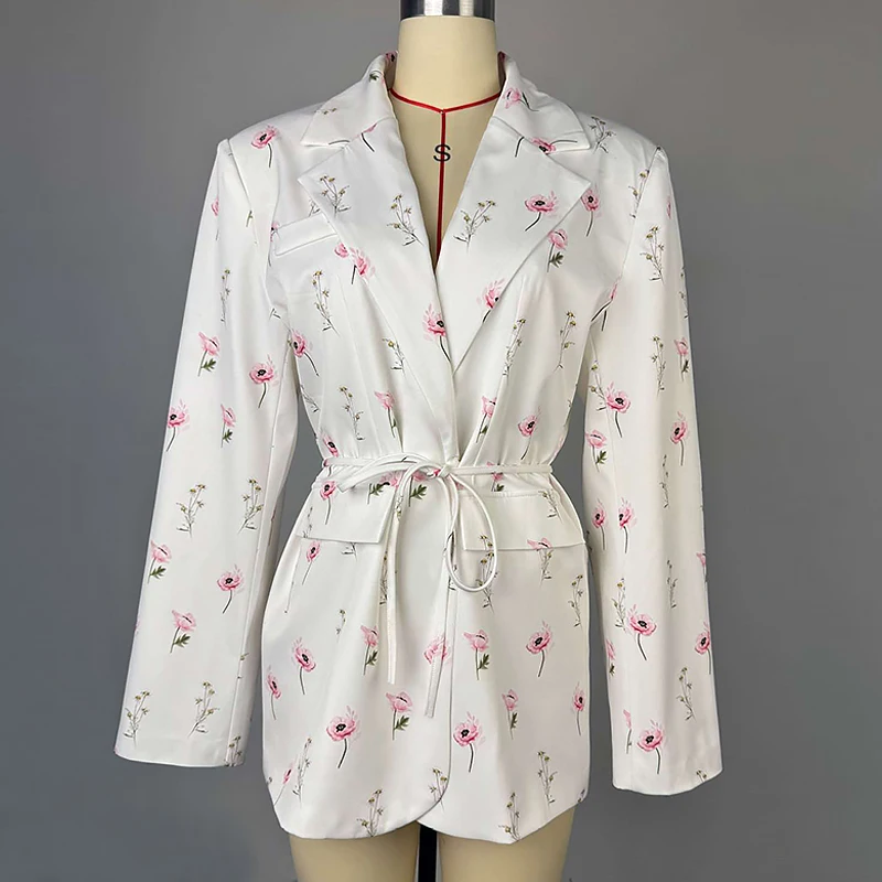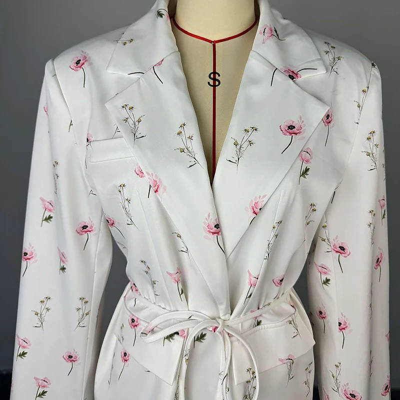 Autumn Casual Fashion Printed Loose Suit with Lace-Up Waist Jacket Breathable Woven Fabric Button Decoration