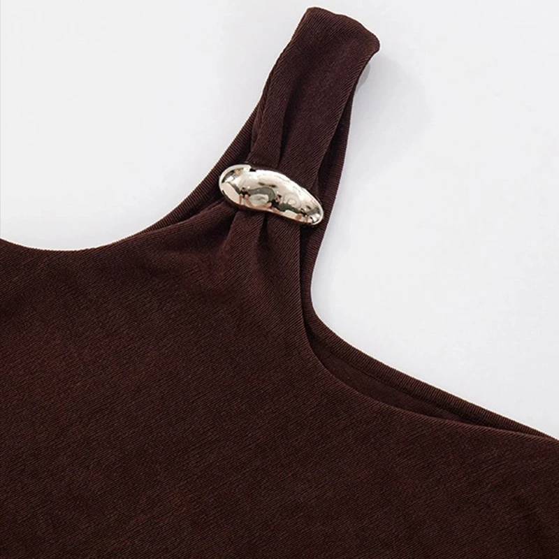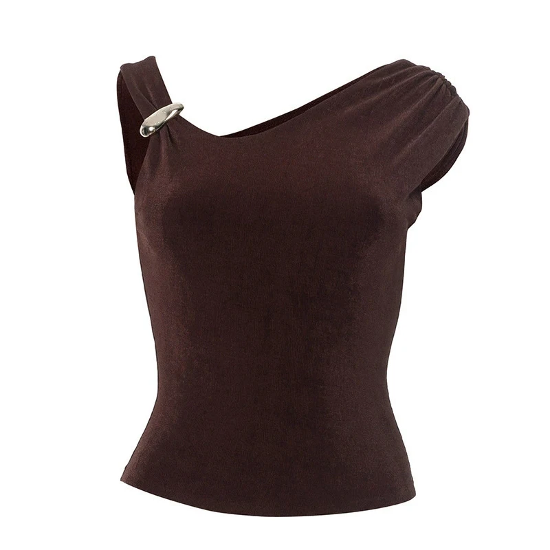 Slim Sexy Beautiful Brown Women's Satin Top with Slant Shoulder Sleeveless Design Breathable Short Length Tank Top Square Collar