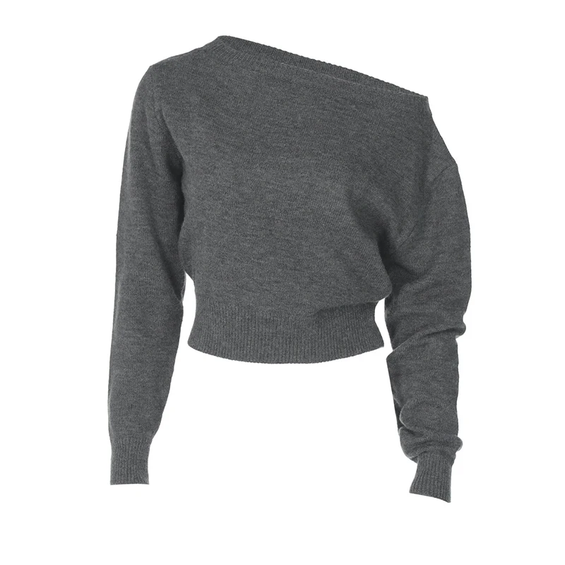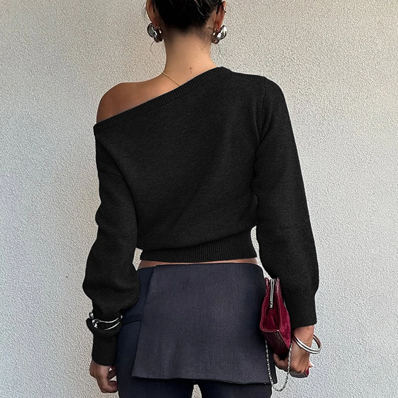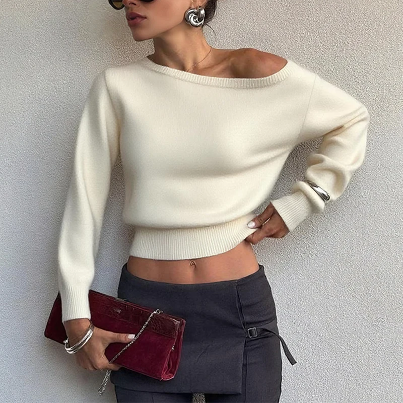 Fashion Simple Temperament Slim Hot Girl Navel Diagonal Collar Long Sleeve Top Breathable Polyamide Short Length Asymmetrical