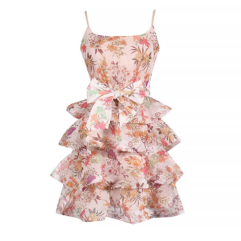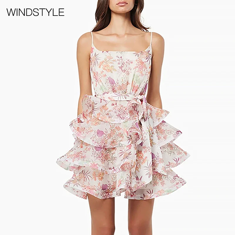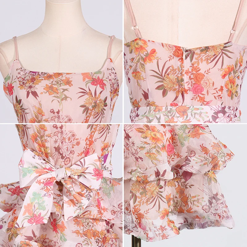 Women's Casual Summer Midi Dress Floral Halter Skirt Lace-up Waist Flounce Style Woven Breathable Fabric OEM Service Available