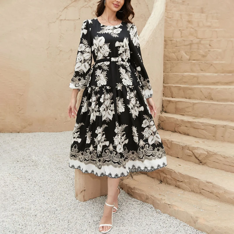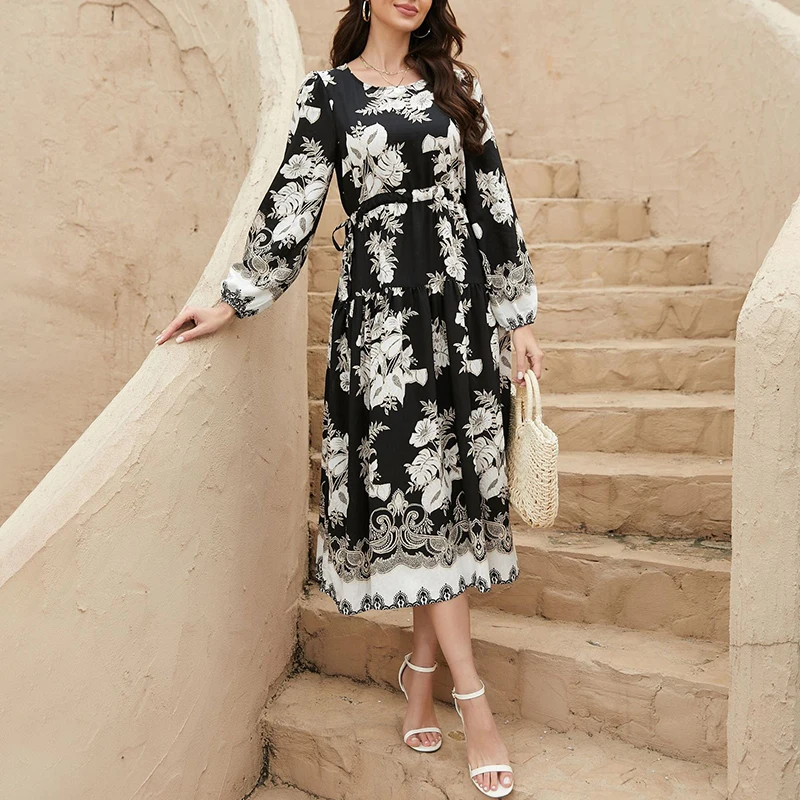 Crewneck Waist Drawstring Elegant Floral Mid-Length Dress Loose Summer Casual Swing Knee-High Viscose Woven Pattern