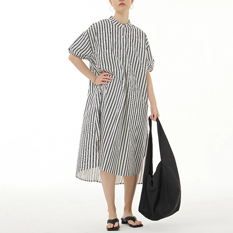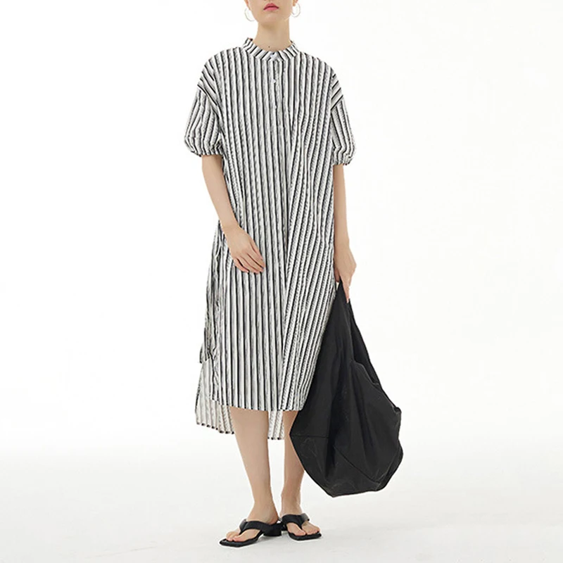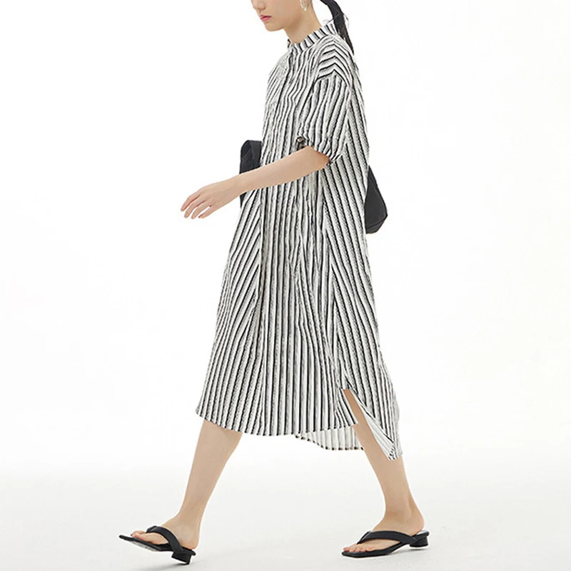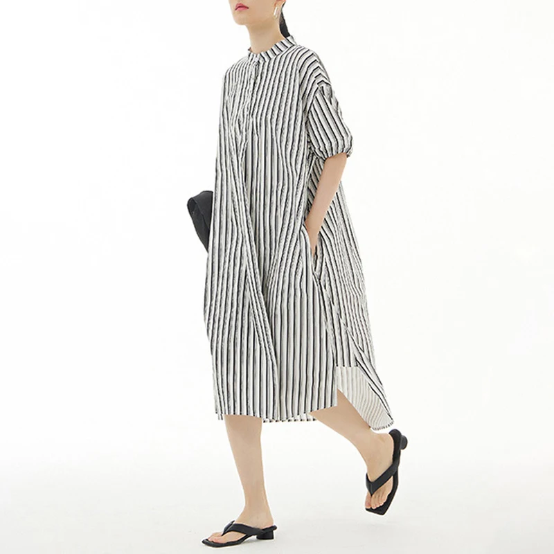 Women's Large Size Side Slit Dress European American Style Loose Slim Vertical Design 100% Cotton Knee-Length Solid Summer
