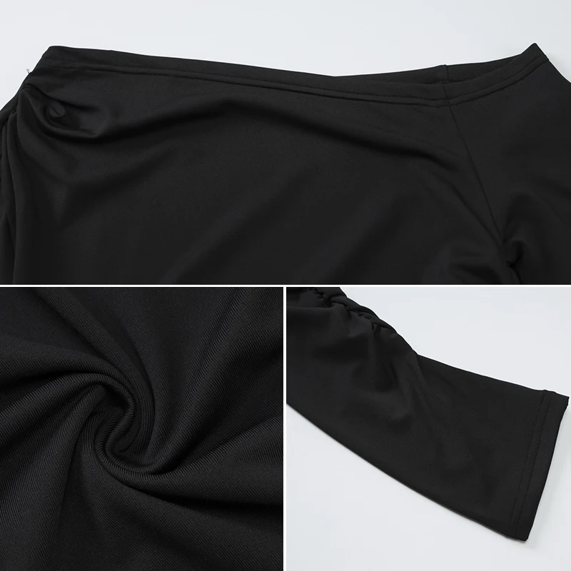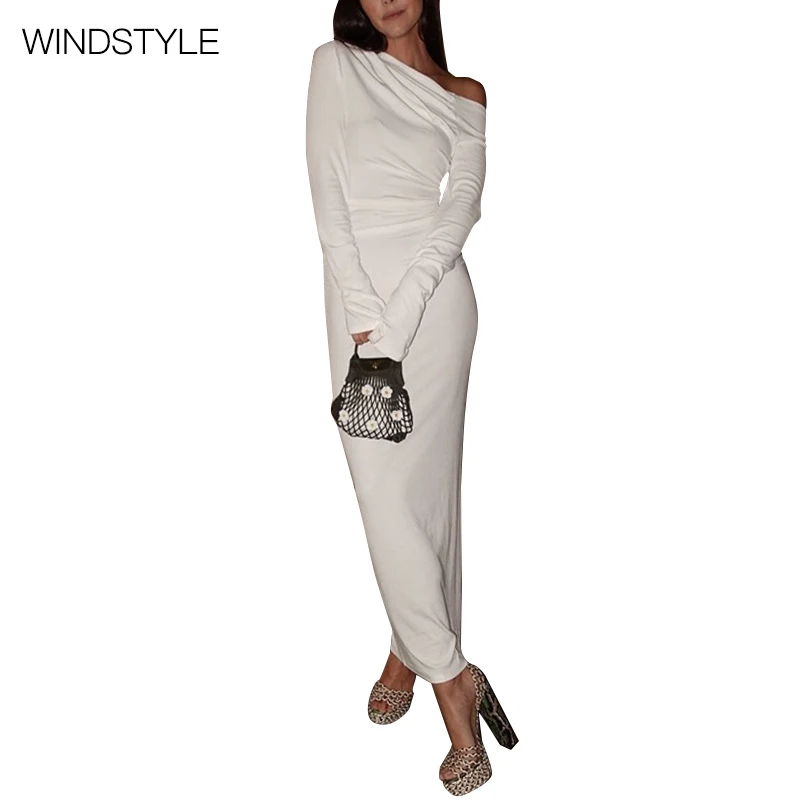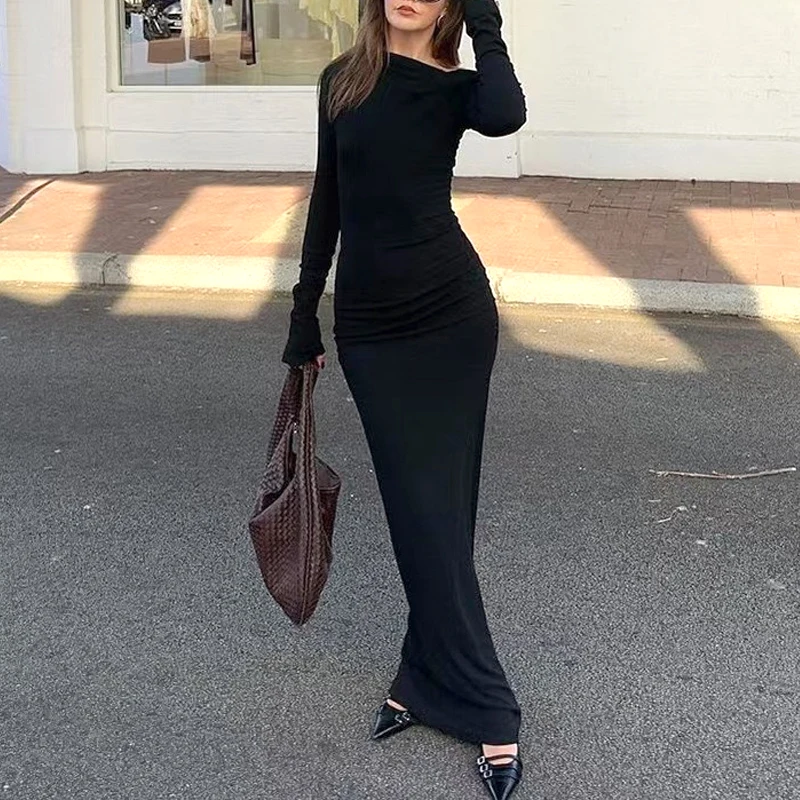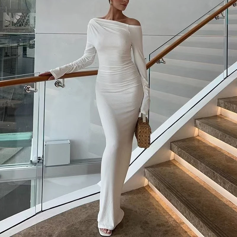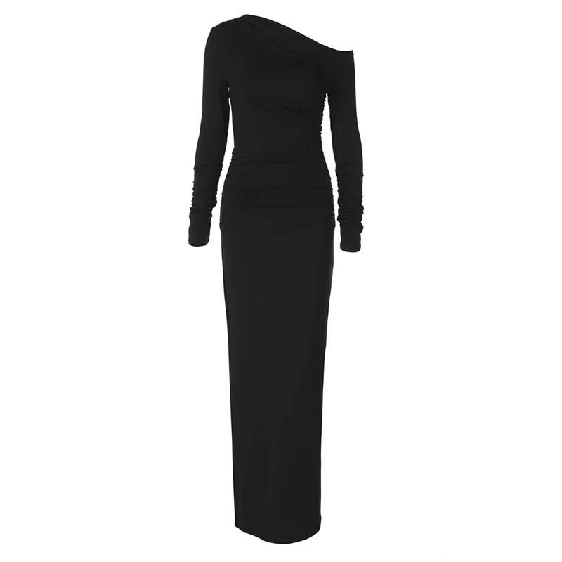 ZYHT 73849 European Wholesale Fashion Casual One Shoulder Ruched Maxi Dress Side Slit Pleated Long Sleeve Dresses for Women