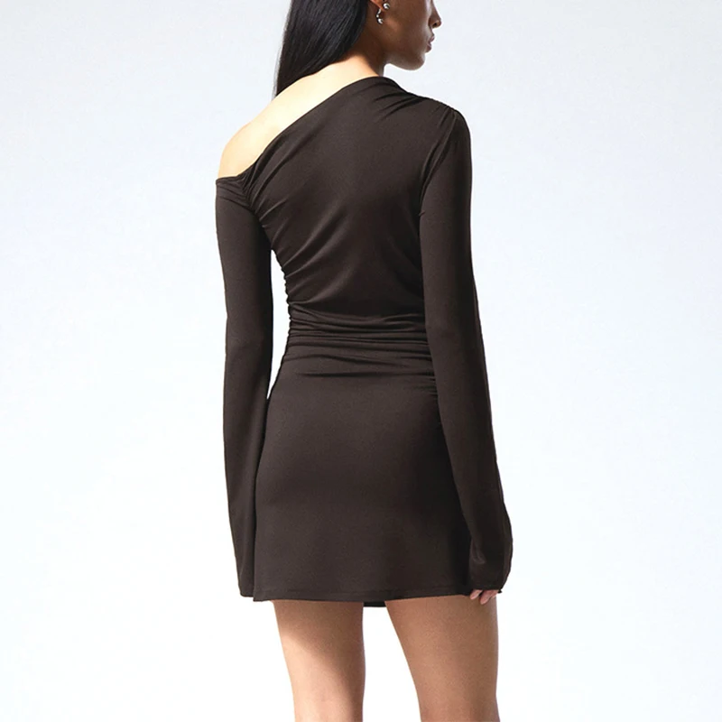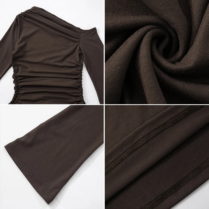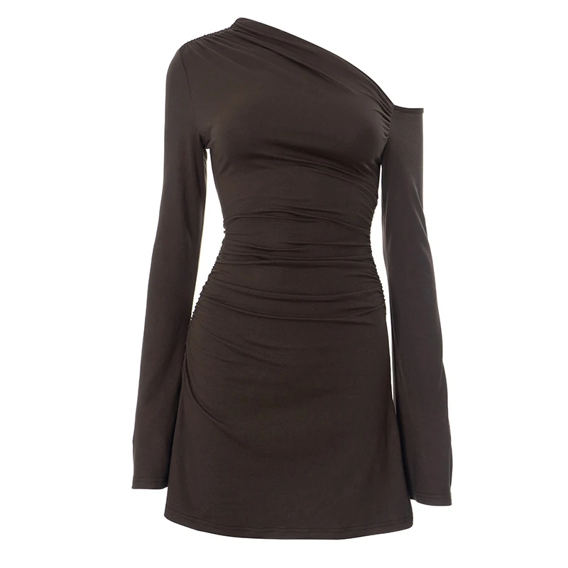 ZYHT 73849 European Wholesale Fashion Casual One Shoulder Ruched Maxi Dress Side Slit Pleated Long Sleeve Dresses for Women