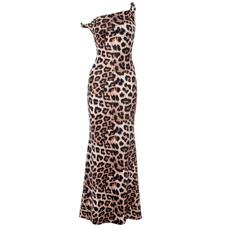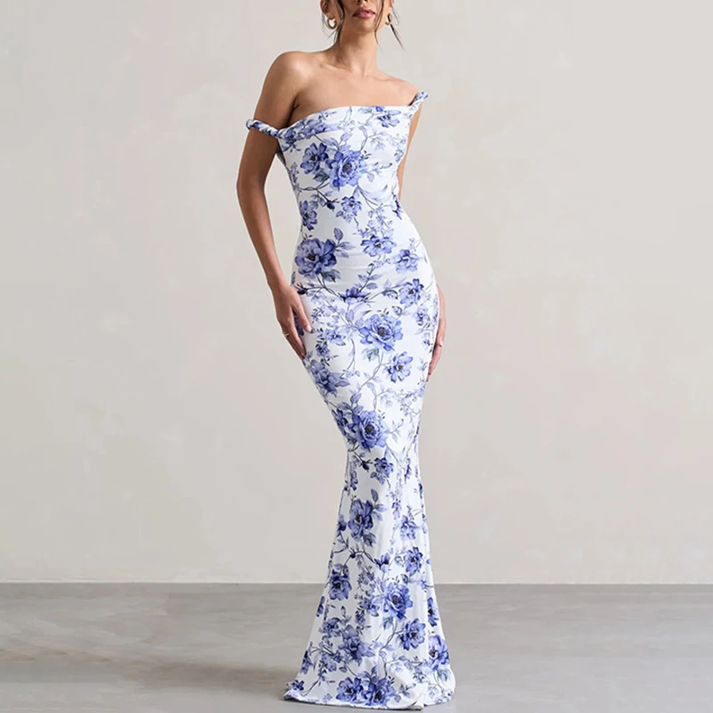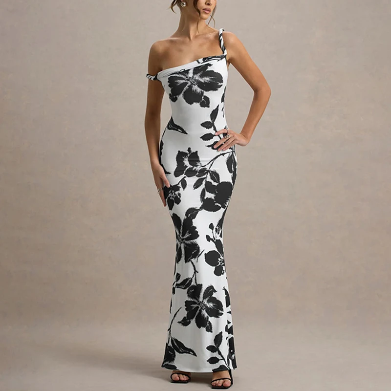 Hot Girl Fashion Long Dress Asymmetrical Neckline Slanted Shoulders Sexy Hip Lines Waist Expensive Appearance Summer ODM