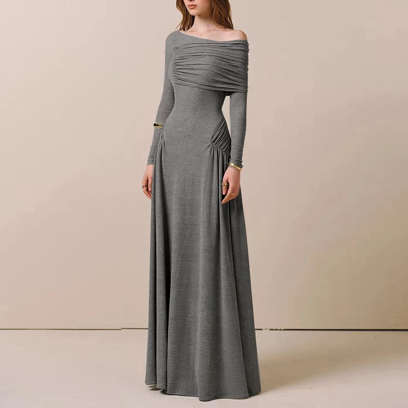 ZYHT 73849 European Wholesale Fashion Casual One Shoulder Ruched Maxi Dress Side Slit Pleated Long Sleeve Dresses for Women