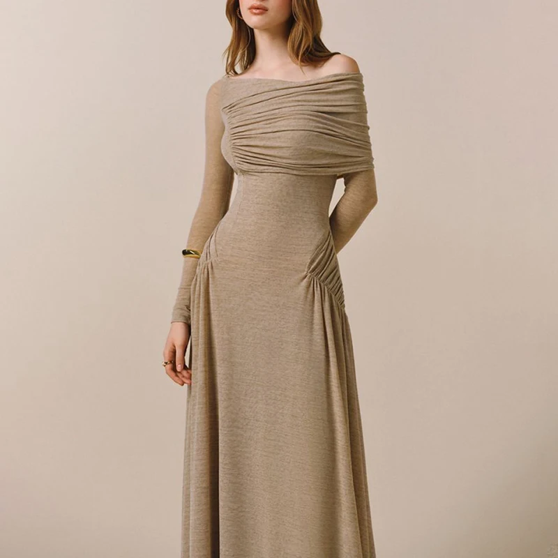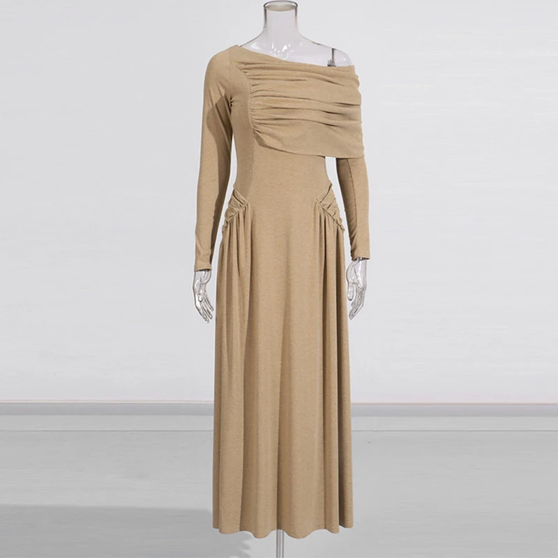 Women's French Sling Long Dress Asymmetrical Neckline Pleated Woven Solid Lag Shoulder Design for Day Parties Spring Autumn