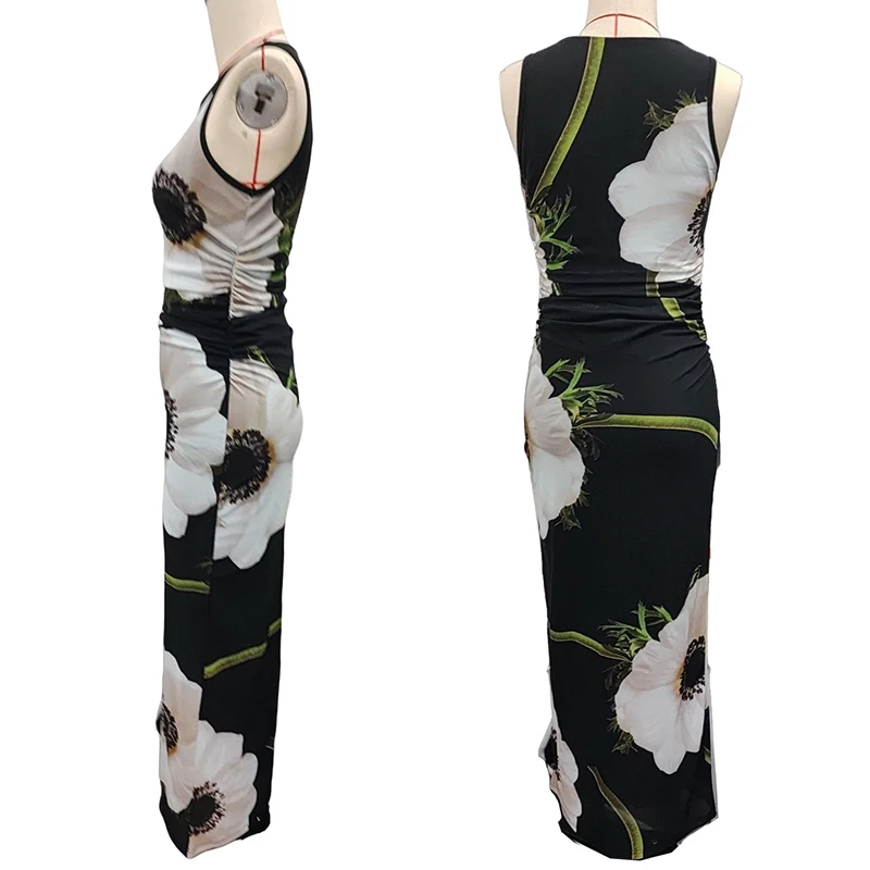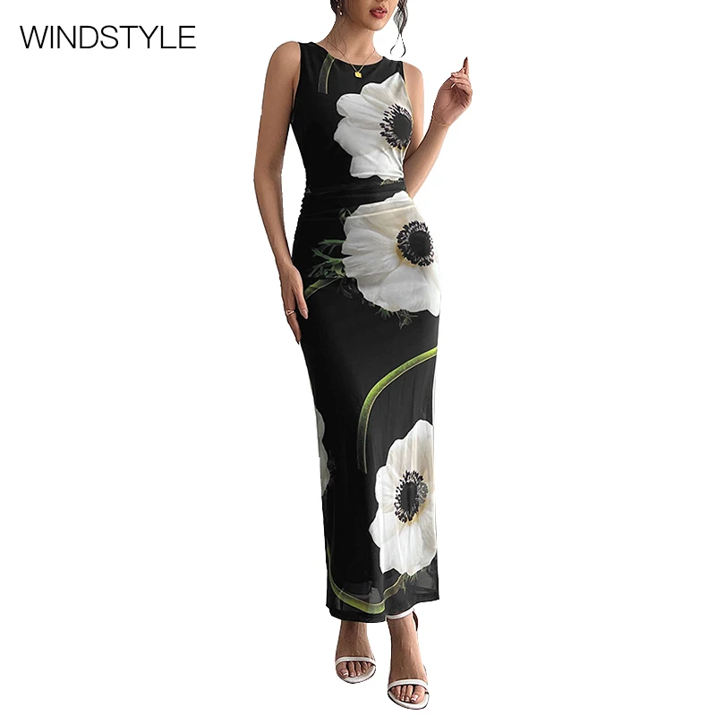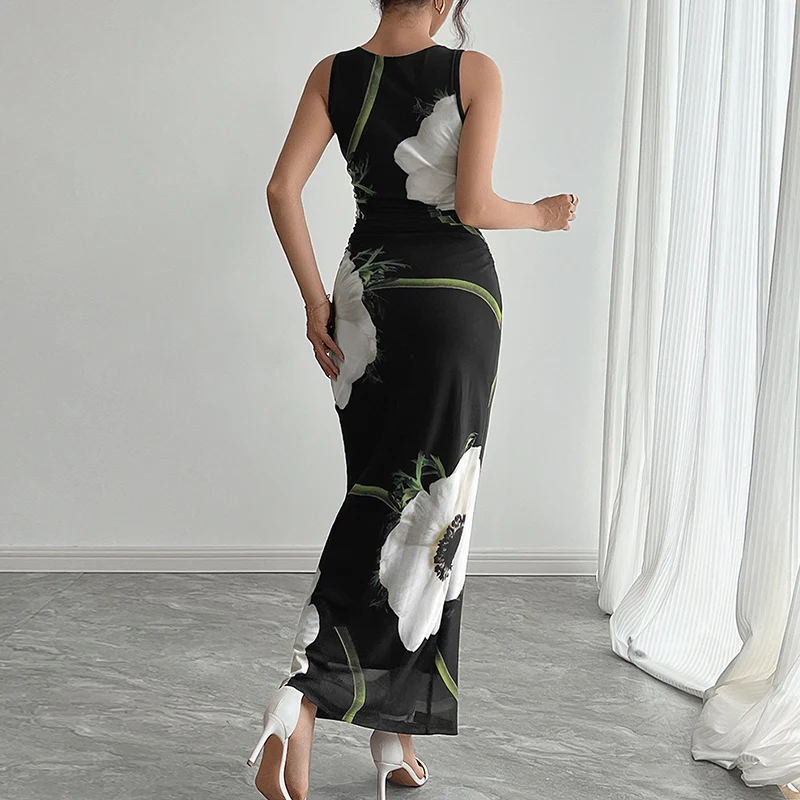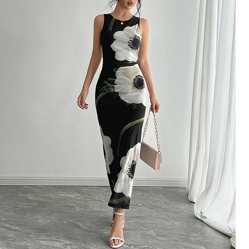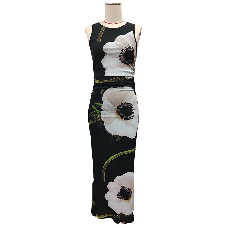 Women's Casual Black Mesh-Print Sleeveless Dress Knee-Length Halter Lace Zipper Breathable Summer OEM Service Available