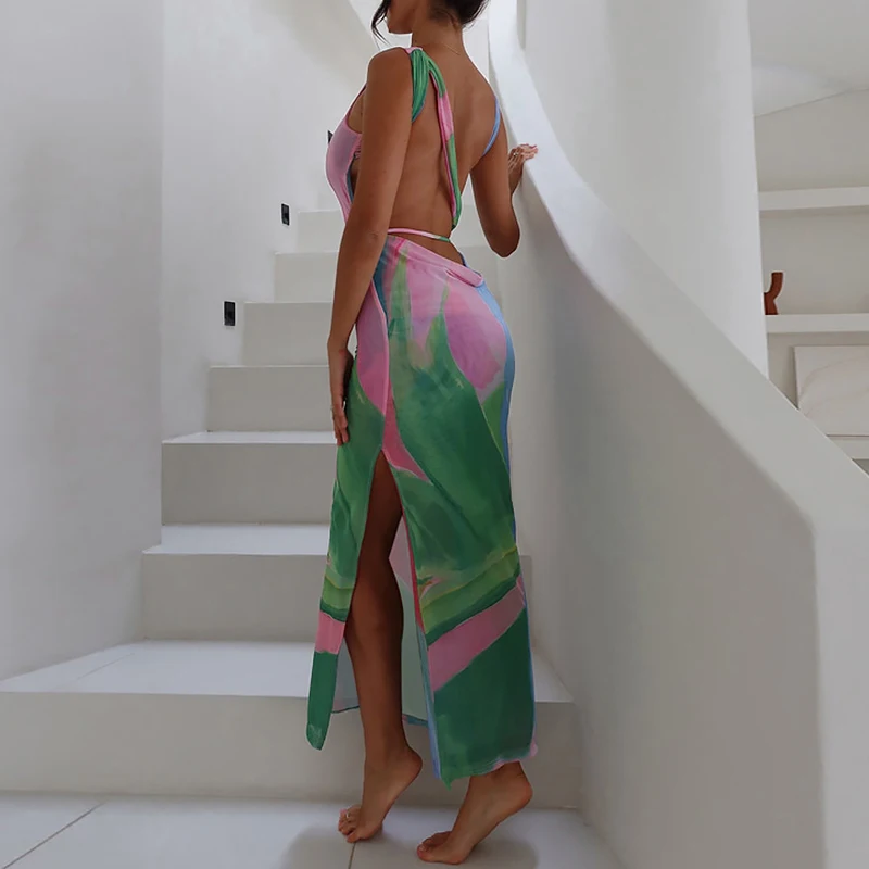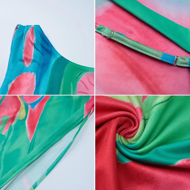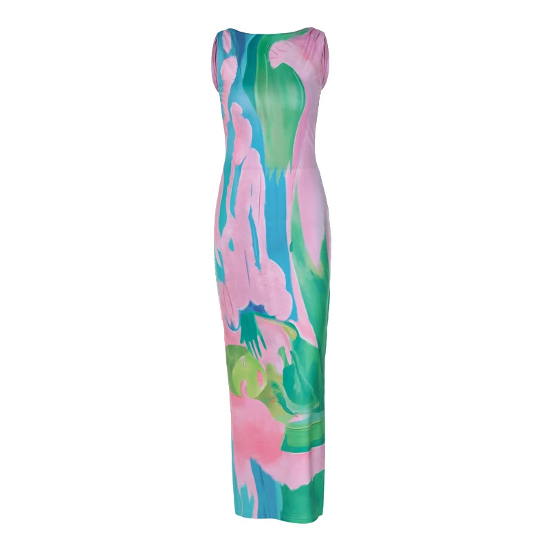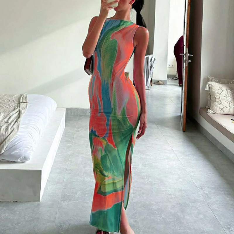 Summer Elegant Satin Dress Sexy Side Split Sleeveless Knee-Length Party Dress Breathable Woven Fabric Print Pattern Day