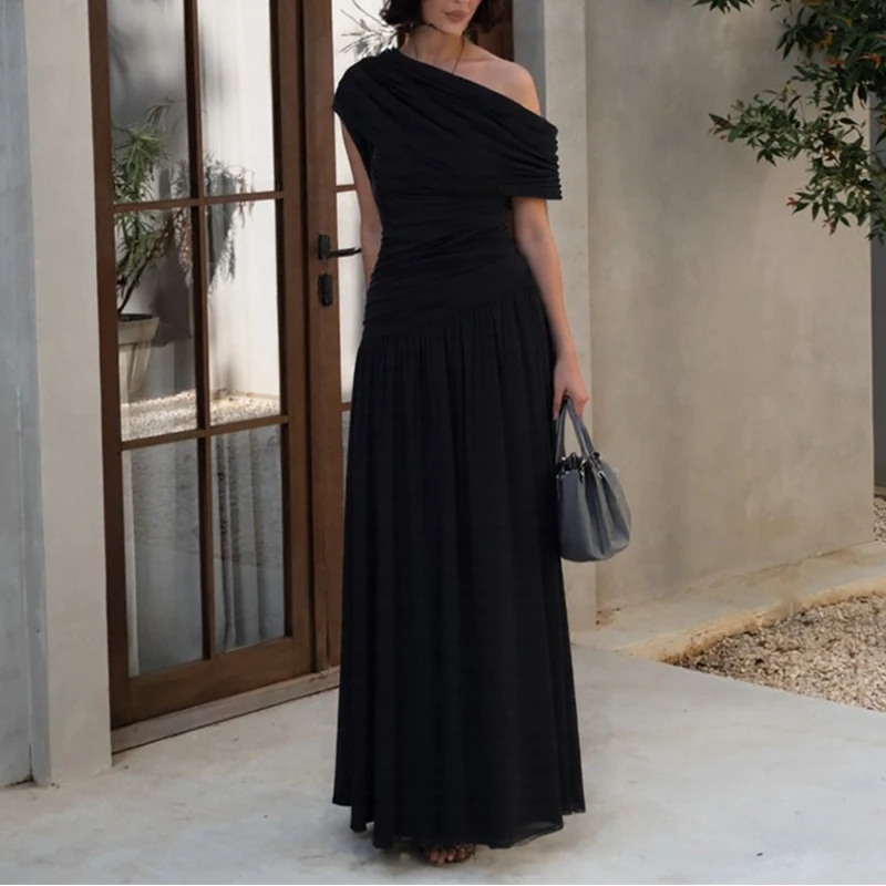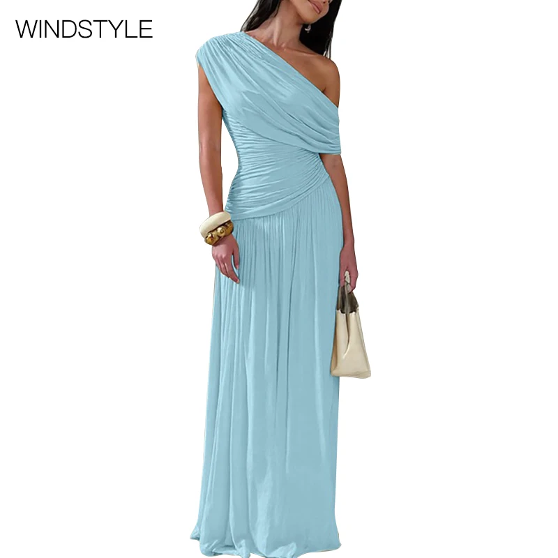 ZYHT 73849 European Wholesale Fashion Casual One Shoulder Ruched Maxi Dress Side Slit Pleated Long Sleeve Dresses for Women