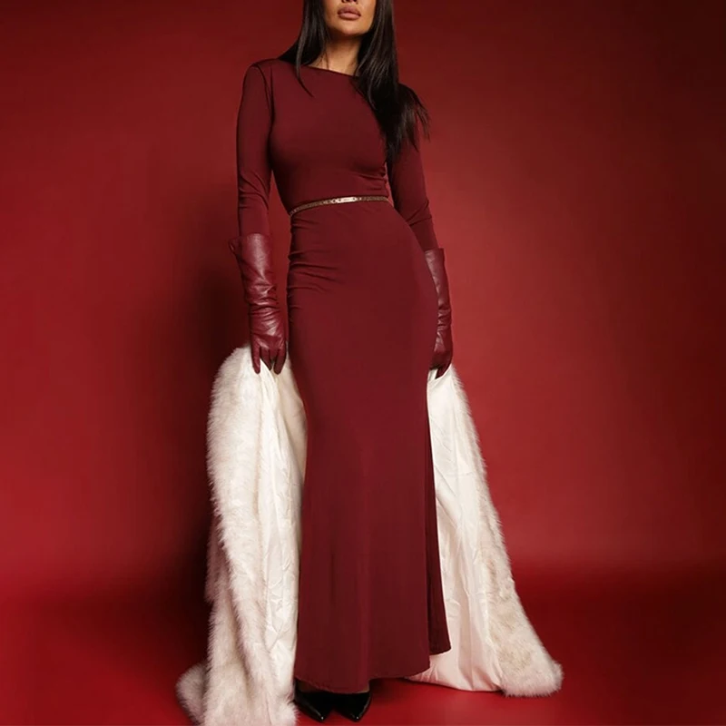 ZYHT 21541 Wholesale Crew Neck High Waist Casual Dresses Elegant Lace Velvet Mermaid Hem Ruched Long Sleeve Dresses for Women