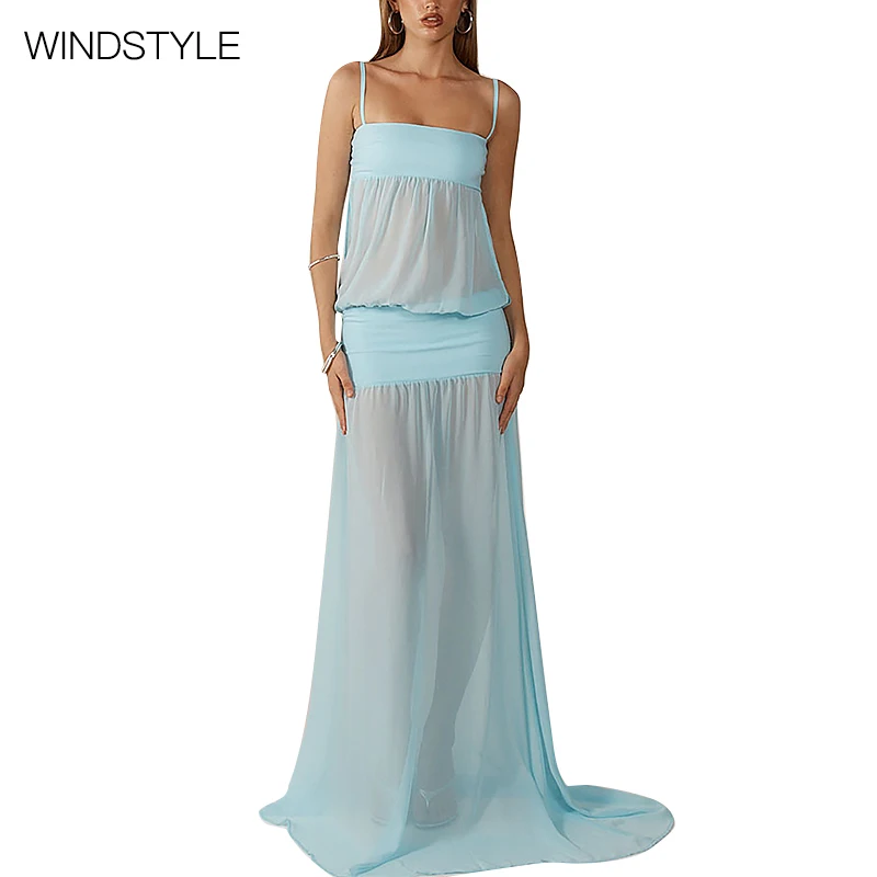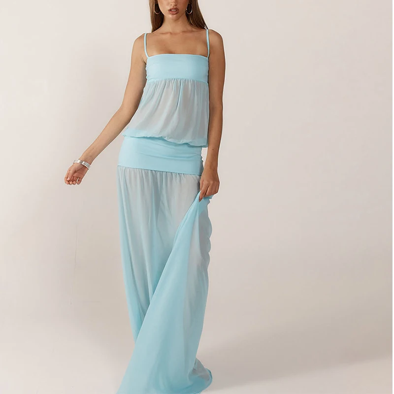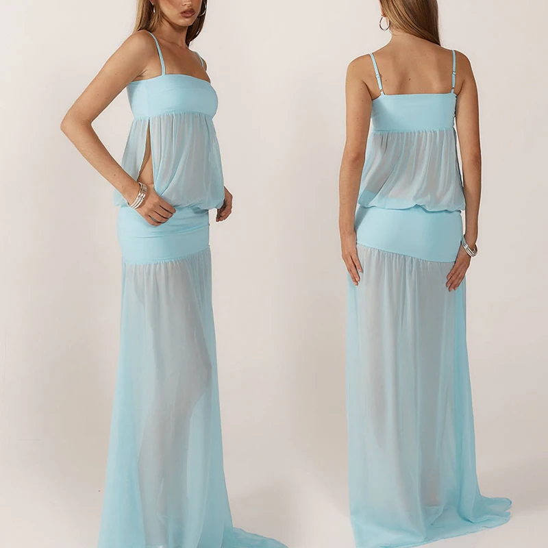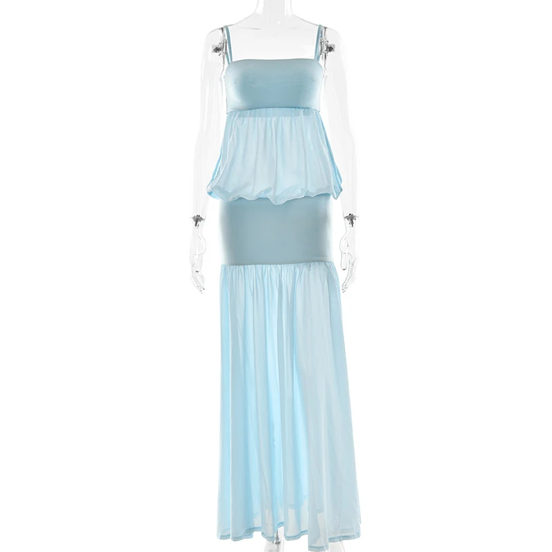 Perspective Fashion Strapless Sling Mesh Dress Solid Color Patchwork Satin Weaved Lace Floor-Length Party for Club Summer Sexy