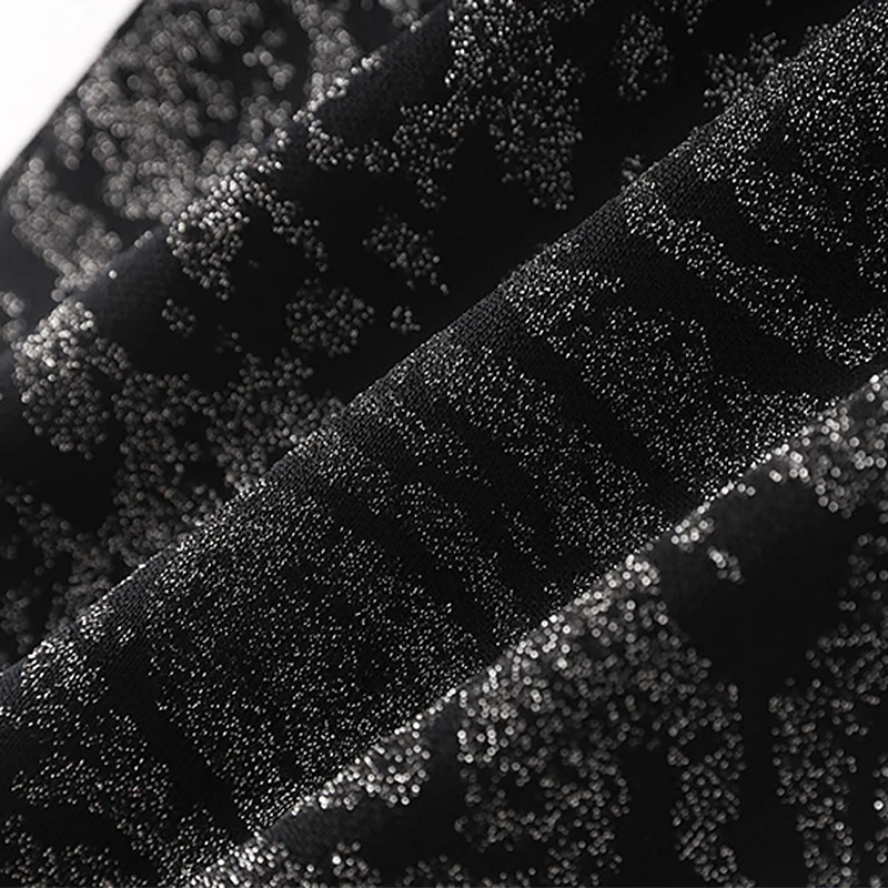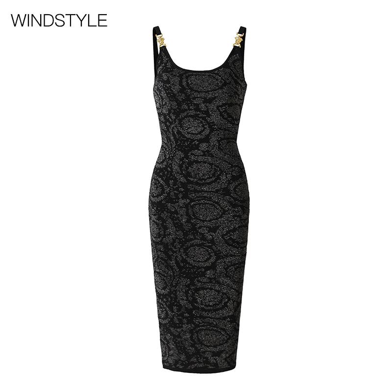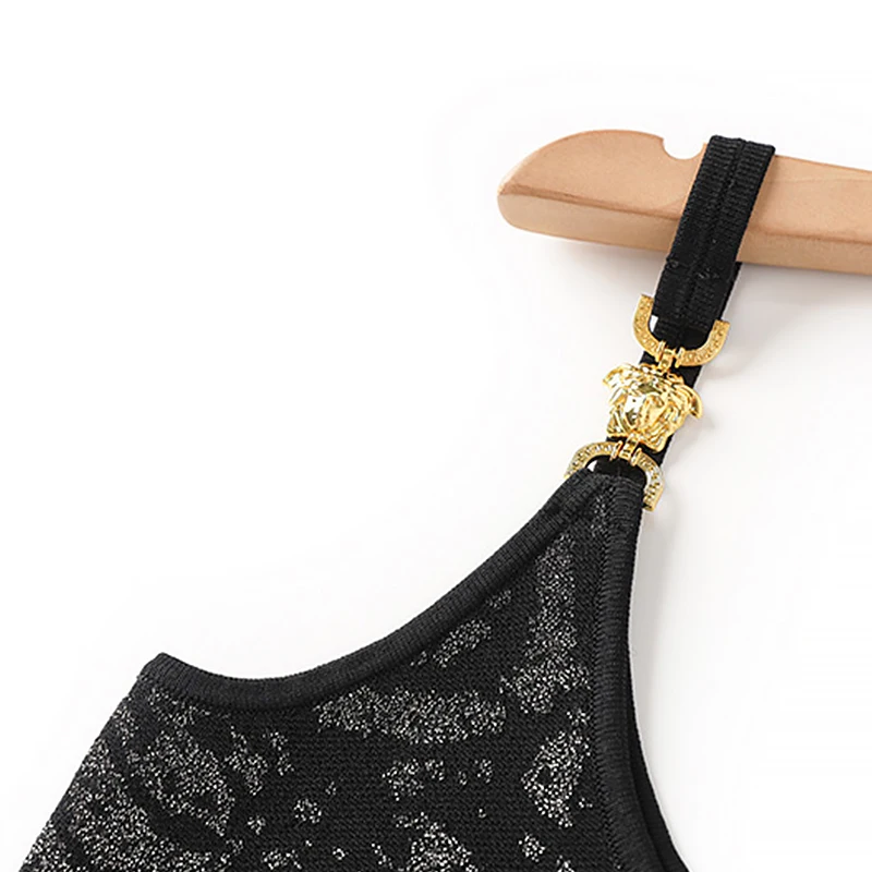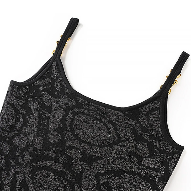 Custom Black Bright Silk Sling Metal Button Waist Knit Sexy Jacquard Design for Daily Spring Autumn Summer Wear-Knee-Length