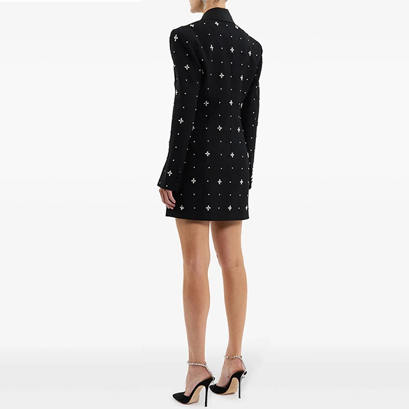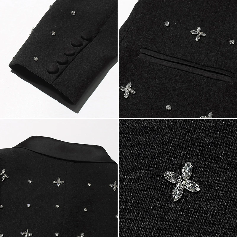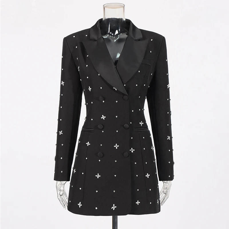 Women's Long Coat Inlaid Diamond Stitching Single Button Closure Solid Pattern Blazer Design Crystal Waist Dress Collar
