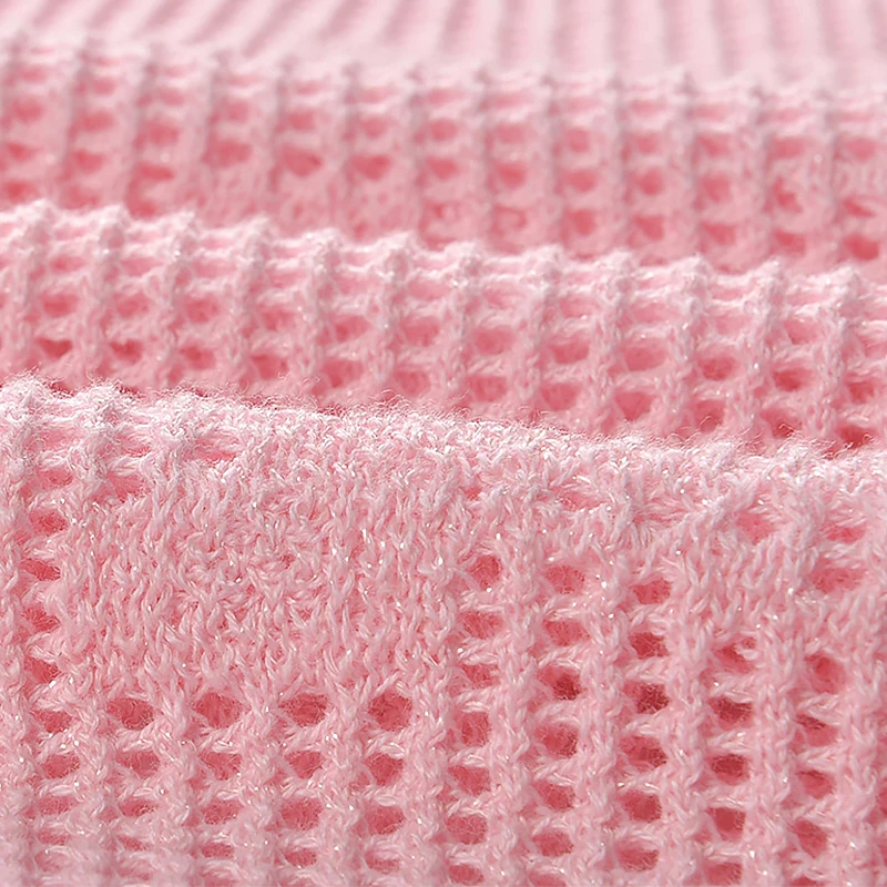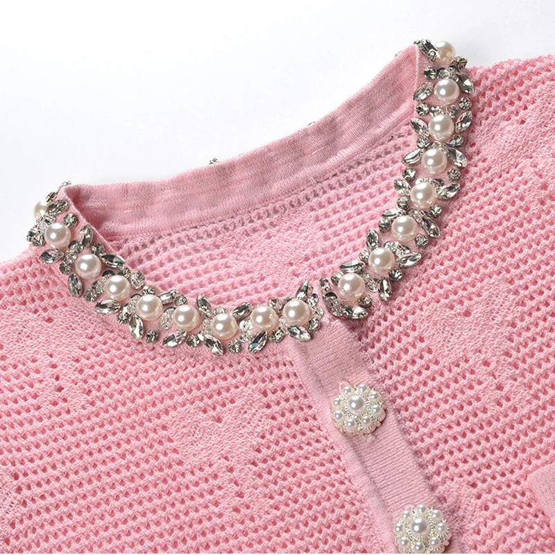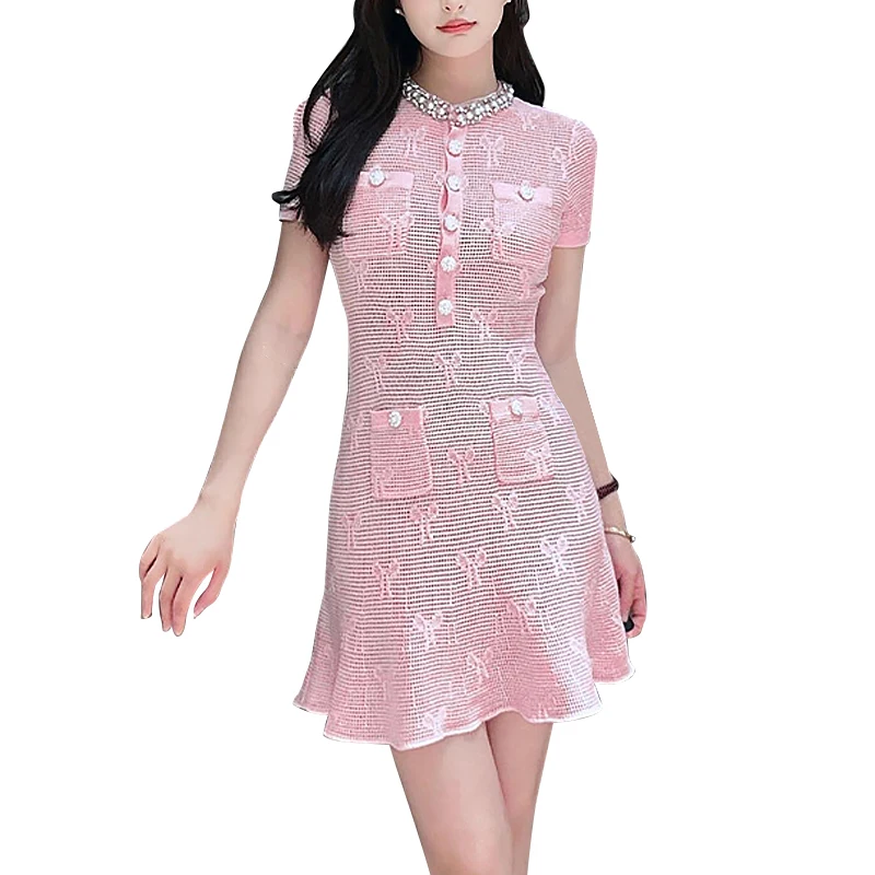 Custom Sweet Pink Crewneck Bow Jacquard Dress Breathable Midi Length Crystal Button Decorations Casual for Spring Summer Autumn