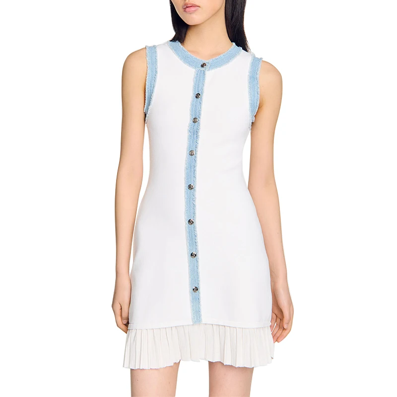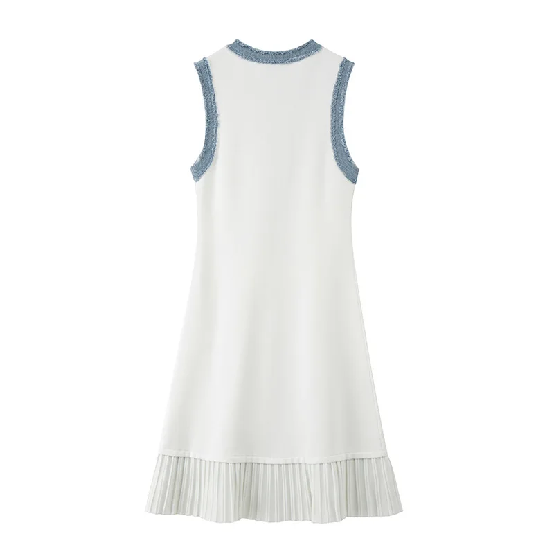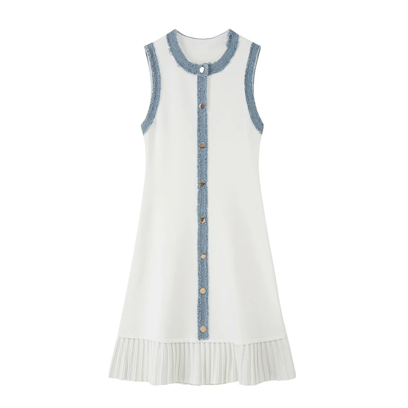 Elegant Floral Pattern Mid-Length Knit Dress Single-Breasted Sleeveless Crew Neck Pleated Detail for Spring/Summer White Outfit