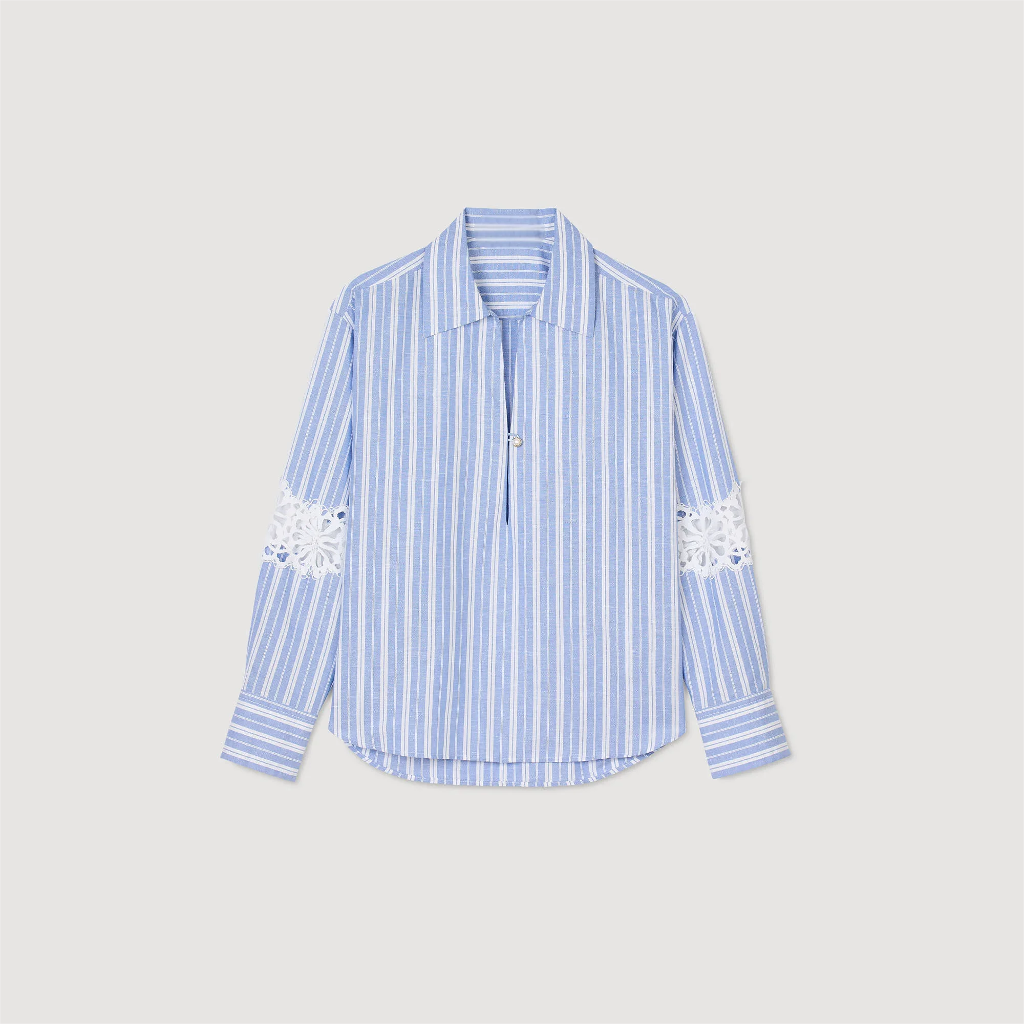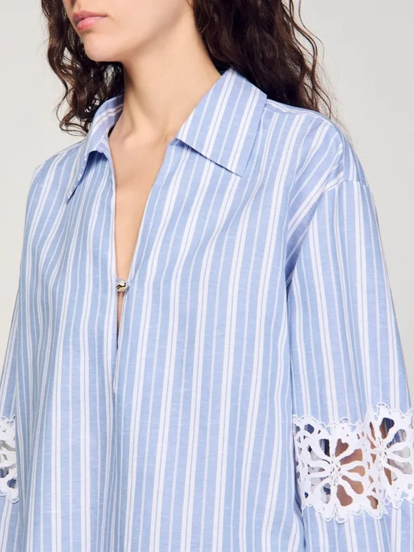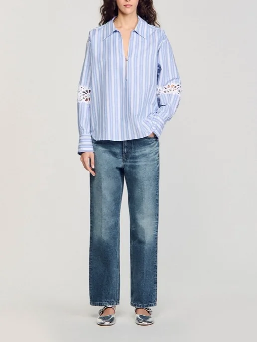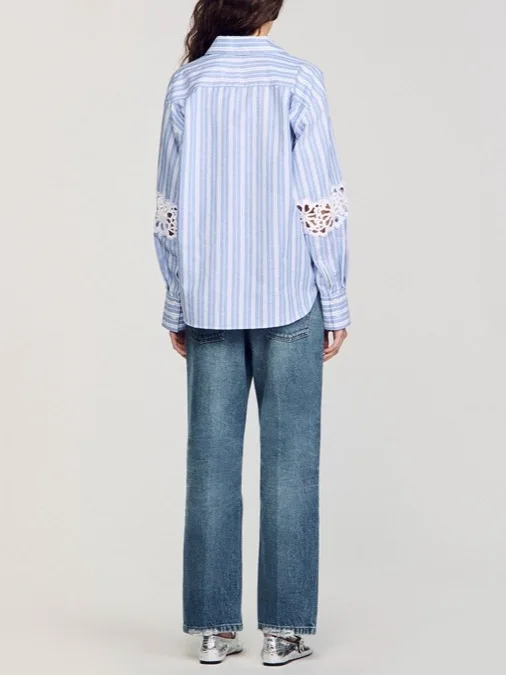 New Style Heavy Industry Vertical Stripes Hollow Hook Pattern Dropped Shoulder Sleeves V-neck Long-sleeved Shirt