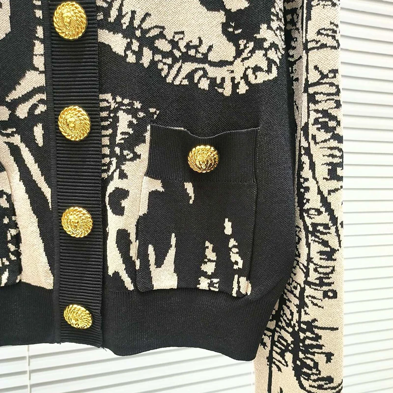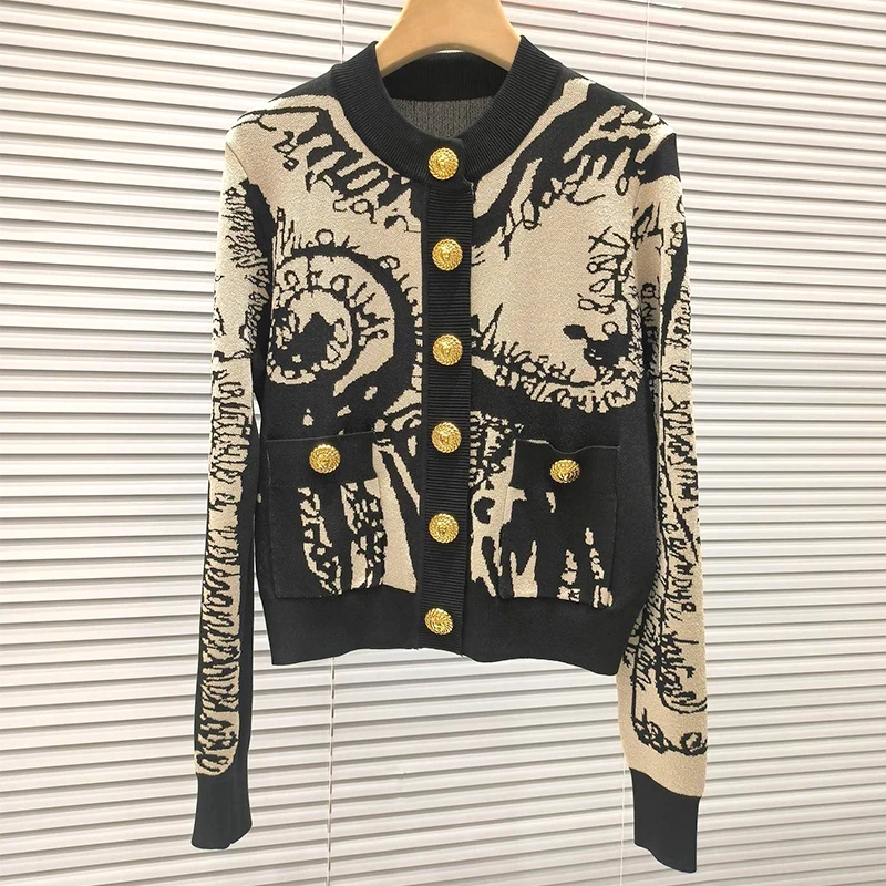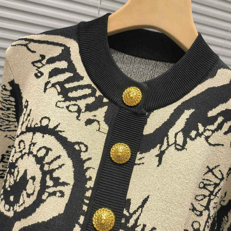 Women's Fashion Knitted Cardigan Top Jacket Crew Neck Contrast Jacquard Style with Button Decoration Long for Autumn Season