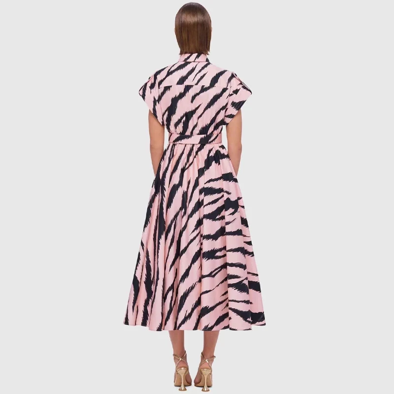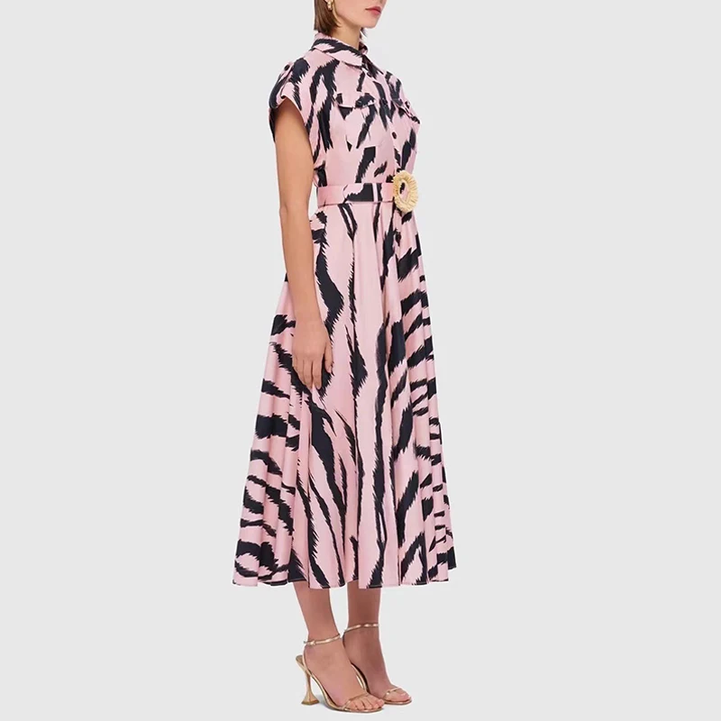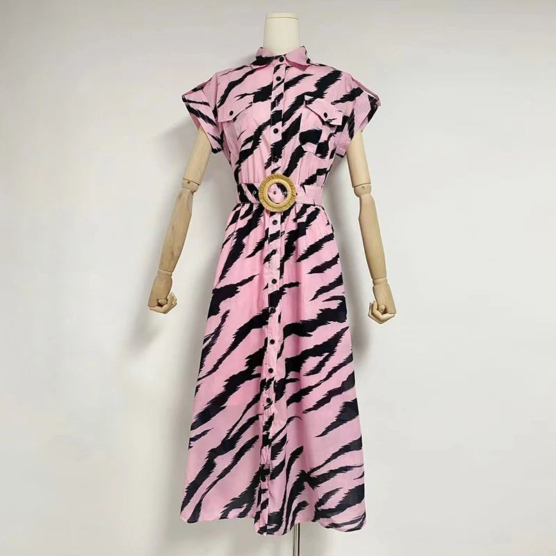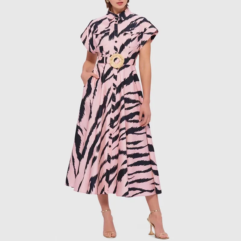 Leopard Print Short-Sleeved Single-Breasted Belt Waist Knee-Length Daily Dress for Summer Breathable Woven OEM Service Available