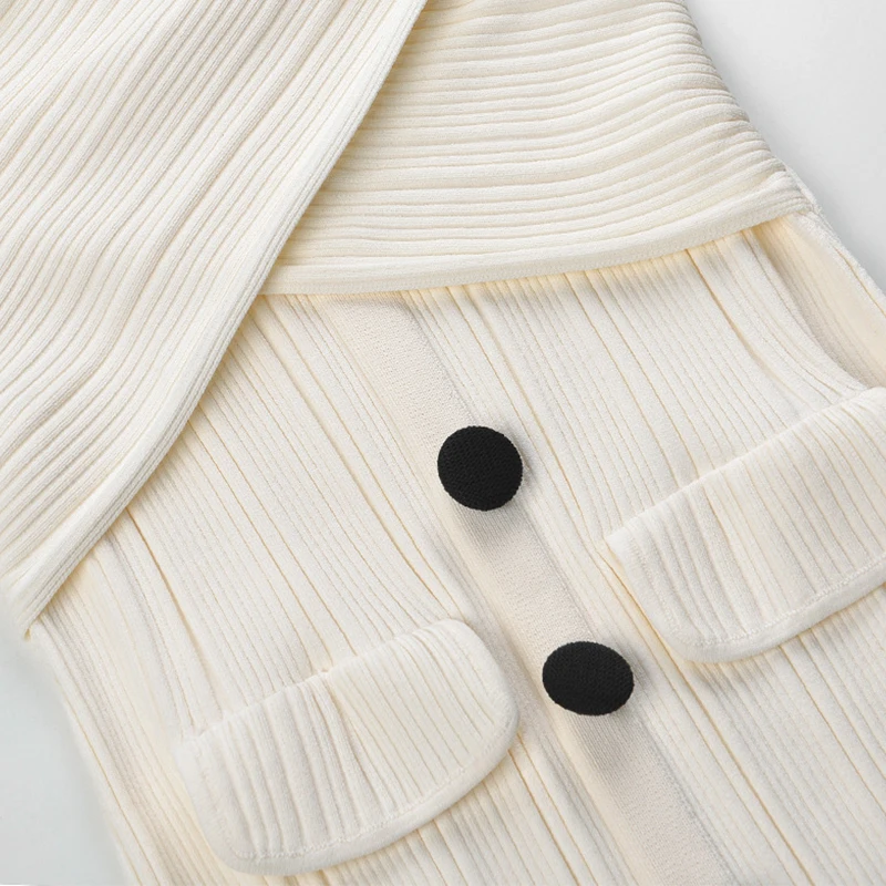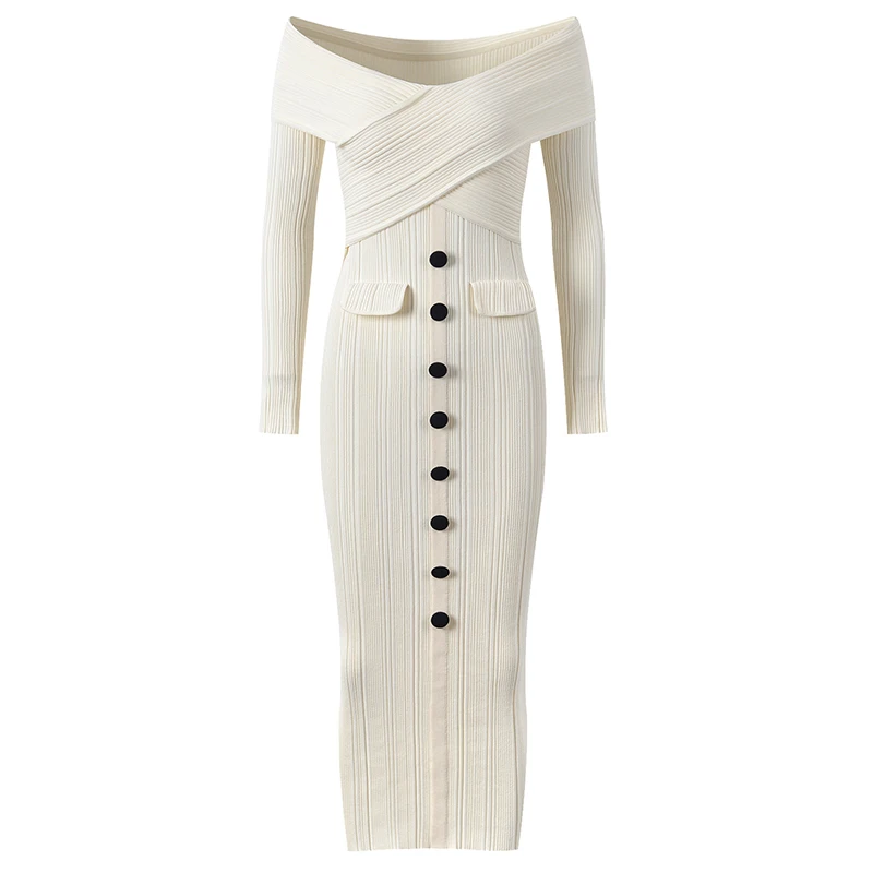 OEM/ODM Design Sense Single-Breasted White Wool Knit Dress Sexy Slim Knee-Length Solid Pattern Button for Daily Wear