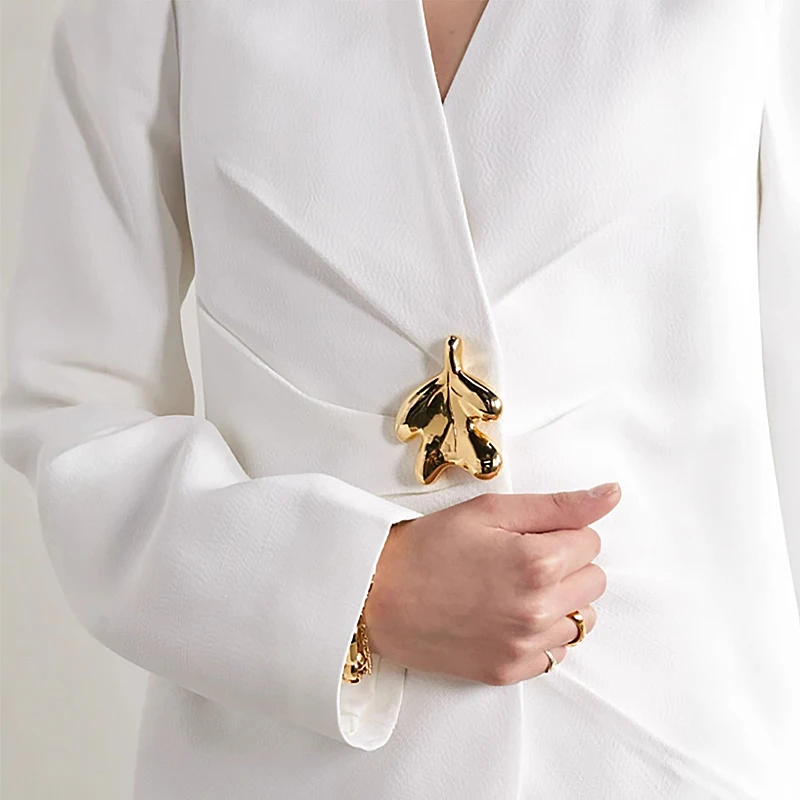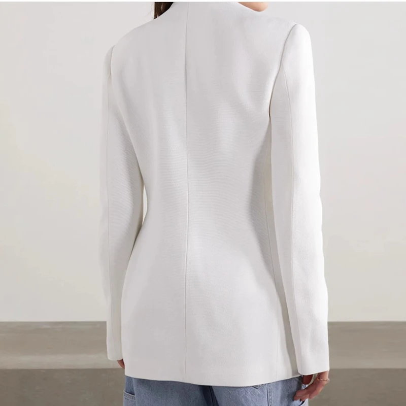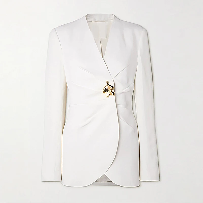 Women's White Blazer Jacket with V-Neck and Metal Buckle Waist Design Single Button Closure and Solid Pattern Woven Fabric