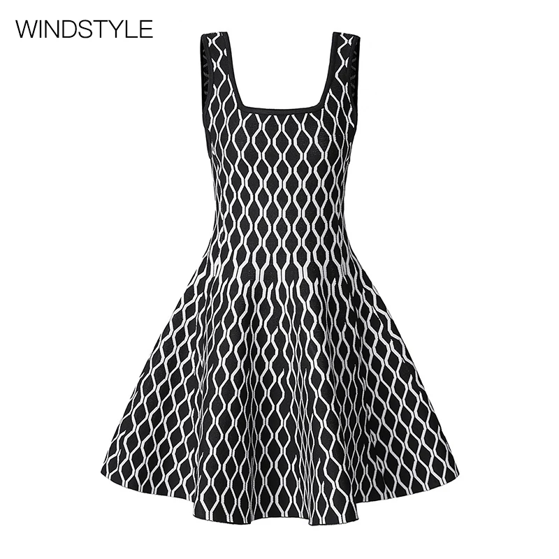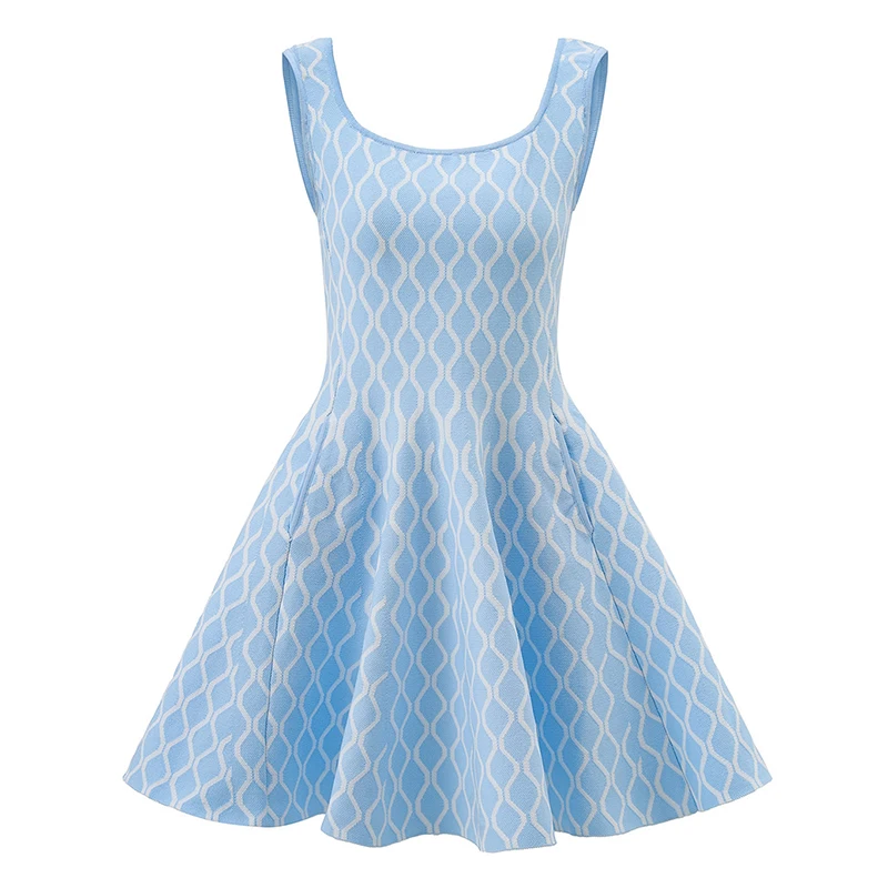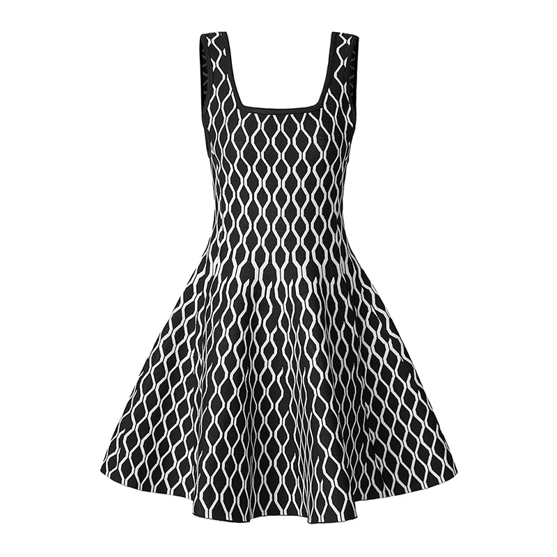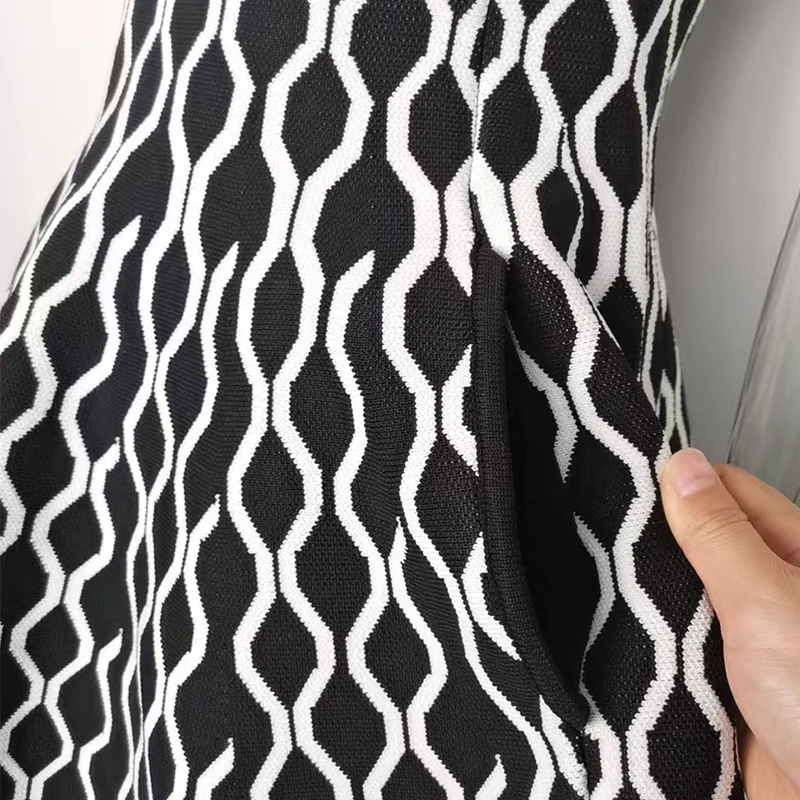 Custom Design Jacquard Dress High Waist Large Knit Skirt Square Collar Pleated Breathable Fashion for Daily Spring Summer Autumn